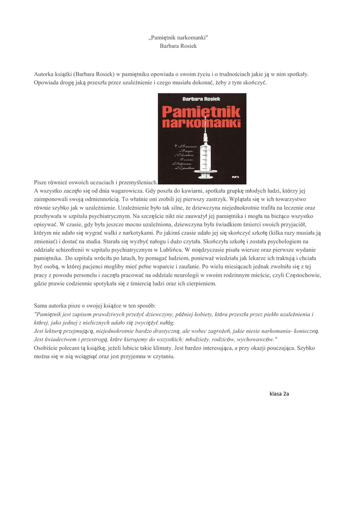 „Pamiętnik narkomanki” Barbara Rosiek Autorka książki (Barbara Rosiek) w pamiętniku opowiada o swoim życiu i o trudnościach jakie ją w nim spotkały. Opowiada drogę jaką przeszła przez uzależnienie i czego musiała dokonać, żeby z tym skończyć. Pisze również oswoich uczuciach i przemyśleniach. A wszystko zaczęło się od dnia wagarowicza. Gdy poszła do kawiarni, spotkała grupkę młodych ludzi, którzy jej zaimponowali swoją odmiennością. To właśnie oni zrobili jej pierwszy zastrzyk. Wplątała się w ich towarzystwo równie szybko jak w uzależnienie. Uzależnienie było tak silne, że dziewczyna niejednokrotnie trafiła na leczenie oraz przebywała w szpitalu psychiatrycznym. Na szczęście nikt nie zauważył jej pamiętnika i mogła na bieżąco wszystko opisywać. W czasie, gdy była jeszcze mocno uzależniona, dziewczyna była świadkiem śmierci swoich przyjaciół, którym nie udało się wygrać walki z narkotykami. Po jakimś czasie udało jej się skończyć szkołę (kilka razy musiała ją zmieniać) i dostać na studia. Starała się wyzbyć nałogu i dużo czytała. Skończyła szkołę i została psychologiem na oddziale schizofrenii w szpitalu psychiatrycznym w Lublińcu. W międzyczasie pisała wiersze oraz pierwsze wydanie pamiętnika. Do szpitala wróciła po latach, by pomagać ludziom, ponieważ wiedziała jak lekarze ich traktują i chciała być osobą, w której pacjenci mogliby mieć pełne wsparcie i zaufanie. Po wielu miesiącach jednak zwolniła się z tej pracy z powodu personelu i zaczęła pracować na oddziale neurologii w swoim rodzinnym mieście, czyli Częstochowie, gdzie prawie codziennie spotykała się z śmiercią ludzi oraz ich cierpieniem. Sama autorka pisze o swojej książce w ten sposób: "Pamiętnik jest zapisem prawdziwych przeżyć dziewczyny, później kobiety, która przeszła przez piekło uzależnienia i której, jako jednej z nielicznych udało się zwyciężyć nałóg. Jest lekturą przejmującą, niejednokrotnie bardzo drastyczną, ale wobec zagrożeń, jakie niesie narkomania- konieczną. Jest świadectwem i przestrogą, które kierujemy do wszystkich: młodzieży, rodziców, wychowawców." Osobiście polecam tą książkę, jeżeli lubicie takie klimaty. Jest bardzo interesująca, a przy okazji pouczająca. Szybko można się w nią wciągnąć oraz jest przyjemna w czytaniu. klasa 2a