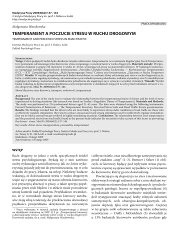 Medycyna Pracy 2009;60(2):137 – 144 © Instytut Medycyny Pracy im. prof. J. Nofera w Łodzi http://medpr.imp.lodz.pl PRACA ORYGINALNA Małgorzata Waszkowska TEMPERAMENT A POCZUCIE STRESU W RUCHU DROGOWYM TEMPERAMENT AND PERCEIVED STRESS IN ROAD TRAFFIC Instytut Medycyny Pracy im. prof. J. Nofera, Łódź Zakład Psychologii Pracy Streszczenie Wstęp: Celem podjętych badań było określenie związku właściwości temperamentu (w rozumieniu Regulacyjnej Teorii Temperamentu) z poziomem odczuwanego przez kierowców stresu związanego z uczestnictwem w ruchu drogowym. Materiał i metody: Przeprowadzono badania w grupie 214 mężczyzn w wieku 21–65 lat, wykonujących pracę na stanowisku kierowcy. W badaniach zastosowano następujące techniki diagnostyczne: kwestionariusz „Formalna Charakterystyka Zachowania — Kwestionariusz Temperamentu (FCZ — KT)” Zawadzkiego i Strelaua, „Skala Spostrzeganego Stresu” Cohena oraz kwestionariusz „Zdarzenia w Ruchu Drogowym (ZRD)”. Wyniki: W wyniku przeprowadzonych badań stwierdzono, że osobami silniej odczuwającymi stres w ruchu drogowym są te, które: a) efektywnie regulują stymulację, ale nastawione są na rozładowywanie pobudzenia, unikanie stymulacji, oraz b) nieefektywnie regulujące stymulację, nastawione na rozładowanie pobudzenia, ale angażujące się w sytuacje o wysokiej stymulacji. Wnioski: Wyniki badań wskazują na konieczność uwzględniania oceny temperamentu w działaniach mających na celu przeciwdziałanie stresowi w ruchu drogowym. Med. Pr. 2009;60(2):137–144 ��������������������������� Słowa kluczowe: stres kierowcy, transport, osobowość, temperament Abstract Background: The aim of the study was to evaluate the relationship between the temperamental traits of drivers and the level of stress experienced in driving situations (the research was based on Strelau`s Regulative Theory of Temperament). Materials and Methods: The study was performed on 214 professional drivers aged 21–65 years. The data were obtained using the following instruments: Formal Characteristics of Behaviour — The Temperament Inventory, Perceived Stress Scale and Road Traffic Events questionnaires. Results: The findings revealed that the drivers who are more likely to experience stress under conditions of road traffic are those who a) effectively regulate stimulation: they tend to reduce arousal and avoid strong stimulation and b) ineffectively regulate stimulation: they try to reduce arousal but get involved in highly stimulating situations. Conclusions: The relationship between one’s temperament and the perceived stress from road traffic found in the present study indicates the necessity to take account of this factor in preventing the drivers` stress. Med Pr 2009;60(2):137–144 Key words: driver stress, transportation, personality, temperament Adres autorki: Zakład Psychologii Pracy, Instytut Medycyny Pracy im. prof. J. Nofera, św. Teresy 8, 91-348 Łódź, e-mail: [email protected] Nadesłano: 2 lutego 2009 Zatwierdzono: 18 lutego 2009 WSTĘP Ruch drogowy to jedno z wielu specyficznych źródeł stresu psychologicznego. Stykają się z nim zarówno osoby wykonujące zawód kierowcy, jak i te, które wykorzystują pojazdy jedynie do przemieszczania, np. w celu dojazdu do pracy, lekarza, na urlop. Niektórzy badacze wskazują, że doświadczanie stresu w ruchu drogowym wiąże się z pogarszaniem się stanu zdrowia kierowców, jest przyczyną absencji w pracy, a także sprzyja popełnianiu przez nich błędów i w efekcie może powodować utratę kontroli nad pojazdem. Przykładowo stwierdzono, że w warunkach dużego stresu kierowcy autobusów mają silną tendencję do przekraczania dozwolonej prędkości, przejeżdżania skrzyżowań na czerwonym * Praca wykonana w ramach zadania finansowanego z dotacji na działalność statutową nr IMP 21.2 pt. „Temperament kierowcy a doświadczanie stresu i radzenie sobie z nim w ruchu drogowym”. Kierownik zadania: dr n. med. Małgorzata Waszkowska. i żółtym świetle, oraz niecałkowitego zatrzymywania się przed znakiem „stop” (1–3). Brenner i Selzer (1) obliczyli, że kierowcy będący pod wpływem stresu pięciokrotnie częściej są sprawcami wypadków w porównaniu do kierowców, którzy go nie doświadczają. Powtarzająca się ekspozycja na stres i niestosowanie efektywnych strategii radzenia sobie z nim skutkuje występowaniem różnorodnych fizjologicznych i psychologicznych patologii. Issever ze współpracownikami (4) w badaniach kierowców autobusów miejskich stwierdził występowanie znaczącej liczby różnych zaburzeń somatycznych, cech obsesyjno-kompulsywnych, objawów depresji, lęku oraz gniewu/wrogości. Częściej w tej grupie osób odnotowywane są także zaburzenia neurotyczne — Duffy i McGoldrick (5) stwierdzili je u 13% badanych kierowców autobusów, podczas gdy 138 M. Waszkowska w populacji osób niewykonujących tego zawodu występują one u 5–10%. Jak wskazują badania, poziom spostrzeganego stresu w ruchu drogowym zależy od takich czynników, jak płeć, wiek, doświadczenie w kierowaniu pojazdami, nasilenie stresu związanego z innymi wydarzeniami życiowymi (stan stresu), właściwości osobowości (np. poziom cechy lęku, neurotyzm, ekstrawersja, treści zawarte w schematach poznawczych i ich strukturach) (6,7). Jako bardziej stresujące zdarzenia w ruchu drogowym spostrzegają kobiety, starsi kierowcy i osoby będące w stanie stresu. Badania nad temperamentalnymi uwarunkowaniami stresu wskazują, że kierowcy ekstrawertyczni, mający silną potrzebę poszukiwania wrażeń, mogą być bardziej wrażliwi na warunki monotonii i dlatego są bardziej podatni na popełnianie błędów wynikających ze zmęczenia. Osoby neurotyczne zaś częściej przeżywają przykre emocje związane ze stresem i stosują dezadaptacyjne sposoby radzenia sobie z nim (8). Prowadzone dotychczas badania