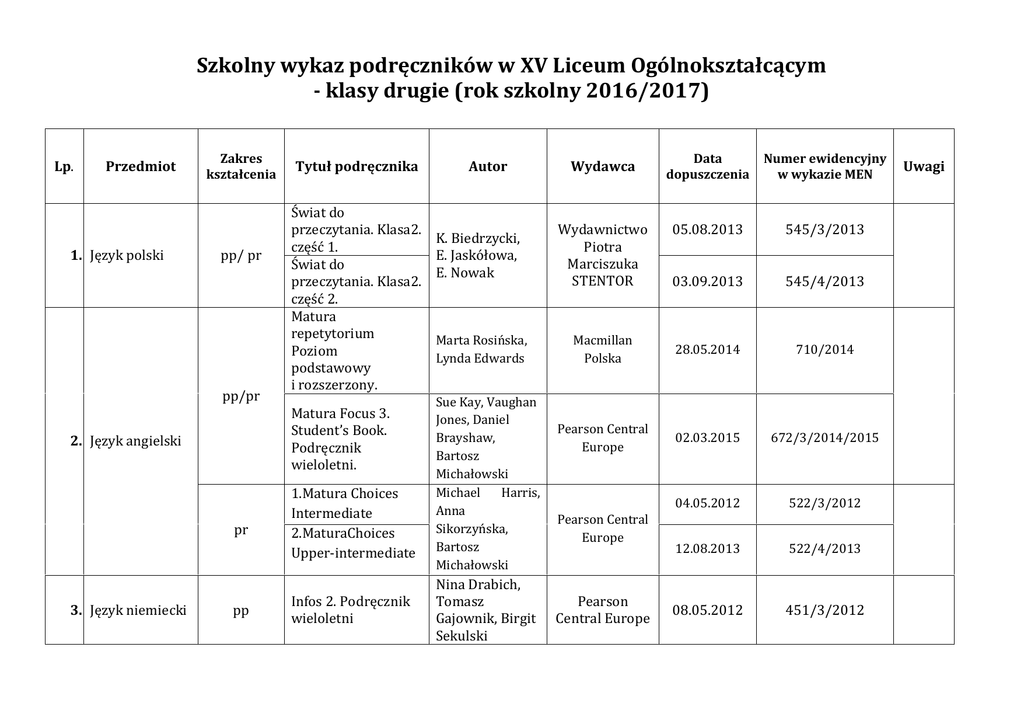 Szkolny wykaz podręczników w XV Liceum Ogólnokształcącym - klasy drugie (rok szkolny 2016/2017) Lp. Przedmiot 1. Język polski Zakres kształcenia pp/ pr pp/pr Świat do przeczytania. Klasa2. część 1. Świat do przeczytania. Klasa2. część 2. Matura repetytorium Poziom podstawowy i rozszerzony. Matura Focus 3. Student’s Book. Podręcznik wieloletni. 2. Język angielski pr 3. Język niemiecki Tytuł podręcznika pp 1.Matura Choices Intermediate 2.MaturaChoices Upper-intermediate Infos 2. Podręcznik wieloletni Autor Wydawca Data dopuszczenia Numer ewidencyjny w wykazie MEN 05.08.2013 545/3/2013 03.09.2013 545/4/2013 K. Biedrzycki, E. Jaskółowa, E. Nowak Wydawnictwo Piotra Marciszuka STENTOR Marta Rosińska, Lynda Edwards Macmillan Polska 28.05.2014 710/2014 Pearson Central Europe 02.03.2015 672/3/2014/2015 04.05.2012 522/3/2012 12.08.2013 522/4/2013 08.05.2012 451/3/2012 Sue Kay, Vaughan Jones, Daniel Brayshaw, Bartosz Michałowski Michael Harris, Anna Sikorzyńska, Bartosz Michałowski Nina Drabich, Tomasz Gajownik, Birgit Sekulski Pearson Central Europe Pearson Central Europe Uwagi En Action! 1 4. Język francuski pp En Action!2 5. Historia 6. Wiedza o społeczeństwie pr pr pp 7. Matematyka pr Zrozumieć przeszłość Starożytność i średniowiecze Podręcznik dla liceum ogólnokształcącego i technikum Zakres rozszerzony, cz.1 Zrozumieć przeszłość. Dzieje nowożytne. Podręcznik dla liceum i technikum. Zakres rozszerzony. Cz.2. W centrum uwagi. Podręcznik dla liceum ogólnokształcącego i technikum Zakres rozszerzony, cz. 1. W centrum uwagi Maturalne karty pracy. Zakres rozszerzony, cz. 1. Matematyka II. Podręcznik dla liceum i technikum. Zakres podstawowy Matematyka II. Podręcznik dla liceum i technikum. Fabienne Gallon, Céline Himber F. Gallon C. Himber Hachette Polska Sp. z o.o. Ryszard Kulesza, Krzysztof Kowalewski 21.04.2015 745/1/2015 04.03.2016 745/2/2016 25.04.2013 642/1/2013 04.02.2014 642/2/2014 14.12.2012 630/1/2012 30.07.2013 606/2/2013 17.09.2014 628/2/2014 Nowa Era Paweł Klint Piotr Galik Arkadiusz Janicki Justyna Kięczkowska Mariusz Menz Małgorzata Dobrowolska, Marcin Karpiński, Jacek Lech Małgorzata Dobrowolska, Marcin Nowa Era Gdańskie Wydawnictwo Oświatowe M. Dobrowolska Sp. j. Zakres rozszerzony Oblicza geografii 1. Podręcznik dla liceum i technikum Zakres rozszerzony. Maturalne karty pracy 8. Geografia 9. Chemia pr pr Oblicza geografii 2. Podręcznik dla liceum i technikum. Zakres rozszerzony Maturalne karty pracy. Zakres rozszerzony. To jest chemia 1. Chemia ogólna i nieorganiczna Zakres rozszerzony Zbiór zadań z chemii Do liceów i techników. Zakres rozszerzony. Nowe wydanie. Biologia na czasie 1 10. Biologia pr Biologia na czasie 2 Karpiński, Jacek Lech Roman Malarz Marek Więckowski Nowa Era 26.03.2012 501/1/2012/2015 Nowa Era 27.02.2013 501/2/2013 Nowa Era 20.04.2012 528/1/2012 Nowa Era 30.05.2012 564/1/2012 Nowa Era 27.02.2013 564/2/2013 K.Cichoszewski, E. Grząba, A. Karaś i inni Tomasz Rachwał A Karaś, Monika Nikołajew – Banaszewska Maria Litwin, Szarota StykaWlazło, Joanna Szymońska Krzysztof Pazdro Anna RolaNoworyta M. Guzik, E. Jastrzębska, R. Kozik i inni F. Dubert, R. Kozik, S. Krawczyk i inni Oficyna Wydawnicza Krzysztof Pazdro 11. Religia 12. Przyroda Historia 13. i społeczeństwo Moje miejsce w świecie J. Szpet, D. Jackowiak Przyroda cz. 1 i 2 LO i technikum +Karty pracy ucznia Poznać przeszłość. Ojczysty panteon i ojczyste spory. M. Galikowski R. Hassa M. Kaczmarczyk Poznać przeszłość. Rządzący i rządzenia Iwona Janicka Św. Wojciech 09.06. 2010 AZ-4-01/10 26.06.2013 658/1/e/2013 17.09.2013 658/2/e/2013 27.06.2013 659/1/2013 29.01.2014 659/2/2013 Nowa Era Tomasz Maćkowski Nowa Era