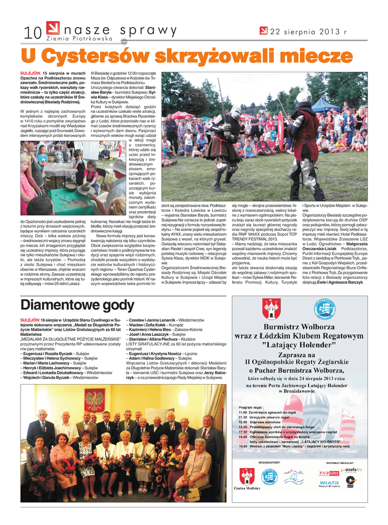 10 n a s z e s p r a w y U Cystersów skrzyżowali miecze 22 sierpnia 2013 r Ziemia Piotrkowska SULEJÓW. 15 sierpnia w murach Opactwa na Podklasztorzu znowu zawrzało. Średniowieczne jadło, pokazy walk rycerskich, warsztaty rzemieślnicze – to tylko część atrakcji, które czekały na uczestników III Średniowiecznej Biesiady Rodzinnej. W jednym z najlepiej zachowanych kompleksów obronnych Europy w 1410 roku o pomyślne zwycięstwo nad Krzyżakami modlił się Władysław Jagiełło, ruszając pod Grunwald.Dowodem intensywnych próśb kierowanych do Opatrzności jest uszkodzenie jednej z kolumn przy drzwiach wejściowych, będące wynikiem ostrzenia rycerskich mieczy. Dziś – kilka wieków później – średniowieczni wojacy znowu sięgnęli po miecze. Ich zmaganiom przyglądali się uczestnicy imprezy, która przyciąga nie tylko mieszkańców Sulejowa i okolic, ale także turystów: – Pochodzę z okolic Sulejowa i choć mieszkam obecnie w Warszawie, chętnie wracam w rodzinne strony. Zawsze uczestniczę w imprezach kulturalnych, które się tutaj odbywają – mówi 25-letni Łukasz. III Biesiadę o godzinie 12.00 rozpoczęła Msza św.Odpustowa w Kościele św.Tomasz Becket'a na Podklasztorzu. Uroczystego otwarcia dokonali: Stanisław Baryła – burmistrz Sulejowa i Sylwia Klass – dyrektor Miejskiego Ośrodka Kultury w Sulejowie. Przez kolejnych dziesięć godzin na uczestników czekało wiele atrakcji, głównie za sprawą Bractwa Rycerskiego z Łodzi, które przeniosło nas w klimat czasów średniowiecznych rycerzy i wytwornych dam dworu. Pasjonaci mrocznych wieków mogli wziąć udział w lekcji magii u czarownicy, której udało się uciec przed Inkwizycją i średniowiecznym stosem, emocjonujących pokazach walk rycerskich, pouczającym kursie wybijania monety, zakończonym wydaniem certyfikatu oraz prezentacji tajników diety kulinarnej. Narzekać nie mogli także bibliofile, którzy mieli okazję przejrzeć średniowieczne księgi. Nowa formuła imprezy jest konsekwencją nałożenia się kilku czynników. Obok zwiększenia względów bezpieczeństwa i troski o podtrzymywanie tradycji oraz spajanie więzi rodzinnych, chodziło przede wszystkim o wydobycie walorów kulturalnych i historycznych regionu: – Teren Opactwa Cysterskiego wprowadziliśmy do rejestru prezydenckiego jako pomnik historii.W naszym województwie takie pomniki hi- storii są zarejestrowane dwa: Podklasztorze i Katedra Łowicka w Łowiczu – wyjaśnia Stanisław Baryła, burmistrz Sulejowa.Nie oznacza to jednak zupełnej rezygnacji z formuły rozrywkowej festynu: – Na scenie pojawił się zespół lokalny AYAX, znany wielu mieszkańcom Sulejowa z wesel, na których grywał. Gwiazdą wieczoru natomiast był Sebastian Riedel i zespół Cree, syn legendy polskiej muzyki rockowej – relacjonuje Sylwia Klass, dyrektor MOK w Sulejowie. Organizatorami Średniowiecznej Biesiady Rodzinnej są: Miejski Ośrodek Kultury w Sulejowie i Urząd Miejski w Sulejowie.Impreza łączy – zdawać by Diamentowe gody SULEJÓW. 16 sierpia w Urzędzie Stanu Cywilnego w Sulejowie dokonano wręczenia „Medali za Długoletnie Pożycie Małżeńskie” oraz Listów Gratulacyjnych za 60 lat Małżeństwa „MEDALAMI ZA DŁUGOLETNIE POŻYCIE MAŁŻEŃSKIE” przyznanymi przez Prezydenta RP udekorowane zostały n/w pary małżeńskie: – Eugeniusz i Rozalia Byczek – Sulejów – Mieczysław i Helena Sychowscy – Sulejów – Marian i Maria Lachowscy – Sulejów – Henryk i Elżbieta Joachimowscy – Sulejów – Edward i Leokadia Dziubałtowscy – Włodzimierzów – Wojciech i Danuta Byczek – Włodzimierzów – Czesław i Janina Lenarcik – Włodzimierzów – Wacław i Zofia Kołek – Kurnędz – Kazimierz i Helena Bies – Zalesice-Kolonia – Józef i Anna Laszczyk – Sulejów – Stanisław i Albina Piechura – Kłudzice LISTY GRATULACYJNE za 60 lat pożycia małżeńskiego otrzymali: – Eugeniusz i Krystyna Nowicz – Łęczno – Adam i Halina Godlewscy – Sulejów. Wręczenia Listów Gratulacyjnych i dekoracji Medalami za Długoletnie Pożycie Małżeńskie dokonali: Stanisław Baryła – kierownik USC i burmistrz Sulejowa oraz Jerzy Balcerzyk – z-ca przewodniczącego Rady Miejskiej w Sulejowie. się mogło – skrajne przeciwieństwa: historię z nowoczesnością, walory lokalne z wymiarem ogólnopolskim. Na placu boju zaraz obok rycerskich potyczek znalazł się laureat głównej nagrody oraz nagrody specjalnej słuchaczy radia RMF MAXX podczas Sopot TOP TRENDY FESTIWAL 2013. – Mamy nadzieję, że taka mieszanka pozwali każdemu uczestnikowi znaleźć wspólny mianownik imprezy. Chcemy udowodnić, że nauka historii może być przyjemna, ale także stwarza doskonałą okazję do wspólnej zabawy i rodzinnych spotkań – mówi Sylwia Miller, kierownik Referatu Promocji, Kultury, Turystyki i Sportu w Urzędzie Miejskim w Sulejowie. Organizatorzy Biesiady szczególne podziękowania kierują do druhów OSP oraz policjantów, którzy pomogli zabezpieczyć ww. imprezę. Swój wkład w tą imprezę mieli również: Hotel Podklasztorze, Wojewódzkie Zrzeszenie LSZ w Łodzi, Ogrodnictwo – Małgorzata Owczarska-Lisiak Podklasztorze, Punkt Informacji Europejskiej Europe Direct z siedzibą w Piotrkowie Tryb., panie z Kół Gospodyń Wiejskich, przedstawicielki Regionalnego Biura Oriflame z Piotrkowa Tryb. Za przygotowanie foto-relacji z Biesiady organizatorzy dziękują Ewie i Agnieszce Barczyk.