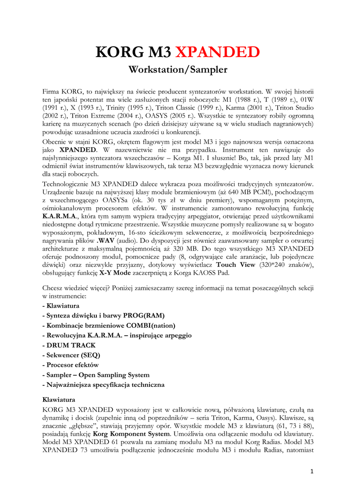 KORG M3 XPANDED Workstation/Sampler Firma KORG, to największy na świecie producent syntezatorów workstation. W swojej historii ten japoński potentat ma wiele zasłużonych stacji roboczych: M1 (1988 r.), T (1989 r.), 01W (1991 r.), X (1993 r.), Trinity (1995 r.), Triton Classic (1999 r.), Karma (2001 r.), Triton Studio (2002 r.), Triton Extreme (2004 r.), OASYS (2005 r.). Wszystkie te syntezatory robiły ogromną karierę na muzycznych scenach (po dzień dzisiejszy używane są w wielu studiach nagraniowych) powodując uzasadnione uczucia zazdrości u konkurencji. Obecnie w stajni KORG, okrętem flagowym jest model M3 i jego najnowsza wersja oznaczona jako XPANDED. W nazewnictwie nie ma przypadku. Instrument ten nawiązuje do najsłynniejszego syntezatora wszechczasów – Korga M1. I słusznie! Bo, tak, jak przed laty M1 odmienił świat instrumentów klawiszowych, tak teraz M3 bezwzględnie wyznacza nowy kierunek dla stacji roboczych. Technologicznie M3 XPANDED dalece wykracza poza możliwości tradycyjnych syntezatorów. Urządzenie bazuje na najwyższej klasy module brzmieniowym (aż 640 MB PCM!), pochodzącym z wszechmogącego OASYSa (ok. 30 tys zł w dniu premiery), wspomaganym potężnym, ośmiokanałowym procesorem efektów. W instrumencie zamontowano rewolucyjną funkcję K.A.R.M.A., która tym samym wypiera tradycyjny arpeggiator, otwierając przed użytkownikami niedostępne dotąd rytmiczne przestrzenie. Wszystkie muzyczne pomysły realizowane są w bogato wyposażonym, pokładowym, 16-sto ścieżkowym sekwencerze, z możliwością bezpośredniego nagrywania plików .WAV (audio). Do dyspozycji jest również zaawansowany sampler o otwartej architekturze z maksymalną pojemnością aż 320 MB. Do tego wszystkiego M3 XPANDED oferuje podnoszony moduł, pomocnicze pady (8, odgrywające całe aranżacje, lub pojedyncze dźwięki) oraz niezwykle przyjazny, dotykowy wyświetlacz Touch View (320*240 znaków), obsługujący funkcję X-Y Mode zaczerpniętą z Korga KAOSS Pad. Chcesz wiedzieć więcej? Poniżej zamieszczamy szereg informacji na temat poszczególnych sekcji w instrumencie: - Klawiatura - Synteza dźwięku i barwy PROG(RAM) - Kombinacje brzmieniowe COMBI(nation) - Rewolucyjna K.A.R.M.A. – inspirujące arpeggio - DRUM TRACK - Sekwencer (SEQ) - Procesor efektów - Sampler – Open Sampling System - Najważniejsza specyfikacja techniczna Klawiatura KORG M3 XPANDED wyposażony jest w całkowicie nową, półważoną klawiaturę, czułą na dynamikę i docisk (zupełnie inną od poprzedników – seria Triton, Karma, Oasys). Klawisze, są znacznie „głębsze”, stawiają przyjemny opór. Wszystkie modele M3 z klawiaturą (61, 73 i 88), posiadają funkcję Korg Komponent System. Umożliwia ona odłączenie modułu od klawiatury. Model M3 XPANDED 61 pozwala na zamianę modułu M3 na moduł Korg Radias. Model M3 XPANDED 73 umożliwia podłączenie jednocześnie modułu M3 i modułu Radias, natomiast 1 model M3 XPANDED 88 pozwala na montaż dwóch modułów M3, lub modułu M3 i modułu Radias. 2 Synteza dźwięku i barwy – PROG(RAM) Korg M3 XPANDED bazuje na nowej syntezie EDS (Enhanced Definition Synthesis), po raz pierwszy zastosowanej w najpotężniejszym syntezatorze ostatnich lat – w Korgu OASYS (2005 r.). Instrument zawiera blisko 700 MB próbek, w skład których wchodzą: - 1077 multisampli ROM - 1609 sampli perkusyjnych ROM - 59 multisampli Brass and Woodwinds 1, EX-USB-PCM01 (128 MB) - 47 multisampli Brass and Woodwinds 2, EX-USB-PCM02 (128 MB) - 10 multisampli Stereo Grand Piano, EX-USB-PCM03 (128 MB) - 4-warstwowa próbka V1 Stereo Piano, EX-USB-PCM4 (28 MB) M3 XPANDED brzmi niewiarygodnie. Na pokładzie mamy pokaźną kolekcję barw żywcem wziętych z flagowego modelu Korga – OASYS. Znajdziemy również propozycje z bardzo popularnego i zasłużonego Tritona Extreme oraz z Tritona Studio. Instrument oferuje szereg nowych, znakomitych programów. Producent sukcesywnie udostępnia coraz to nowsze programy. M3 XPANDED zaopatrzony jest w 14 stałych folderów brzmień (PROG, I-A…I-G, oraz UA…U-G) o łącznej ilości 1664 barw (+ 256 programów GM2 i 9 zestawów perkusyjnych GM2). Instrument oferuje maksymalną ilość 144 zestawów perkusyjnych, w pełni edytowalnych. Jest 3 to absolutny nr 1 pod względem ilości miejsca w instrumencie. M3 jest najlepszym syntezatorem workstation na świecie, tak więc oferuje całą gamę brzmień w najwyższej jakości. W instrumencie zapisanych jest 18 banków brzmień: 1. 00-Keyboard 2. 01-Organ 3. 02-Bell/Mallet 4. 03-Strings 5. 04-Vocal/Airy 6. 05-Brass 7. 06-Woodwind/Reed 8. 07-Guitar/Plucked 9. 08-Bass/SynthBass 10. 09-SlowSynth 11. 10-FastSynth 12. 11-LeadSynth 13. 12-MotionSynth 14. 13-SFX 15. 14-Short Decay/Hit 16. 15-Drums 17. 16-User 18. 17-User M3 XPANDED zaopatrzony jest w bardzo przydatną funkcję Jump to Sub. Umożliwia ona podzielenie banku na podgrupy, co zdecydowanie ułatwia wyszukiwanie konkretnych barw (np. bank 00-Keyboard podzielony jest na: 00-A.Piano, 01-Synth E.Piano, 02-Real E.Piano, 03Clav/Harpsi; a bank 09-SlowSynth podzielony jest na: 00-Bright, 01-Dark, 02-Sweep). Wszystkie brzmienia w M3 XPANDED są w pełni edytowalne (nie licząc GM). W instrumencie mamy ogromny zestaw narzędzi potrzebnych do tworzenia nowych ustawień, a najważniejsze z nich, to: Program Basic, OSC Basic, Pitch EG, Filter Routing, LFO, Amp/EQ, AMS/Common Key Track oraz obie sekcje procesora efektów IFX i TFX. 4 5 Kombinacje brzmieniowe COMBI(nation) Słynna struktura brzmień Combination stworzona została w 1988 r., na potrzeby syntezatora Korg M1. W 2005 r., całkowicie zreformowany tryb COMBI ukazał się Korgu OASYS. Z kolei w M3 XPANDED zamontowana jest jego najnowsza i najmocniejsza wersja. Czym jest tryb COMBI? Jest to wspaniała funkcja umożliwiająca łączenie w dowolny sposób maksymalnie 16. brzmień na raz, w czasie rzeczywistym, w jednej kombinacji, w całkowicie dowolnej konfiguracji na klawiatu