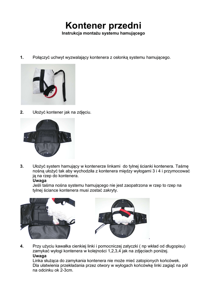 Kontener przedni Instrukcja montażu systemu hamującego 1. Połączyć uchwyt wyzwalający kontenera z osłonką systemu hamującego. 2. Ułożyć kontener jak na zdjęciu. 3. Ułożyć system hamujący w kontenerze linkami do tylnej ścianki kontenera. Taśmę nośną ułożyć tak aby wychodziła z kontenera między wyłogami 3 i 4 i przymocować ją na rzep do kontenera. Uwaga Jeśli taśma nośna systemu hamującego nie jest zaopatrzona w rzep to rzep na tylnej ściance kontenera musi zostać zakryty. 4. Przy użyciu kawałka cienkiej linki i pomocniczej zatyczki ( np wkład od długopisu) zamykać wyłogi kontenera w kolejności 1,2,3,4 jak na zdjęciach poniżej. Uwaga Linka służąca do zamykania kontenera nie może mieć zatopionych końcówek. Dla ułatwienia przekładania przez otwory w wyłogach końcówkę linki zagiąć na pół na odcinku ok 2-3cm. 1 2 3 4 5. Zatyczkę pomocniczą zastąpić zawleczką uchwytu wyzwalającego. 6. Linkę wsunąć pod zawleczkę i delikatnie wyciągnąć tak aby nie uszkodzić pętelki na wyłogu nr 1. 1 2 7. Zamocować uchwyt wyzwalający do wyłogów nr 3 i 4. 8. Wsunąć nadmiar wyłogów nr 1 i 2 pod wyłogi nr 3 i 4 i uformować kontener. 9. Połączyć taśmę nośną systemu hamującego z v-taśmą uprzęży. Miejsce połączenia taśm unieruchomić przez owinięcie taśmą izolacyjną. Uwaga Łączenie taśmy nośnej systemu hamującego z v-taśmą uprzęży musi znajdować się dokładnie w połowie jej długości tzn. , że pod obciążeniem oba jej końce muszą być równomiernie naprężone. 10. Zamontować kontener do uprzęży przypinając go w trzech punktach. Zdjęcie poniżej przedstawia sposób montażu kontenera do uprzęży PPG - do taśm nośnych i taśmy piersiowej. W uprzęży do latania swobodnego kontener montuje się do karabinków głównych i taśmy piersiowej. Uwaga Jeśli montujesz system hamujący po raz pierwszy niezbędne będzie wykonanie próby otwarcia kontenera aby upewnić się, że został on zamknięty poprawnie i poznać siłę potrzebną do jego otwarcia. W tym celu po zamontowaniu systemu hamującego podwieś uprząż, usiądź w niej, złap za uchwyt wyzwalający i energicznie oderwij go od kontenera ruchem skierowanym pod kątem 90 stopni do kierunku lotu. Wykonując taką próbę nie należy odrzucać systemu hamującego ponieważ to spowoduje jego wypadnięcie z osłonki. Zapakuj ponownie system hamujący do kontenera. Aby uniknąć przypadkowego wypadnięcia systemu hamującego z kontenera sprawdzaj stan jego zapięcia przed każdym lotem! ScootAir ul.Konarskiego 7/ 7 85-066 Bydgoszcz www.scootair.paralotnie.pl [email protected]