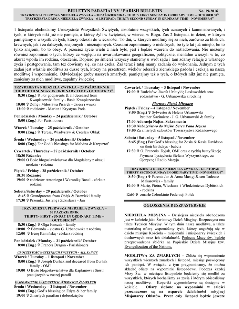 BIULETYN PARAFIALNY / PARISH BULLETIN No. 19/2016 TRZYDZIESTA PIERWSZA NIEDZIELA ZWYKŁA – 30 PAŹDZIERNIKA / THIRTY FIRST SUNDAY IN ORDINARY TIME – OCTOBER 30th TRZYDZIESTA DRUGA NIEDZIELA ZWYKŁA – 6 LISTOPAD / THIRTY SECOND SUNDAY IN ORDINARY TIME – NOVEMBER 6th 1 listopada obchodzimy Uroczystość Wszystkich Świętych, absolutnie wszystkich, tych uznanych i kanonizowanych, i tych, o których nikt już nie pamięta, a którzy żyli w świętości, w wierze, w Bogu. Zaś 2 listopada to dzień, w którym pamiętamy o wszystkich tych, którzy odeszli do wieczności. To dni, w których modlimy się za nich, zarówno za bliskich, krewnych, jak i za dalszych, znajomych i nieznajomych. Czasami zapominamy o niektórych, bo tyle lat już minęło, bo to tylko znajomi, bo to obcy. A przecież życie wielu z nich było, jest i będzie wzorem do naśladowania. Nie możemy również zapominać o tych, którzy ze względu na uwarunkowania geograficzne, polityczne, mentalne wierzyli w to, co akurat wpoiła im rodzina, otoczenie. Dopiero po śmierci wszyscy staniemy u wrót sądu i tam zdamy relację z własnego życia i postępowania, tam też dowiemy się, co nas czeka. Zaś teraz i tutaj mamy zadania do wykonania. Jednym z tych zadań jest właśnie modlitwa za dusze tych, którzy na przestrzeni wieków odeszli z ziemskiego padołu i czekają na naszą modlitwę i wspomnienie. Odwiedzając groby naszych zmarłych, pamiętajmy też o tych, o których nikt już nie pamięta, zanieśmy za nich modlitwę, zapalmy świeczkę. TRZYDZIESTA NIEDZIELA ZWYKŁA – 23 PAŹDZIERNIK THIRTIETH SUNDAY IN ORDINARY TIME - OCTOBER 23rd 8:30 (Eng.) For godparents & all deceased from Kwapiszewski family - Basia Kwapiszewska 10:00 Zofię i Miłosława Pisarek - dzieci i wnuki 12:00 rodziców - Marian i Krystyna Preis Poniedziałek / Monday – 24 październik / October 8:00 (Eng.) For Parishioners Wtorek / Tuesday – 25 październik / October 8:00 (Eng.) Teresa, Władysław & Czeslaw Obłąk Środa / Wednesday – 26 październik/ October 8:00 (Eng.) For God’s blessings for Malvina & Krzysztof Czwartek / Thursday – 27 październik / October 18:30 Różaniec 19:00 O Boże błogoslawieństwo dla Magdaleny z okazji urodzin - rodzina Piątek / Friday - 28 październik / October 18:30 Różaniec 19:00 rodziców Antoniego i Weronikę Banel - córka z rodziną Sobota/Saturday – 29 październik / October 8:45 Grandparents from Obłąk & Barwicki family 17:30 Przemka, Justynę i Zdzisława - Jan TRZYDZIESTA PIERWSZA NIEDZIELA ZWYKŁA – 30 PAŹDZIERNIK THIRTY- FIRST SUNDAY IN ORDINARY TIME – OCTOBER 30th 8:30 (Eng.) Olga Jonczak - family 10:00 Edmunda – siostra G. Urbanowska z rodziną 12:00 Irenę Kamińską - córka z rodziną Poniedziałek / Monday – 31 październik/ October 8:00 (Eng.) Frances Dragan - Parishioners UROCZYSTOŚĆ WSZYSTKICH ŚWIĘTYCH - ALL SAINTS Wtorek / Tuesday – 1 listopad / November 8:00 (Eng.) Joseph Durhak and deceased from Durhak family - OMI 19:00 O Boże błogosławieństwo dla Kapłanówi i Sióstr pracujacych w naszej parafii WSPOMNIENIE WSZYSTKICH WIERNYCH ZMARŁYCH Środa / Wednesday – 2 listopad / November 8:00 (Eng.) God’s blessing on Edyta & her family 19:00 Zmarłych parafian i dobrodziejów Czwartek / Thursday – 3 listopad / November 19:00 Rodziców: Józefa i Matyldę Laskowskich oraz rodzeństwo - G. Urbanowska z rodziną Pierwszy Piątek Miesiąca Piątek / Friday – 4 listopad / November 8:00 (Eng.) Sylwester & Helena Urbanowski brother Kazimierz - J. G. Urbanowski & family 17:00 Adoracja Najśw. Sakramentu 18:30 Nabożeństwo do Najśw. Serca Pana Jezusa 19:00 Za zmarłych członków Towarzystwa Różańcowego Sobota / Saturday – 5 listopad / November 8:45 (Eng.) For God’s blessing for Zosia & Kasia Davidson on their birthdays - babcia 17:30 O. Francois Dyjak, OMI oraz o rychłą beatyfikację Prymasa Tysiąclecia Stefana Wyszyńskiego, za Ojczyznę i Radio Maryja. TRZYDZIESTA DRUGA NIEDZIELA ZWYKŁA – 6 LISTOPAD THIRTY SECOND SUNDAY IN ORDINARY TIME - NOVEMBER 6th 8:30 (Eng.) Parents Jan & Anna Mastyj & son Tadeusz Makarewicz - family 10:00 Marię, Piotra, Wiesława i Włodzimierza Dybińskich - rodzina 12:00 zmarłe Członkinie Federacji Polek OGŁOSZENIA DUSZPASTERSKIE NIEDZIELA MISYJNA – Dzisiejsza niedziela obchodzona jest w kościele jako Światowy Dzień Misyjny. Rozpoczyna ona także Tydzień Misyjny. W tym dniu naszą modlitwą, a także materialną ofiarą wspomóżmy tych, którzy angażują się w dzieło misyjne Kościoła – misjonarki i misjonarzy świeckich i duchownych oraz ich działalność. Podczas Mszy św. będzie przeprowadzona zbiórka na Papieskie Dzieła Misyjne tzw. Evangelization of the Nations. MODLITWA ZA ZMARŁYCH – Zbliża się wspomnienie wszystkich wiernych zmarłych i listopad, miesiąc poświęcony ich pamięci. W związku z tym przypominamy, że można składać ofiary na wypominki listopadowe. Podczas każdej Mszy Św. w miesiącu listopadzie będziemy się modlić za wszystkich, których kochaliśmy za życia i którym obiecaliśmy naszą modlitwę. Kopertki wypominkowe są dostępne w kościele. Ofiary złożone na wypominki w całości przeznaczone są na wsparcie działalności misyjnej Misjonarzy Oblatów. Przez cały listopad będzie jeszcze możliwość zgłaszania intencji wypominkowych za naszych zmarłych. DRUGA SKŁADKA – Specjalna kolekta na ofiary huraganu w Haiti zostanie zebrana w niedzielę 30 października. W niedzielę 6 listopada na Peter’s Pence. MODLITWY ZA ZMARŁYCH Gardens of Gethsemani – w niedzielę 30 października o godz.14:00 – (po polsku) 15800 32nd Avenue, Surrey, BC, V3Z 9V1 Mountain View – w niedzielę 30 października o godz. 14:00 – (po polsku) - 5455 Fraser St, Vancouver, BC V5W 2Z3 Ocean View Funeral Chapel - w środę 2 listopada o godz.14:00 (po polsku) - 4000 Imperial Street, Burnaby, BC V5J 1A4 DOROCZNA MSZA ŚW. za zmarłych biskupów, kapłanów, zako