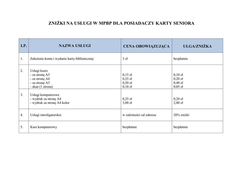 ZNIŻKI NA USŁUGI W MPBP DLA POSIADACZY KARTY SENIORA NAZWA USŁUGI LP. CENA OBOWIĄZUJĄCA ULGA/ZNIŻKA 1. Założenie konta i wydanie karty bibliotecznej 3 zł bezpłatnie 2. Usługi ksero - za stronę A5 - za stronę A4 - za stronę A3 - skan (1 strona) 0,15 zł 0,25 zł 0,50 zł 0,10 zł 0,10 zł 0,20 zł 0,40 zł 0,05 zł Usługi komputerowe - wydruk za stronę A4 - wydruk za stronę A4 kolor 0,25 zł 3,00 zł 0,20 zł 2,00 zł 4. Usługi introligatorskie w zależności od zakresu 20% zniżki 5. Kurs komputerowy bezpłatnie bezpłatnie 3.