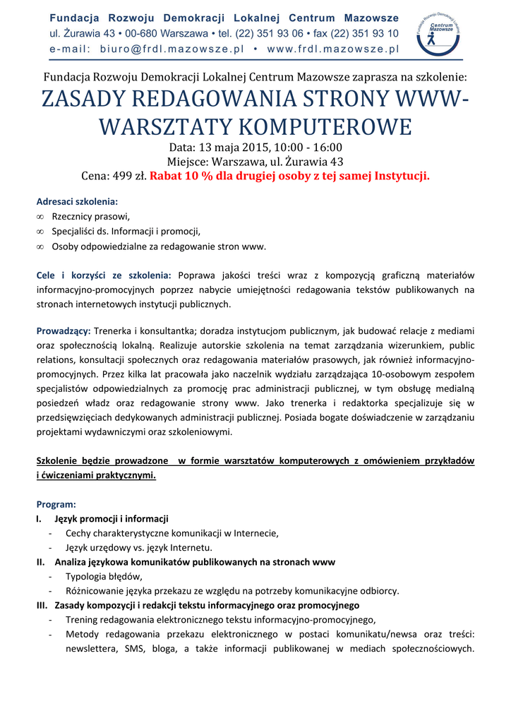Fundacja Rozwoju Demokracji Lokalnej Centrum Mazowsze zaprasza na szkolenie: ZASADY REDAGOWANIA STRONY WWWWARSZTATY KOMPUTEROWE Data: 13 maja 2015, 10:00 - 16:00 Miejsce: Warszawa, ul. Żurawia 43 Cena: 499 zł. Rabat 10 % dla drugiej osoby z tej samej Instytucji. Adresaci szkolenia: • Rzecznicy prasowi, • Specjaliści ds. Informacji i promocji, • Osoby odpowiedzialne za redagowanie stron www. Cele i korzyści ze szkolenia: Poprawa jakości treści wraz z kompozycją graficzną materiałów informacyjno-promocyjnych poprzez nabycie umiejętności redagowania tekstów publikowanych na stronach internetowych instytucji publicznych. Prowadzący: Trenerka i konsultantka; doradza instytucjom publicznym, jak budować relacje z mediami oraz społecznością lokalną. Realizuje autorskie szkolenia na temat zarządzania wizerunkiem, public relations, konsultacji społecznych oraz redagowania materiałów prasowych, jak również informacyjnopromocyjnych. Przez kilka lat pracowała jako naczelnik wydziału zarządzająca 10-osobowym zespołem specjalistów odpowiedzialnych za promocję prac administracji publicznej, w tym obsługę medialną posiedzeń władz oraz redagowanie strony www. Jako trenerka i redaktorka specjalizuje się w przedsięwzięciach dedykowanych administracji publicznej. Posiada bogate doświadczenie w zarządzaniu projektami wydawniczymi oraz szkoleniowymi. Szkolenie będzie prowadzone w formie warsztatów komputerowych z omówieniem przykładów i ćwiczeniami praktycznymi. Program: I. Język promocji i informacji - Cechy charakterystyczne komunikacji w Internecie, - Język urzędowy vs. język Internetu. II. Analiza językowa komunikatów publikowanych na stronach www - Typologia błędów, - Różnicowanie języka przekazu ze względu na potrzeby komunikacyjne odbiorcy. III. Zasady kompozycji i redakcji tekstu informacyjnego oraz promocyjnego - Trening redagowania elektronicznego tekstu informacyjno-promocyjnego, - Metody redagowania przekazu elektronicznego w postaci komunikatu/newsa oraz treści: newslettera, SMS, bloga, a także informacji publikowanej w mediach społecznościowych. ZGŁOSZENIE ZASADY REDAGOWANIA STRONY WWWWARSZTATY KOMPUTEROWE Data: 13 maja 2015, 10:00 - 16:00 Miejsce: Warszawa, ul. Żurawia 43 Cena: 499 zł. Rabat 10 % dla drugiej osoby z tej samej Instytucji. Instytucja (dane do faktury): ................................................................................................ Adres: ................................................................................................................................. NIP: ..................................................................................................................................... L.p. Imię i nazwisko Wydział tel. e-mail 1.......................................................................................................................................... 2.......................................................................................................................................... 3.......................................................................................................................................... ........................................................... podpis i pieczątka osoby delegującej Zgłoszenia prosimy przesyłać do 6 maja 2015 r. fax: (22) 351 93 10, e-mail: [email protected] lub wybrać opcje zapisu przez stronę www.frdl.mazowsze.pl Przy zgłoszeniu w ramach Forów prosimy o wpisanie w uwagach: „Zgłoszenie w ramach Forum (nazwa odpowiedniego Forum)”. Ewentualną rezygnację ze szkolenia można zgłosić najpóźniej na dwa dni robocze przed szkoleniem. W przypadku niewykorzystania zgłoszonego uczestnictwa - Urząd będzie zobowiązany do sfinansowania 60% odpłatności za uczestnictwo i materiały. FRDL zastrzega sobie prawo odwołania szkolenia. Miejsce szkolenia: Warszawa, ul. Żurawia 43. Lokalizacja 300 metrów od Metra Centrum. Cena: 499 zł netto. Rabat 10 % dla drugiej osoby z tej samej Instytucji. Istnieje możliwość pokrycia części kosztów szkolenia ze składek Forum Sekretarzy/Forum Skarbników. Zwolnienie z VAT w przypadku finansowania ze środków publicznych. W cenie materiały szkoleniowe, zaświadczenie, lunch oraz przerwy kawowe. Płatność przelewem, na podstawie faktury wystawionej w dniu szkolenia. Szkolenia realizujemy również w formie zamkniętej na terenie Instytucji. Zapytania prosimy kierować na adres e-mail: [email protected]