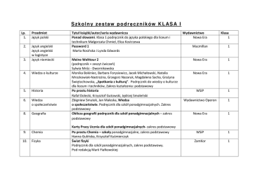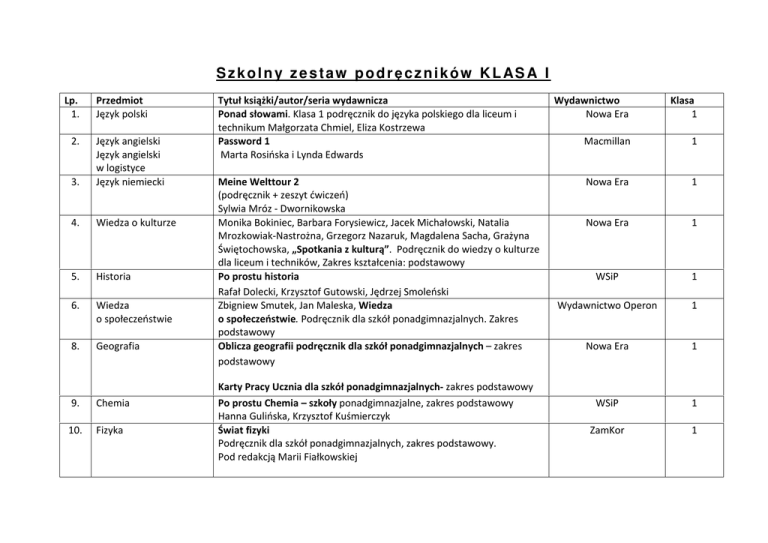 S z k o l n y z e s t a w p o d r ę c z n i k ó w K L AS A I Lp. 1. 2. Przedmiot Język polski 3. Język angielski Język angielski w logistyce Język niemiecki 4. Wiedza o kulturze 5. Historia 6. Wiedza o społeczeństwie 8. Geografia 9. Chemia 10. Fizyka Tytuł książki/autor/seria wydawnicza Ponad słowami. Klasa 1 podręcznik do języka polskiego dla liceum i technikum Małgorzata Chmiel, Eliza Kostrzewa Password 1 Marta Rosińska i Lynda Edwards Meine Welttour 2 (podręcznik + zeszyt ćwiczeń) Sylwia Mróz - Dwornikowska Monika Bokiniec, Barbara Forysiewicz, Jacek Michałowski, Natalia Mrozkowiak-Nastrożna, Grzegorz Nazaruk, Magdalena Sacha, Grażyna Świętochowska, „Spotkania z kulturą”. Podręcznik do wiedzy o kulturze dla liceum i techników, Zakres kształcenia: podstawowy Po prostu historia Rafał Dolecki, Krzysztof Gutowski, Jędrzej Smoleński Zbigniew Smutek, Jan Maleska, Wiedza o społeczeństwie. Podręcznik dla szkół ponadgimnazjalnych. Zakres podstawowy Oblicza geografii podręcznik dla szkół ponadgimnazjalnych – zakres podstawowy Karty Pracy Ucznia dla szkół ponadgimnazjalnych- zakres podstawowy Po prostu Chemia – szkoły ponadgimnazjalne, zakres podstawowy Hanna Gulińska, Krzysztof Kuśmierczyk Świat fizyki Podręcznik dla szkół ponadgimnazjalnych, zakres podstawowy. Pod redakcją Marii Fiałkowskiej Wydawnictwo Nowa Era Klasa 1 Macmillan 1 Nowa Era 1 Nowa Era 1 WSiP 1 Wydawnictwo Operon 1 Nowa Era 1 WSiP 1 ZamKor 1 11. Matematyka 12. Informatyka 13. Przedsiębiorstwo logistyczne w gospodarce rynkowej Logistyka w procesach produkcji Zapasy i magazynowanie 14. 14. 15. Dystrybucja Podręcznik do liceów i techników. Klasa 1. Zakres podstawowy i rozszerzony Marcin Kurczab, Elżbieta Kurczab, Elżbieta Świda (nieobowiązkowy) Zbiór zadań do liceów i techników. Klasa 1. Zakres podstawowy i rozszerzony. Marcin Kurczab, Elżbieta Kurczab, Elżbieta Świda (obowiązkowy) Informatyka w ćwiczeniach. Klasa 1-3, liceum i technikum. Podręcznik. Zakres podstawowy Oficyna Edukacyjna Krzysztof Pazdro 1 PWN Wydawnictwo Szkolne 1 Podstawy funkcjonowania przedsiębiorstw dla logistyków Paweł Andrzejczyk, Krzysztof Pawłowski Instytut Logistyki i Magazynowania 1 Organizacja i monitorowanie procesów produkcyjnych B.Śliwczyński, A.Koliński, P.Andrzejczyk Zapasy i magazynowanie Tom 1 podręcznik, S. Krzyżaniak, P. Cyplik Instytut Logistyki i Magazynowania Instytut Logistyki i Magazynowania 1 Zapasy i magazynowanie Tom 2 podręcznik, A. Niemczyk Organizacja i monitorowanie procesów dystrybucji B. Śliwczyński, A.Koliński Instytut Logistyki i Magazynowania Instytut Logistyki i Magazynowania 1 1