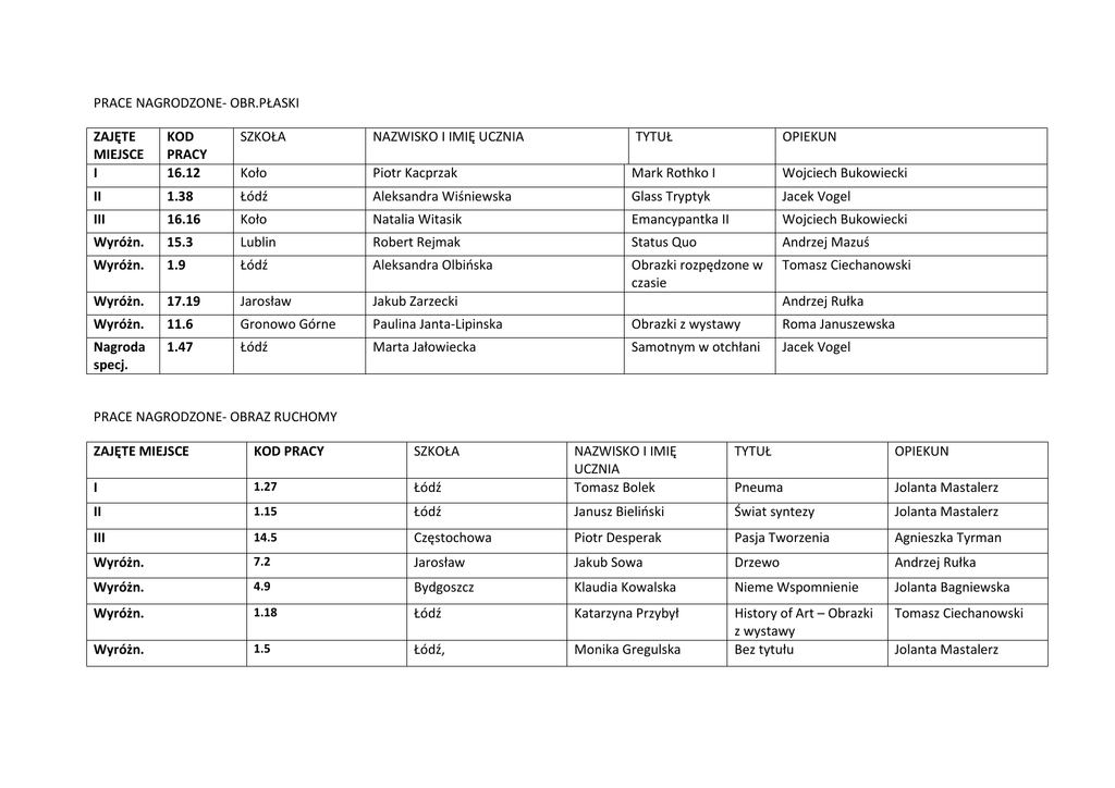 PRACE NAGRODZONE- OBR.PŁASKI ZAJĘTE MIEJSCE KOD