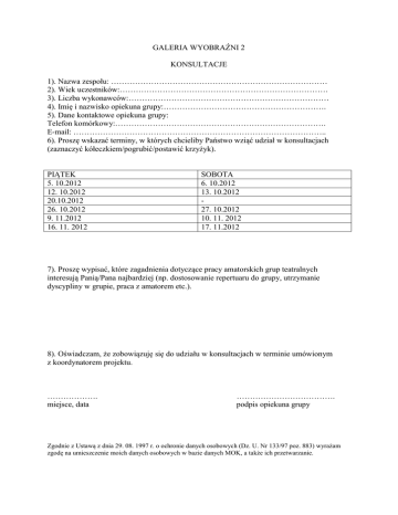 GALERIA WYOBRAŹNI 2 KONSULTACJE 1). Nazwa zespołu: ……………………………………………………………………… 2). Wiek uczestników:…………………………………………………………………… 3). Liczba wykonawców:………………………………………………………………… 4). Imię i nazwisko opiekuna grupy:……………………………………………………. 5). Dane kontaktowe opiekuna grupy: Telefon komórkowy:……………………………………………………………………. E-mail: ………………………………………………………………………………….. 6). Proszę wskazać terminy, w których chcieliby Państwo wziąć udział w konsultacjach (zaznaczyć kółeczkiem/pogrubić/postawić krzyżyk). PIĄTEK 5. 10.2012 12. 10.2012 20.10.2012 26. 10.2012 9. 11.2012 16. 11. 2012 SOBOTA 6. 10.2012 13. 10.2012 27. 10.2012 10. 11. 2012 17. 11.2012 7). Proszę wypisać, które zagadnienia dotyczące pracy amatorskich grup teatralnych interesują Panią/Pana najbardziej (np. dostosowanie repertuaru do grupy, utrzymanie dyscypliny w grupie, praca z amatorem etc.). 8). Oświadczam, że zobowiązuję się do udziału w konsultacjach w terminie umówionym z koordynatorem projektu. ………………. miejsce, data ………………………………. podpis opiekuna grupy Zgodnie z Ustawą z dnia 29. 08. 1997 r. o ochronie danych osobowych (Dz. U. Nr 133/97 poz. 883) wyrażam zgodę na umieszczenie moich danych osobowych w bazie danych MOK, a także ich przetwarzanie.