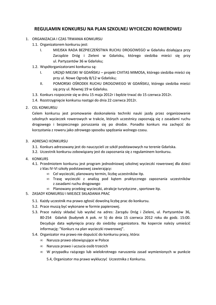 REGULAMIN KONKURSU NA PLAN SZKOLNEJ WYCIECZKI ROWEROWEJ 1. ORGANIZACJA I CZAS TRWANIA KONKURSU 1.1. Organizatorem konkursu jest: I. MIEJSKA RADA BEZPIECZEŃSTWA RUCHU DROGOWEGO w Gdańsku działająca przy Zarządzie Dróg i Zieleni w Gdańsku, którego siedziba mieści się przy ul. Partyzantów 36 w Gdańsku; 1.2. Współorganizatorami konkursu są: I. URZĄD MIEJSKI W GDAŃSKU – projekt CIVITAS MIMOSA, którego siedziba mieści się przy ul. Nowe Ogrody 8/12 w Gdańsku; II. POMORSKI OŚRODEK RUCHU DROGOWEGO W GDAŃSKU, którego siedziba mieści się przy ul. Równej 19 w Gdańsku. 1.3. Konkurs rozpocznie się w dniu 15 maja 2012r i będzie trwać do 15 czerwca 2012r. 1.4. Rozstrzygnięcie konkursu nastąpi do dnia 22 czerwca 2012r. 2. CEL KONKURSU Celem konkursu jest promowanie doskonalenia techniki nauki jazdy przez organizowanie szkolnych wycieczek rowerowych w trakcie, których uczestnicy zapoznają się z zasadami ruchu drogowego i bezpiecznego poruszania się po drodze. Ponadto konkurs ma zachęcić do korzystania z roweru jako zdrowego sposobu spędzania wolnego czasu. 3. ADRESACI KONKURSU 3.1. Konkurs adresowany jest do nauczycieli ze szkół podstawowych na terenie Gdańska. 3.2. Uczestnik konkursu zobowiązany jest do zapoznania się z regulaminem konkursu. 4. KONKURS 4.1. Przedmiotem konkursu jest program jednodniowej szkolnej wycieczki rowerowej dla dzieci z klas IV-VI szkoły podstawowej zawierający: • Cel wycieczki, planowany termin, liczbę uczestników itp. • Trasę wycieczki z analizą pod kątem praktycznego zapoznania uczestników z zasadami ruchu drogowego • Planowany przebieg wycieczki, atrakcje turystyczne , sportowe itp. 5. ZASADY KONKURSU I MIEJSCE SKŁADANIA PRAC 5.1. Każdy uczestnik ma prawo zgłosić dowolną liczbę prac do konkursu. 5.2. Prace muszą być wykonane w formie papierowej. 5.3. Prace należy składać lub wysłać na adres: Zarządu Dróg i Zieleni, ul. Partyzantów 36, 80-254 Gdańsk (budynek A pok. nr 5) do dnia 15 czerwca 2012 roku do godz. 15:00. Decyduje data wpłynięcia pracy do siedziby organizatora. Na kopercie należy umieścić informację: ”Konkurs na plan wycieczki rowerowej”. 5.4. Organizator ma prawo nie dopuścić do konkursu pracy, która: • Narusza prawo obowiązujące w Polsce • Narusza prawo i uczucia osób trzecich • W przypadku rażącego lub wielokrotnego naruszenia zasad wymienionych w punkcie 5.4, Organizator ma prawo wykluczyć Uczestnika z Konkursu. 6. ROZSTRZYGNIĘCIE KONKURSU I NAGRODY 6.1. Ocena dostarczonych prac będzie dokonywana przez Jury powołane przez Organizatora. 6.2. Jury biorąc pod uwagę wartość merytoryczną, edukacyjną oraz atrakcyjność i urozmaicenie planów wycieczek przyzna nagrody indywidualne dla nauczycieli oraz dla reprezentujących je szkół za: a) 1 miejsce w konkursie b) 2 miejsce w konkursie c) 3 miejsce w konkursie 6.3. Nagrodami w konkursie dla nauczycieli są: • Aparat fotograficzny Olympus PEN mini z kartą pamięci 8 Gb oraz pokrowcem i statywem za 1 miejsce w konkursie; • 2 aparaty Canon IXUS 220 HS z kartą pamięci 4 Gb oraz pokrowcem za 2 i 3 miejsce w konkursie. 6.4. Organizator ustala dodatkową nagrodę pieniężną dla nauczycieli na pokrycie kosztów podatku dochodowego w wysokości: • 227 zł za 1 miejsce w konkursie; • Po 79 zł za 2 i 3 miejsce w konkursie. 6.5. Nagrodami w konkursie dla szkół reprezentowanych przez nagrodzonych nauczycieli są: • Zestawy szkolnych znaków drogowych – zestaw 32-elementowy; • Zestawy pomocy dydaktycznych ”Budujemy znaki drogowe”; • Zestaw pomocy dydaktycznych „Uczeń w ruchu drogowym”; • Wyposażenie ochronne dla 10-cio osobowych grup rowerzystów (kaski i ochraniacze). 6.6. W przypadku realizacji zgłoszonego do konkursu planu wycieczki, wszyscy uczestnicy zostaną objęci szkoleniem prowadzonym przez ekspertów z Pomorskiego Ośrodka Ruchu Drogowego w Gdańsku. 6.7. Nagrody w konkursie nie można zamienić na inną nagrodę ani na ekwiwalent pieniężny. Organizator nie ponosi odpowiedzialności z tytułu rękojmi za wady nagrody ani nie udziela gwarancji jej jakości. Wszelkie reklamacje dotyczące nagrody należy zgłaszać do jej producenta lub sprzedawcy. 6.8. Zwycięzcy konkursu nie mogą przenieść prawa do otrzymania nagrody na osoby trzecie. 7. OGŁOSZENIE WYNIKÓW I WYDANIE NAGRÓD 7.1. Rozstrzygnięcie Konkursu zostanie opublikowane na stronie internetowej Konkursu www.zdiz.gda.pl w dniu 22 czerwca 2012r. 7.2. Niezależnie od powyższego, zwycięzcy konkursu zostaną w dniu rozstrzygnięcia Konkursu powiadomieni listownie przez Organizatora o przyznaniu im nagród. 7.3. Nagrody zostaną przekazane osobiście w Zarządzie Dróg i Zieleni w Gdańsku mieszczącym się przy ul. Partyzantów 36 Gdańsku. 7.4. W przypadku braku możliwości skontaktowania się ze zwycięzcą nagroda przepada. 7.5. Podanie nieprawdziwych lub niekompletnych danych będą przyczyną odmowy wydania uczestnikowi nagrody w przypadku wygranej. 7.6. Organizator nie ponosi odpowiedzialności za niemożność ani utrudnienia odbioru nagrody z przyczyn leżących po stronie Uczestnika nagrodzonego w Konkursie. 7.7. Podatek od nagród zostanie pokryty przez Organizatora. 7.8. Przystępując do Konkursu uczestnicy wyrażają zgodę na przeprowadzenie Konkursu zgodnie z niniejszym regulaminem. 8. PRAWA AUTORSKIE 8.1. Uczestnik wyraża zgodę na publikacje prac konkursowych na stronach internetowych organizatora i współorganizatorów oraz udostępnianie ich zainteresowanym podmiotom. 8.2. Uczestnik musi wyrazić pisemną zgodę na przetwarzanie swoich danych osobowych w celach konkursu oraz wypełnić oświadczenie stanowiące załącznik nr 1 do niniejszego Regulaminu. 9. POSTANOWIENIA KOŃCOWE 9.1.1. Regulamin znajduje się na stronie internetowej www.zdiz.gda.pl. 9.1.2. Wszystkie pytania i uwagi można kierować na adres e-mail: [email protected]. 9.1.3. Złamanie ustaleń regulaminu Konkursu przez Uczestni