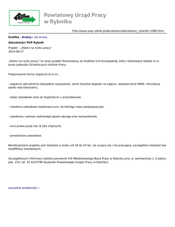 http://www.pup-rybnik.pl/aktualnosci/aktualnosci_lista/idn:1098.html Grafika : drukuj / nie drukuj Aktualności PUP Rybnik Projekt – „Równi na rynku pracy” 2014-08-27 „Równi na rynku pracy” to nowy projekt finansowany ze środków Unii Europejskiej, który realizowany będzie m.in. przez jednostki Ochotniczych Hufców Pracy. Proponowane formy wsparcia to m.in.: - wsparcie zatrudnienia (bezpłatne wyżywienie, zwrot kosztów dojazdu na zajęcia, ubezpieczenie NNW, refundacja opieki nad dzieckiem), - staże zawodowe wraz ze stypendium u pracodawców, - szkolenia zawodowe (wybierasz kurs, do którego masz predyspozycje), - szkolenia z zakresu wybranego języka obcego oraz komputerowe, - kurs prawa jazdy kat. B (dla chętnych), - poradnictwo zawodowe. Beneficjentami projektu jest młodzież w wieku od 18 do 24 lat, nie ucząca się i nie pracująca, szczególnie młodzież bez kwalifikacji zawodowych. Szczegółowych informacji udziela pracownik Filii Młodzieżowego Biura Pracy w Rybniku przy ul. Jankowickiej 1, II piętro, pok. 214, tel. 32 4223799 (budynek Powiatowego Urzędu Pracy w Rybniku). wszystkie wiadomości ›