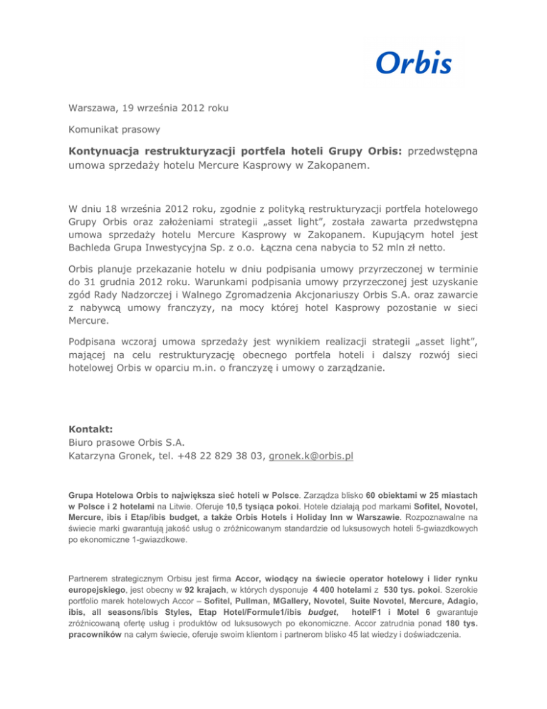 Warszawa, 19 września 2012 roku Komunikat prasowy Kontynuacja restrukturyzacji portfela hoteli Grupy Orbis: przedwstępna umowa sprzedaży hotelu Mercure Kasprowy w Zakopanem. W dniu 18 września 2012 roku, zgodnie z polityką restrukturyzacji portfela hotelowego Grupy Orbis oraz założeniami strategii „asset light”, została zawarta przedwstępna umowa sprzedaży hotelu Mercure Kasprowy w Zakopanem. Kupującym hotel jest Bachleda Grupa Inwestycyjna Sp. z o.o. Łączna cena nabycia to 52 mln zł netto. Orbis planuje przekazanie hotelu w dniu podpisania umowy przyrzeczonej w terminie do 31 grudnia 2012 roku. Warunkami podpisania umowy przyrzeczonej jest uzyskanie zgód Rady Nadzorczej i Walnego Zgromadzenia Akcjonariuszy Orbis S.A. oraz zawarcie z nabywcą umowy franczyzy, na mocy której hotel Kasprowy pozostanie w sieci Mercure. Podpisana wczoraj umowa sprzedaży jest wynikiem realizacji strategii „asset light”, mającej na celu restrukturyzację obecnego portfela hoteli i dalszy rozwój sieci hotelowej Orbis w oparciu m.in. o franczyzę i umowy o zarządzanie. Kontakt: Biuro prasowe Orbis S.A. Katarzyna Gronek, tel. +48 22 829 38 03, [email protected] Grupa Hotelowa Orbis to największa sieć hoteli w Polsce. Zarządza blisko 60 obiektami w 25 miastach w Polsce i 2 hotelami na Litwie. Oferuje 10,5 tysiąca pokoi. Hotele działają pod markami Sofitel, Novotel, Mercure, ibis i Etap/ibis budget, a także Orbis Hotels i Holiday Inn w Warszawie. Rozpoznawalne na świecie marki gwarantują jakość usług o zróżnicowanym standardzie od luksusowych hoteli 5-gwiazdkowych po ekonomiczne 1-gwiazdkowe. Partnerem strategicznym Orbisu jest firma Accor, wiodący na świecie operator hotelowy i lider rynku europejskiego, jest obecny w 92 krajach, w których dysponuje 4 400 hotelami z 530 tys. pokoi. Szerokie portfolio marek hotelowych Accor – Sofitel, Pullman, MGallery, Novotel, Suite Novotel, Mercure, Adagio, ibis, all seasons/ibis Styles, Etap Hotel/Formule1/ibis budget, hotelF1 i Motel 6 gwarantuje zróżnicowaną ofertę usług i produktów od luksusowych po ekonomiczne. Accor zatrudnia ponad 180 tys. pracowników na całym świecie, oferuje swoim klientom i partnerom blisko 45 lat wiedzy i doświadczenia.