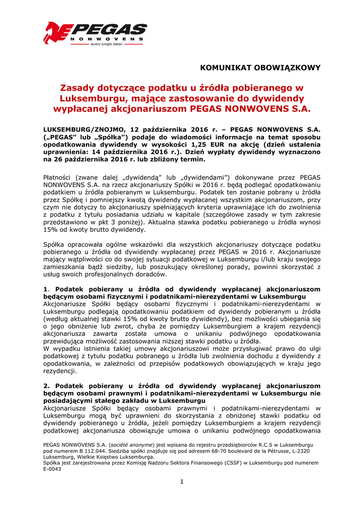 KOMUNIKAT OBOWIĄZKOWY Zasady dotyczące podatku u źródła pobieranego w Luksemburgu, mające zastosowanie do dywidendy wypłacanej akcjonariuszom PEGAS NONWOVENS S.A. LUKSEMBURG/ZNOJMO, 12 października 2016 r. – PEGAS NONWOVENS S.A. („PEGAS” lub „Spółka”) podaje do wiadomości informacje na temat sposobu opodatkowania dywidendy w wysokości 1,25 EUR na akcję (dzień ustalenia uprawnienia: 14 października 2016 r.). Dzień wypłaty dywidendy wyznaczono na 26 października 2016 r. lub zbliżony termin. Płatności (zwane dalej „dywidendą” lub „dywidendami”) dokonywane przez PEGAS NONWOVENS S.A. na rzecz akcjonariuszy Spółki w 2016 r. będą podlegać opodatkowaniu podatkiem u źródła pobieranym w Luksemburgu. Podatek ten zostanie pobrany u źródła przez Spółkę i pomniejszy kwotą dywidendy wypłacanej wszystkim akcjonariuszom, przy czym nie dotyczy to akcjonariuszy spełniających kryteria uprawniające ich do zwolnienia z podatku z tytułu posiadania udziału w kapitale (szczegółowe zasady w tym zakresie przedstawiono w pkt 3 poniżej). Aktualna stawka podatku pobieranego u źródła wynosi 15% od kwoty brutto dywidendy. Spółka opracowała ogólne wskazówki dla wszystkich akcjonariuszy dotyczące podatku pobieranego u źródła od dywidendy wypłacanej przez PEGAS w 2016 r. Akcjonariusze mający wątpliwości co do swojej sytuacji podatkowej w Luksemburgu i/lub kraju swojego zamieszkania bądź siedziby, lub poszukujący określonej porady, powinni skorzystać z usług swoich profesjonalnych doradców. 1. Podatek pobierany u źródła od dywidendy wypłacanej akcjonariuszom będącym osobami fizycznymi i podatnikami-nierezydentami w Luksemburgu Akcjonariusze Spółki będący osobami fizycznymi i podatnikami-nierezydentami w Luksemburgu podlegają opodatkowaniu podatkiem od dywidendy pobieranym u źródła (według aktualnej stawki 15% od kwoty brutto dywidendy), bez możliwości ubiegania się o jego obniżenie lub zwrot, chyba że pomiędzy Luksemburgiem a krajem rezydencji akcjonariusza zawarta została umowa o unikaniu podwójnego opodatkowania przewidująca możliwość zastosowania niższej stawki podatku u źródła. W wypadku istnienia takiej umowy akcjonariuszowi może przysługiwać prawo do ulgi podatkowej z tytułu podatku pobranego u źródła lub zwolnienia dochodu z dywidendy z opodatkowania, w zależności od przepisów podatkowych obowiązujących w kraju jego rezydencji. 2. Podatek pobierany u źródła od dywidendy wypłacanej akcjonariuszom będącym osobami prawnymi i podatnikami-nierezydentami w Luksemburgu nie posiadającymi stałego zakładu w Luksemburgu Akcjonariusze Spółki będący osobami prawnymi i podatnikami-nierezydentami w Luksemburgu mogą być uprawnieni do skorzystania z obniżonej stawki podatku od dywidendy pobieranego u źródła, jeżeli pomiędzy Luksemburgiem a krajem rezydencji podatkowej akcjonariusza obowiązuje umowa o unikaniu podwójnego opodatkowania PEGAS NONWOVENS S.A. (société anonyme) jest wpisana do rejestru przedsiębiorców R.C.S w Luksemburgu pod numerem B 112.044. Siedziba spółki znajduje się pod adresem 68-70 boulevard de la Pétrusse, L-2320 Luksemburg, Wielkie Księstwo Luksemburga. Spółka jest zarejestrowana przez Komisję Nadzoru Sektora Finansowego (CSSF) w Luksemburgu pod numerem E-0043 1 przewidująca możliwość zastosowania niższej stawki podatku u źródła oraz jeżeli akcjonariusze będący osobami prawnymi są rezydentami podatkowymi w tym kraju w rozumieniu umowy o unikaniu podwójnego opodatkowania, lub jeżeli złożą oni wniosek o luksemburskie zwolnienie podatkowe z tytułu posiadania udziału w kapitale (zob. pkt 3). Luksemburskie władze podatkowe przyznają akcjonariuszowi-nierezydentowi prawo do obniżonej lub zerowej stawki podatku u źródła, pod warunkiem, że będzie on w stanie dowieść, iż jest faktycznym beneficjentem dochodów z tytułu posiadanych akcji Spółki. Akcjonariusz jest uważany za faktycznego beneficjenta, jeżeli otrzymuje dywidendę na własny rachunek, a nie jako pośrednik lub depozytariusz, oraz jeżeli może swobodnie rozporządzać dochodami z dywidendy, stosownie do własnych potrzeb. W wypadku gdy na mocy umowy o unikaniu podwójnego opodatkowania zastosowanie ma obniżona stawka podatku, akcjonariusz może ubiegać się o zwrot nadpłaconej kwoty podatku u źródła pobranego w Luksemburgu. W tym celu akcjonariusz musi dostarczyć luksemburskiemu organowi podatkowemu następujące dokumenty: - cztery kopie formularza „901bis”, poświadczone uprzednio przez organ podatkowy kraju rezydencji akcjonariusza. Formularz „901bis” jest dostępny do pobrania na stronie internetowej luksemburskiej administracji podatkowej: www.impotsdirects.public.lu, w zakładce „Formulaires-Retenues à la source” (Formularze- Podatki pobieranie u źródła) - kopię Formularza „# 900” dotyczącego podatku pobieranego u źródła od dywidendy Spółki oraz kopię polecenia przelewu bankowego dokonanego tytułem zapłaty tego podatku przez Spółkę (zob. pkt 5 poniżej). Powyższe dokumenty należy przesłać do luksemburskiego organu podatkowego na następujący adres: Administration des contributions directes Bureau d’imposition des sociétés VI 18, rue du Fort Wedell L-2982 Luksemburg Akcjonariusze będący osobami prawnymi i podatnikami-nierezydentami w Luksemburgu mogą być uprawnieni do ulgi podatkowej z tytułu podatku pobranego u źródła lub do zwolnienia dochodu z dywidendy z opodatkowania, w zależności od przepisów podatkowych obowiązujących w kraju ich rezydencji podatkowej. 3. Zasady zwolnienia z podatku z tytułu posiadania udziału w kapitale Akcjonariusze będący faktycznymi beneficjentami dywidendy i spełniający poniższe warunki mogą być uprawnieni do zwolnienia z pobieranego w Luksemburgu podatku u źródła od dywidendy z tytułu posiadania udziału w kapitale Spółki. A) Akcjonariusz musi być: • 