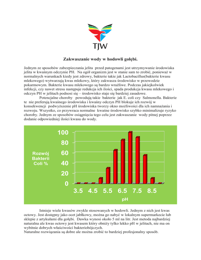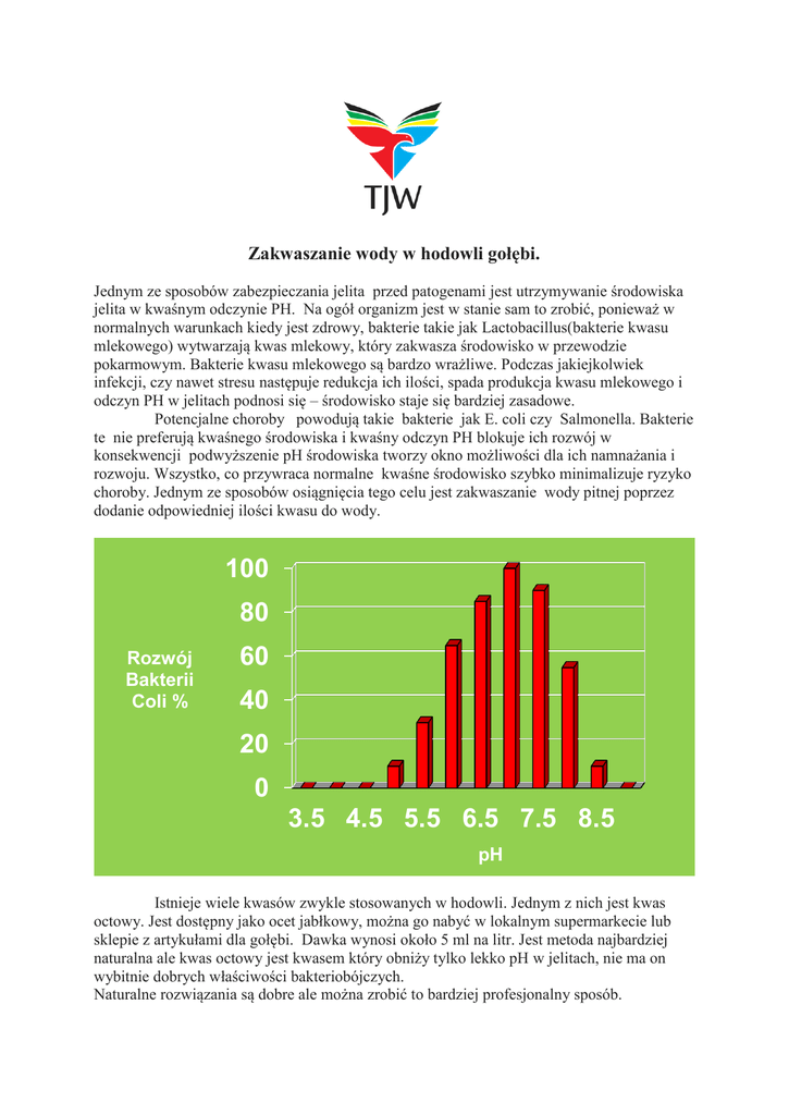Zakwaszanie wody w hodowli gołębi. Rozwój Bakterii Coli % pH