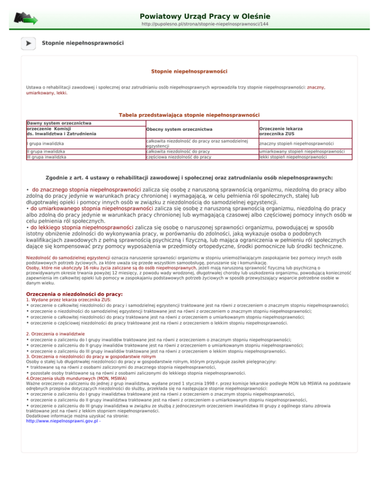 Powiatowy Urząd Pracy w Oleśnie http://pupolesno.pl/strona/stopnie-niepelnosprawnosci/144 Stopnie niepełnosprawności Stopnie niepełnosprawności Ustawa o rehabilitacji zawodowej i społecznej oraz zatrudnianiu osób niepełnosprawnych wprowadziła trzy stopnie niepełnosprawności: znaczny, umiarkowany, lekki. Tabela przedstawiająca stopnie niepełnosprawności Dawny system orzecznictwa orzeczenie Komisji ds. Inwalidztwa i Zatrudnienia I grupa inwalidzka II grupa inwalidzka III grupa inwalidzka Obecny system orzecznictwa całkowita niezdolność do pracy oraz samodzielnej egzystencji całkowita niezdolność do pracy częściowa niezdolność do pracy Orzeczenie lekarza orzecznika ZUS znaczny stopień niepełnosprawności umiarkowany stopień niepełnosprawności lekki stopień niepełnosprawności Zgodnie z art. 4 ustawy o rehabilitacji zawodowej i społecznej oraz zatrudnianiu osób niepełnosprawnych: • do znacznego stopnia niepełnosprawności zalicza się osobę z naruszoną sprawnością organizmu, niezdolną do pracy albo zdolną do pracy jedynie w warunkach pracy chronionej i wymagającą, w celu pełnienia ról społecznych, stałej lub długotrwałej opieki i pomocy innych osób w związku z niezdolnością do samodzielnej egzystencji. • do umiarkowanego stopnia niepełnosprawności zalicza się osobę z naruszoną sprawnością organizmu, niezdolną do pracy albo zdolną do pracy jedynie w warunkach pracy chronionej lub wymagającą czasowej albo częściowej pomocy innych osób w celu pełnienia ról społecznych. • do lekkiego stopnia niepełnosprawności zalicza się osobę o naruszonej sprawności organizmu, powodującej w sposób istotny obniżenie zdolności do wykonywania pracy, w porównaniu do zdolności, jaką wykazuje osoba o podobnych kwalifikacjach zawodowych z pełną sprawnością psychiczną i fizyczną, lub mająca ograniczenia w pełnieniu ról społecznych dające się kompensować przy pomocy wyposażenia w przedmioty ortopedyczne, środki pomocnicze lub środki techniczne. Niezdolność do samodzielnej egzystencji oznacza naruszenie sprawności organizmu w stopniu uniemożliwiającym zaspokajanie bez pomocy innych osób podstawowych potrzeb życiowych, za które uważa się przede wszystkim samoobsługę, poruszanie się i komunikację. Osoby, które nie ukończyły 16 roku życia zaliczane są do osób niepełnosprawnych, jeżeli mają naruszoną sprawność fizyczną lub psychiczną o przewidywanym okresie trwania powyżej 12 miesięcy, z powodu wady wrodzonej, długotrwałej choroby lub uszkodzenia organizmu, powodującą konieczność zapewnienia im całkowitej opieki lub pomocy w zaspokajaniu podstawowych potrzeb życiowych w sposób przewyższający wsparcie potrzebne osobie w danym wieku. Orzeczenia o niezdolności do pracy: 1. Wydane przez lekarza orzecznika ZUS: • orzeczenie o całkowitej niezdolności do pracy i samodzielnej egzystencji traktowane jest na równi z orzeczeniem o znacznym stopniu niepełnosprawności; • orzeczenie o niezdolności do samodzielnej egzystencji traktowane jest na równi z orzeczeniem o znacznym stopniu niepełnosprawności; • orzeczenie o całkowitej niezdolności do pracy traktowane jest na równi z orzeczeniem o umiarkowanym stopniu niepełnosprawności; • orzeczenie o częściowej niezdolności do pracy traktowane jest na równi z orzeczeniem o lekkim stopniu niepełnosprawności. 2. Orzeczenia o inwalidztwie • orzeczenie o zaliczeniu do I grupy inwalidów traktowane jest na równi z orzeczeniem o znacznym stopniu niepełnosprawności; • orzeczenie o zaliczeniu do II grupy inwalidów traktowane jest na równi z orzeczeniem o umiarkowanym stopniu niepełnosprawności; • orzeczenie o zaliczeniu do III grupy inwalidów traktowane jest na równi z orzeczeniem o lekkim stopniu niepełnosprawności. 3. Orzeczenia o niezdolności do pracy w gospodarstwie rolnym Osoby o stałej lub długotrwałej niezdolności do pracy w gospodarstwie rolnym, którym przysługuje zasiłek pielęgnacyjny: • traktowane są na równi z osobami zaliczonymi do znacznego stopnia niepełnosprawności, • pozostałe osoby traktowane są na równi z osobami zaliczonymi do lekkiego stopnia niepełnosprawności. 4.Orzeczenia służb mundurowych (MON, MSWiA) Ważne orzeczenie o zaliczeniu do jednej z grup inwalidztwa, wydane przed 1 stycznia 1998 r. przez komisje lekarskie podległe MON lub MSWiA na podstawie odrębnych przepisów dotyczących niezdolności do służby, przekłada się na następujące stopnie niepełnosprawności: • orzeczenie o zaliczeniu do I grupy inwalidztwa traktowane jest na równi z orzeczeniem o znacznym stopniu niepełnosprawności, • orzeczenie o zaliczeniu do II grupy inwalidztwa traktowane jest na równi z orzeczeniem o umiarkowanym stopniu niepełnosprawności, • orzeczenie o zaliczeniu do III grupy inwalidztwa w związku ze służbą z jednoczesnym orzeczeniem inwalidztwa III grupy z ogólnego stanu zdrowia traktowane jest na równi z lekkim stopniem niepełnosprawności. Dodatkowe informacje można uzyskać na stronie: http://www.niepelnosprawni.gov.pl -