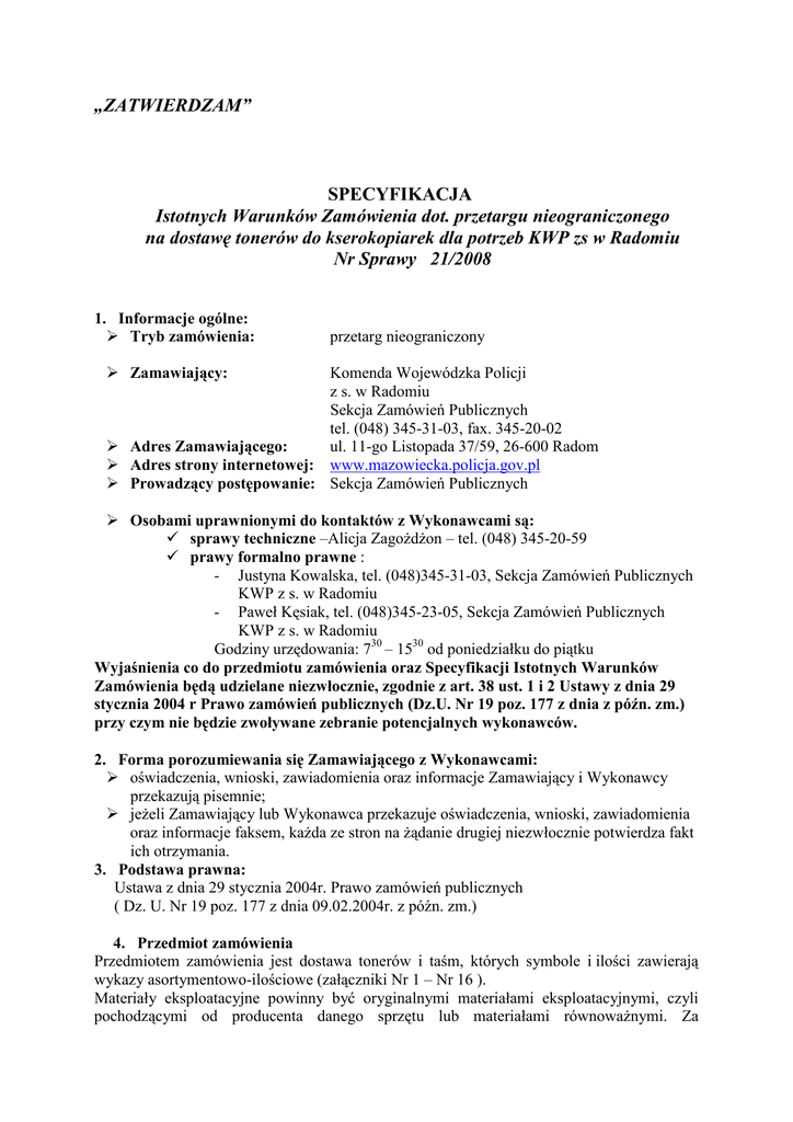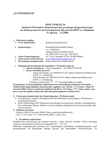 „ZATWIERDZAM” SPECYFIKACJA Istotnych Warunków Zamówienia dot. przetargu nieograniczonego na dostawę tonerów do kserokopiarek dla potrzeb KWP zs w Radomiu Nr Sprawy 21/2008 1. Informacje ogólne: Tryb zamówienia: przetarg nieograniczony Zamawiający: Komenda Wojewódzka Policji z s. w Radomiu Sekcja Zamówień Publicznych tel. (048) 345-31-03, fax. 345-20-02 Adres Zamawiającego: ul. 11-go Listopada 37/59, 26-600 Radom Adres strony internetowej: www.mazowiecka.policja.gov.pl Prowadzący postępowanie: Sekcja Zamówień Publicznych Osobami uprawnionymi do kontaktów z Wykonawcami są: sprawy techniczne –Alicja ZagoŜdŜon – tel. (048) 345-20-59 prawy formalno prawne : - Justyna Kowalska, tel. (048)345-31-03, Sekcja Zamówień Publicznych KWP z s. w Radomiu - Paweł Kęsiak, tel. (048)345-23-05, Sekcja Zamówień Publicznych KWP z s. w Radomiu Godziny urzędowania: 730 – 1530 od poniedziałku do piątku Wyjaśnienia co do przedmiotu zamówienia oraz Specyfikacji Istotnych Warunków Zamówienia będą udzielane niezwłocznie, zgodnie z art. 38 ust. 1 i 2 Ustawy z dnia 29 stycznia 2004 r Prawo zamówień publicznych (Dz.U. Nr 19 poz. 177 z dnia z późn. zm.) przy czym nie będzie zwoływane zebranie potencjalnych wykonawców. 2. Forma porozumiewania się Zamawiającego z Wykonawcami: oświadczenia, wnioski, zawiadomienia oraz informacje Zamawiający i Wykonawcy przekazują pisemnie; jeŜeli Zamawiający lub Wykonawca przekazuje oświadczenia, wnioski, zawiadomienia oraz informacje faksem, kaŜda ze stron na Ŝądanie drugiej niezwłocznie potwierdza fakt ich otrzymania. 3. Podstawa prawna: Ustawa z dnia 29 stycznia 2004r. Prawo zamówień publicznych ( Dz. U. Nr 19 poz. 177 z dnia 09.02.2004r. z późn. zm.) 4. Przedmiot zamówienia Przedmiotem zamówienia jest dostawa tonerów i taśm, których symbole i ilości zawierają wykazy asortymentowo-ilościowe (załączniki Nr 1 – Nr 16 ). Materiały eksploatacyjne powinny być oryginalnymi materiałami eksploatacyjnymi, czyli pochodzącymi od producenta danego sprzętu lub materiałami równowaŜnymi. Za równowaŜne Zamawiający uznaje produkty, których wydajność jest równa lub lepsza niŜ kaset oryginalnych. Dostarczone materiały eksploatacyjne muszą być oryginalne i fabrycznie nowe (w których Ŝaden element nie był wymieniony). Nie dopuszcza się dostarczania materiałów regenerowanych oraz poddanych procesowi ponownego napełniania. Ponadto równowaŜne tonery i tusze powinny być objęte gwarancja do wyczerpania się środka barwiącego, nie krócej jednak niŜ 12 miesięcy. Wykonawca zobowiązany jest do zwrotu kosztów naprawy urządzeń w przypadku, gdy przyczyną uszkodzenia było zastosowanie zamiennego materiału eksploatacyjnego, który nie jest równowaŜny oryginalnemu materiałowi eksploatacyjnemu. W szczególności Wykonawca zobowiązany jest do zwrotu kosztów naprawy w przypadku, gdy Gwarant odmówi naprawy urządzenia w ramach gwarancji przysługującej Zamawiającemu, ze względu na zastosowanie toneru dostarczonego przez Wykonawcę. 5. Zamawiający dopuszcza moŜliwość składania ofert częściowych w ramach poszczególnych Załączników (1-16). Zamawiający nie dopuszcza składania ofert wariantowych. 6. Nazwa zadania i lokalizacja. Dostawa tonerów do kserokopiarek jak równieŜ innych przedmiotów określonych w Załącznikach Nr 1 – Nr 16, odbywać się będzie do magazynu KWP z/s w Radomiu zlokalizowanego przy ul. Młodzianowskiej 24. Wykonawca zobowiązany będzie do dostawy przedmiotu zamówienia w dostawach częściowych do miejsca powyŜej określonego. Wykonawca zapewni na swój koszt dostawę i ich rozładunek Realizacja zamówienia odbywać się będzie w dostawach częściowych po uzgodnieniu ilości i asortymentu w formie faksowej lub listowej, w ciągu 10 dni od daty wpływu zapotrzebowania. 7. PoŜądany termin realizacji zamówienia: Umowa obowiązywać przez okres 12 miesięcy licząc od daty jej zawarcia. 8. O udzielenie zamówienia publicznego mogą ubiegać się Wykonawcy którzy: 1) posiadają uprawnienia do wykonywania określonej działalności lub czynności, jeŜeli ustawy nakładają obowiązek posiadania takich uprawnień, 2) posiadają niezbędną wiedzę i doświadczenie oraz dysponują potencjałem technicznym i osobami zdolnymi do wykonania zamówienia, 3) znajdują się w sytuacji ekonomicznej i finansowej zapewniającej wykonanie zamówienia, 4) nie podlegają wykluczeniu z postępowania o udzielenie zamówienia. 9. Informacje dotyczące warunków składania ofert: Niniejsza specyfikacja oraz wszystkie dokumenty do niej dołączone mogą być uŜyte jedynie w celu sporządzenia oferty. Wykonawca przedstawia ofertę zgodnie z wymaganiami określonymi w niniejszej specyfikacji. Wykonawca ponosi wszystkie koszty związane z przygotowaniem i złoŜeniem oferty. 10. Na potwierdzenie spełniania warunków udziału w postępowaniu Zamawiający Ŝąda następujących dokumentów: Grupa I: Aktualny odpis z właściwego rejestru albo aktualne zaświadczenie o wpisie do ewidencji działalności gospodarczej, jeŜeli odrębne przepisy wymagają wpisu do rejestru lub zgłoszenia do ewidencji działalności gospodarczej, wystawiony nie wcześniej niŜ 6 miesięcy przed upływem terminu składania ofert. Oświadczenie o nie podleganiu przez wykonawcę wykluczeniu z postępowania na mocy art.24 ustawy Prawo zamówień publicznych i spełnieniu warunków art. 22 ust. 1 cyt. ustawy - (wzór stanowi Załącznik Nr 18). PowyŜsze dokumenty muszą być złoŜone w formie oryginałów lub kserokopii potwierdzonych formuła za zgodność z oryginałem” przez osobę (osoby) upowaŜnione do reprezentowania Wykonawcy. Grupa II Parafowany przez upowaŜnionego przedstawiciela wykonawcy wzór umowy Załącznik Nr 17 Wypełniony wykaz asortymentowo-ilościowy, ten na który Wykonawca składa ofertę (przynajmniej na jedno Zadanie) – Załącznik Nr 1 do Nr 16. Wypełniony druk oferty Wy