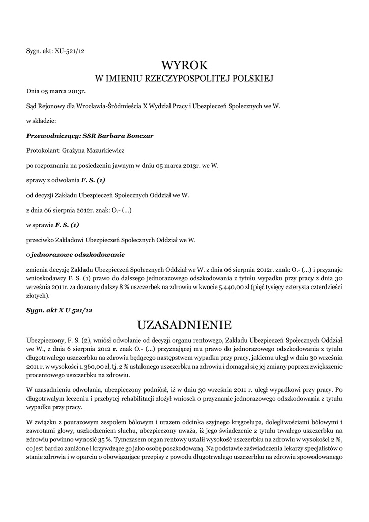 Sygn. akt: XU-521/12 WYROK W IMIENIU RZECZYPOSPOLITEJ POLSKIEJ Dnia 05 marca 2013r. Sąd Rejonowy dla Wrocławia-Śródmieścia X Wydział Pracy i Ubezpieczeń Społecznych we W. w składzie: Przewodniczący: SSR Barbara Bonczar Protokolant: Grażyna Mazurkiewicz po rozpoznaniu na posiedzeniu jawnym w dniu 05 marca 2013r. we W. sprawy z odwołania F. S. (1) od decyzji Zakładu Ubezpieczeń Społecznych Oddział we W. z dnia 06 sierpnia 2012r. znak: O.- (...) w sprawie F. S. (1) przeciwko Zakładowi Ubezpieczeń Społecznych Oddział we W. o jednorazowe odszkodowanie zmienia decyzję Zakładu Ubezpieczeń Społecznych Oddział we W. z dnia 06 sierpnia 2012r. znak: O.- (...) i przyznaje wnioskodawcy F. S. (1) prawo do dalszego jednorazowego odszkodowania z tytułu wypadku przy pracy z dnia 30 września 2011r. za doznany dalszy 8 % uszczerbek na zdrowiu w kwocie 5.440,00 zł (pięć tysięcy czterysta czterdzieści złotych). Sygn. akt X U 521/12 UZASADNIENIE Ubezpieczony, F. S. (2), wniósł odwołanie od decyzji organu rentowego, Zakładu Ubezpieczeń Społecznych Oddział we W., z dnia 6 sierpnia 2012 r. znak O.- (...) przyznającej mu prawo do jednorazowego odszkodowania z tytułu długotrwałego uszczerbku na zdrowiu będącego następstwem wypadku przy pracy, jakiemu uległ w dniu 30 września 2011 r. w wysokości 1.360,00 zł, tj. 2 % ustalonego uszczerbku na zdrowiu i domagał się jej zmiany poprzez zwiększenie procentowego uszczerbku na zdrowiu. W uzasadnieniu odwołania, ubezpieczony podniósł, iż w dniu 30 września 2011 r. uległ wypadkowi przy pracy. Po długotrwałym leczeniu i przebytej rehabilitacji złożył wniosek o przyznanie jednorazowego odszkodowania z tytułu wypadku przy pracy. W związku z pourazowym zespołem bólowym i urazem odcinka szyjnego kręgosłupa, dolegliwościami bólowymi i zawrotami głowy, uszkodzeniem słuchu, ubezpieczony uważa, iż jego świadczenie z tytułu trwałego uszczerbku na zdrowiu powinno wynosić 35 %. Tymczasem organ rentowy ustalił wysokość uszczerbku na zdrowiu w wysokości 2 %, co jest bardzo zaniżone i krzywdzące go jako osobę poszkodowaną. Na podstawie zaświadczenia lekarzy specjalistów o stanie zdrowia i w oparciu o obowiązujące przepisy z powodu długotrwałego uszczerbku na zdrowiu spowodowanego wypadkiem przy pracy z dnia 30 września 2011 r. jego odszkodowanie powinno być wyliczone według tabeli norm w następujący sposób: - pozycja 5e tabeli – 5 %, - pozycja 44b tabeli – 10 %, - pozycja 130a tabeli – 10 %, - pozycja 94ac tabeli – 10 %. Łączny uszczerbek na zdrowiu jaki poniósł wynosić powinien 35 % (k. 2-v. 2). * Organ rentowy – Zakład Ubezpieczeń Społecznych Oddział we W., w odpowiedzi na odwołanie ubezpieczonego, wniósł o jego oddalenie, z uwagi na brak podstaw prawnych do jego uwzględnienia oraz o zasądzenie kosztów zastępstwa prawnego według norm przepisanych. W uzasadnieniu swojego stanowiska organ rentowy zarzucił, iż w ocenie Komisji Lekarskiej ZUS, skutki na zdrowiu przejawiają się 2 % długotrwałym uszczerbkiem na zdrowiu – przebyte stłuczenie nadgarstka z przewlekłym zespołem bólowym pourazowym bez ograniczenia funkcji ręki, stan po przebytym urazie głowy i kręgosłupa szyjnego bez następstw neurologicznych i funkcyjnych (poz. 130a). Zgodnie z przepisami Ustawy z dnia 30 października 2002 r., o ubezpieczeniu społecznym z tytułu wypadków przy pracy i chorób zawodowych oraz § 8 Rozporządzenia Ministra Pracy i Polityki Społecznej z dnia 18 grudnia 2002 r., w sprawie szczegółowych zasad orzekania o stałym lub długotrwałym uszczerbku na zdrowiu, trybu postępowania przy ustaleniu tego uszczerbku oraz postępowania o wypłatę jednorazowego odszkodowania - podstawą orzekania w przedmiocie jednorazowego odszkodowania, są ustalenia Lekarza Orzecznika O/ZUS i Komisji Lekarskiej ZUS jako instancji odwoławczej. Jej opinia stanowi wyłączną podstawę ustalenia stopnia uszczerbku na zdrowiu, braną pod uwagę przy wydawaniu decyzji. Odszkodowanie, które ustala organ rentowy, określa się w oparciu o występujący u poszkodowanego stopień stałego lub długotrwałego uszczerbku na zdrowiu, wyrażony w procentach. Nie podlegają rekompensacie cierpienia, uciążliwości, czy inne dolegliwości będące następstwem urazu. Nie jest to bowiem przewidziane w powołanych wyżej przepisach, które jako wyłączne kryterium ustalenia wymiaru odszkodowania ustanawiają stopień uszczerbku na zdrowiu i nie przewidują innych podstaw (k. 11-v. 11). Sąd Rejonowy ustalił następujący stan faktyczny: Ubezpieczony, F. S. (2), będąc pracownikiem Państwowego Przedsiębiorstwa (...) w W., w dniu 30 września 2011 r. uległ wypadkowi przy pracy, w wyniku którego doznał urazu głowy bez złamania kości czaszki, urazu kręgosłupa szyjnego oraz stłuczenia nadgarstka prawego. Lekarz orzecznik ZUS orzeczeniem z dnia 5 lipca 2012 r., ustalił u ubezpieczonego 2 % długotrwałego uszczerbku na zdrowiu według nr pozycji tabeli 130a, spowodowanego skutkami wypadku przy pracy z dnia 30 września 2011 r. W wyniku złożonego przez ubezpieczonego sprzeciwu, komisja lekarska ZUS nr (...) orzeczeniem z dnia 30 lipca 2012 r., ustaliła u ubezpieczonego 2 % długotrwałego uszczerbku na zdrowiu spowodowanego skutkami wypadku przy pracy z dnia 30 września 2011 r. Decyzją z dnia 6 sierpnia 2012 r., znak O.- (...), na podstawie ustawy z dnia 30 października 2002 r. o ubezpieczeniu społecznym z tytułu wypadków przy pracy oraz rozporządzeń wykonawczych, organ rentowy przyznał ubezpieczonemu prawo do jednorazowego odszkodowania z tytułu długotrwałego uszczerbku na zdrowiu będącego następstwem wypadku przy pracy z dnia 30 września 2011 r. w wysokości 2 %, tj. 1.360,00 zł. Dowody: dokumentacja w aktach ZUS znak O.- (...) (plik w aktach sprawy). Biegła sądowa z zakresu otolaryngologii-foniatrii rozpoznała u ubezpieczonego stan po urazie głowy, kręgosłupa