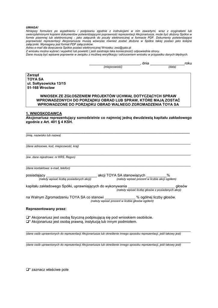 UWAGA! Niniejszy formularz po wypełnieniu i podpisaniu zgodnie z instrukcjami w nim zawartymi, wraz z oryginałami lub uwierzytelnionymi kopiami dokumentów potwierdzającymi poprawność reprezentacji Akcjonariusza, może być złożony Spółce w formie pisemnej lub elektronicznej - jako załącznik do poczty elektronicznej w formacie PDF. Dokumenty potwierdzające poprawność reprezentacji Akcjonariusza muszą wówczas również zostać złożone w Spółce takiej postaci jako kolejne załączniki. Wymagany jest format PDF załączników. Adres e-mail dla doręczenia Spółce postaci elektronicznej Wniosku: [email protected] Z wniosku można wybrać i wypełnić lub powielić ( jeśli zaistnieje taka konieczność) odpowiednie strony. Dane muszą być wpisane poprawnie w związku z możliwą weryfikacją i odrzuceniem wniosku w przypadku danych błędnych. _________________________, dnia _________________roku (miejscowość) (data) Zarząd TOYA SA ul. Sołtysowicka 13/15 51-168 Wrocław WNIOSEK ZE ZGŁOSZENIEM PROJEKTÓW UCHWAŁ DOTYCZĄCYCH SPRAW WPROWADZONYCH DO PORZĄDKU OBRAD LUB SPRAW, KTÓRE MAJĄ ZOSTAĆ WPROWADZONE DO PORZĄDKU OBRAD WALNEGO ZGROMADZENIA TOYA SA 1. WNIOSKODAWCA Akcjonariusz reprezentujący samodzielnie co najmniej jedną dwudziestą kapitału zakładowego zgodnie z Art. 401 § 4 KSH. ______________________________________________________________________ (imię, nazwisko lub nazwa) _________________________________________________________________________________ (dane adresowe, kod, miejscowość, kraj) _________________________________________________________________________________ (ew. dane rejestrowe: nr KRS, Regon) _________________________________________________________________________________ (dane kontaktowe: e-mail, telefon) posiadający _________________________ akcji TOYA SA stanowiących __________% (należy wpisać liczbę posiadanych akcji) (należy wpisać procent w liczbie akcji ogółem) kapitału zakładowego Spółki, uprawniających do wykonywania _______________________ głosów (należy wpisać liczbę głosów z posiadanych akcji) na Walnym Zgromadzeniu TOYA SA co stanowi _______________ % ogólnej liczby głosów. (należy wpisać procent w liczbie głosów ogółem) Reprezentowany przez: * Akcjonariusz jest osobą fizyczną podpisującą się pod wnioskiem osobiście. * Akcjonariusz jest osobą prawną, instytucją lub innym podmiotem. _________________________________________________________________________________ (dane osób uprawnionych do reprezentacji Akcjonariusza lub określenie innego sposobu reprezentacji, jeśli takowy jest) _________________________________________________________________________________ (dane osób uprawnionych do reprezentacji Akcjonariusza lub określenie innego sposobu reprezentacji, jeśli takowy jest) * zaznacz właściwe pole 2. TREŚĆ WNIOSKU Wnioskodawca, na podstawie art. 401 § 4 Kodeksu Spółek Handlowych zgłasza do spraw wprowadzonych do porządku obrad Walnego Zgromadzenia TOYA SA z siedzibą we Wrocławiu, które zostało zwołane na dzień 28 maja 2015 roku następujące projekty uchwał: (poniżej należy wyszczególnić listę spraw/punktów z projektem/ami uchwały/uchwał do nich): 3. PODPIS WNIOSKODAWCY (Podpis /y Akcjonariusza/ osób uprawnionych do reprezentacji) ___________________________________________________ UWAGA! W przypadku Akcjonariusza - osoby prawnej, instytucji lub innego podmiotu, wymagane jest złożenie podpisu zgodnie z obowiązującymi u niego zasadami reprezentacji oraz załączenie do niniejszego wniosku odpisu z właściwego rejestru lub ewidencji poświadczającego sposób reprezentacji Akcjonariusza. Do wniosku musi być również załączone imienne świadectwo depozytowe, wystawione przez właściwy podmiot, potwierdzające stan posiadania przez Akcjonariusza wymaganej do złożenia wniosku części kapitału zakładowego Spółki na dzień złożenia żądania. Załączniki: 1._______________________ 2._______________________ 3._______________________ UWAGA! Niniejszy formularz po wypełnieniu i podpisaniu zgodnie z instrukcjami w nim zawartymi, wraz z oryginałami lub uwierzytelnionymi kopiami dokumentów potwierdzającymi poprawność reprezentacji Akcjonariusza, może być złożony Spółce w formie pisemnej. Niniejszy formularz również, po wypełnieniu i podpisaniu zgodnie z instrukcjami w nim zawartymi, może być złożony Spółce w postaci elektronicznej jako załącznik do poczty elektronicznej w formacie PDF. Dokumenty potwierdzające poprawność reprezentacji Akcjonariusza muszą wówczas również zostać złożone w Spółce takiej postaci jako kolejne załączniki. Wymagany jest format PDF załączników. Adres e-mail dla doręczenia Spółce postaci elektronicznej Wniosku: [email protected] Z wniosku można wybrać i wypełnić lub powielić, jeśli zaistnieje taka konieczność, tylko te strony, które dotyczą danego Wnioskodawcy. Dane muszą być wpisane poprawnie w związku z możliwą weryfikacją i odrzuceniem wniosku w przypadku danych błędnych. _________________________, dnia _________________roku (miejscowość) (data) Zarząd TOYA SA ul. Sołtysowicka 13/15 51-168 Wrocław WNIOSEK ZE ZGŁOSZENIEM PROJEKTÓW UCHWAŁ DOTYCZĄCYCH SPRAW WPROWADZONYCH DO PORZĄDKU OBRAD LUB SPRAW, KTÓRE MAJĄ ZOSTAĆ WPROWADZONE DO PORZĄDKU OBRAD WALNEGO ZGROMADZENIA TOYA SA 1. WNIOSKODAWCY Akcjonariusze reprezentujący łącznie co najmniej jedną dwudziestą kapitału zakładowego zgodnie z art. 401 § 4 KSH. Liczba Akcjonariuszy składających wniosek:_____________________________________________ (należy wpisać liczbę akcjonariuszy) Ilość posiadanych przez Akcjonariuszy akcji łącznie_______________________________________ (należy wpisać sumę akcji) co stanowi_______________________________________% kapitału zakładowego uprawniających (należy wpisać procent w liczbie akcji ogółem) poniżej wymienionych do wykonywania ______