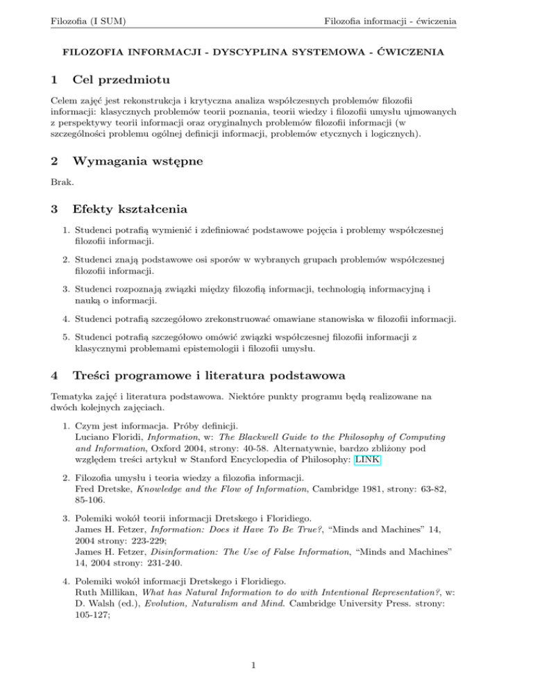 Filozofia (I SUM) Filozofia informacji - ćwiczenia FILOZOFIA INFORMACJI - DYSCYPLINA SYSTEMOWA - ĆWICZENIA 1 Cel przedmiotu Celem zajęć jest rekonstrukcja i krytyczna analiza współczesnych problemów filozofii informacji: klasycznych problemów teorii poznania, teorii wiedzy i filozofii umysłu ujmowanych z perspektywy teorii informacji oraz oryginalnych problemów filozofii informacji (w szczególności problemu ogólnej definicji informacji, problemów etycznych i logicznych). 2 Wymagania wstępne Brak. 3 Efekty kształcenia 1. Studenci potrafią wymienić i zdefiniować podstawowe pojęcia i problemy współczesnej filozofii informacji. 2. Studenci znają podstawowe osi sporów w wybranych grupach problemów współczesnej filozofii informacji. 3. Studenci rozpoznają związki między filozofią informacji, technologią informacyjną i nauką o informacji. 4. Studenci potrafią szczegółowo zrekonstruować omawiane stanowiska w filozofii informacji. 5. Studenci potrafią szczegółowo omówić związki współczesnej filozofii informacji z klasycznymi problemami epistemologii i filozofii umysłu. 4 Treści programowe i literatura podstawowa Tematyka zajęć i literatura podstawowa. Niektóre punkty programu będą realizowane na dwóch kolejnych zajęciach. 1. Czym jest informacja. Próby definicji. Luciano Floridi, Information, w: The Blackwell Guide to the Philosophy of Computing and Information, Oxford 2004, strony: 40-58. Alternatywnie, bardzo zbliżony pod względem treści artykuł w Stanford Encyclopedia of Philosophy: LINK 2. Filozofia umysłu i teoria wiedzy a filozofia informacji. Fred Dretske, Knowledge and the Flow of Information, Cambridge 1981, strony: 63-82, 85-106. 3. Polemiki wokół teorii informacji Dretskego i Floridiego. James H. Fetzer, Information: Does it Have To Be True?, “Minds and Machines” 14, 2004 strony: 223-229; James H. Fetzer, Disinformation: The Use of False Information, “Minds and Machines” 14, 2004 strony: 231-240. 4. Polemiki wokół informacji Dretskego i Floridiego. Ruth Millikan, What has Natural Information to do with Intentional Representation?, w: D. Walsh (ed.), Evolution, Naturalism and Mind. Cambridge University Press. strony: 105-127; 1 Filozofia (I SUM) Filozofia informacji - ćwiczenia 5. Polemiki wokół informacji Dretskego i Floridiego. Aaron Sloman, What’s Information, for an organism or intelligent machine? How can a machine or organism mean?, LINK 6. Świadomość i informacja wg Chalmersa. David Chalmers, Świadomy umysł. W poszukiwaniu teorii fundamentalnej, Warszawa 2010, strony 456-507. 7. Problem relewancji poznawczej w ramach filozofii informacji. Luciano Floridi, Understanding Epistemic Relevance, “Erkenntnis”, 2008, 69.1, strony 69-92. 8. Przepływ informacji w systemach rozproszonych - Barwise i Seligman. Jon Barwise and Jerry Selligman, The Logic of Distributed Systems, Cambridge 1997, strony 3-25. 9. Przepływ informacji w systemach rozproszonych - Barwise i Seligman. Jon Barwise and Jerry Selligman, The Logic of Distributed Systems, Cambridge 1997, strony 26-49. 10. Związki między kulturą, komunikacją i technologią. Charles Ess, Computer-mediated Communication and Human-Computer Interaction, w: The Blackwell Guide to the Philosophy of Computing and Information, Oxford 2004, strony: 76-84. Temat do częściowo samodzielnego opracowania przez studenta/studentkę. 11. Problemy etyczne w społeczeństwie informacyjnym. Deborah G. Johnson, Computer Ethics, w: The Blackwell Guide to the Philosophy of Computing and Information, Oxford 2004, strony: 65-74. Temat do częściowo samodzielnego opracowania przez studenta/studentkę. 12. Filozofia a rozwój technologii informacyjnej na przykładzie: Luciano Floridi, Web 2.0 vs the Semantic Web: A Philosophical Assesment, w: “Episteme”, Vol. 6, No. 1. (2009), strony 25-37. 5 Ocena Ocena składa się z dwóch równoważnych elementów: 1. oceny ciągłej (oceniana jest aktywność studenta/ki na zajęciach) 2. oceny referatu dotyczącego jednego z punktów programu zajęć. Zasady dotyczące referatu: 1. referat trwa od 20 do 30 minut, 2. zawiera wprowadzenie do poruszanej w tekście problematyki i syntetyczną rekonstrukcję tekstu, 3. mile widziana jest towarzysząca mu prezentacja, 4. kończy się propozycją zagadnień do przedyskutowania w trakcie zajęć. 2 Filozofia (I SUM) 6 Filozofia informacji - ćwiczenia Prowadzący zajęcia Dr Artur Machlarz Instytut Filozofii UO Telefon (w godzinach konsultacji): (77) 452-74-94 E-mail: [email protected] WWW: http://www.uni.opole.pl/˜machlarz 3