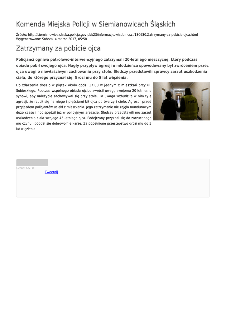 Komenda Miejska Policji w Siemianowicach Śląskich Źródło: http://siemianowice.slaska.policja.gov.pl/k23/informacje/wiadomosci/130680,Zatrzymany-za-pobicie-ojca.html Wygenerowano: Sobota, 4 marca 2017, 05:58 Zatrzymany za pobicie ojca Policjanci ogniwa patrolowo-interwencyjnego zatrzymali 20-letniego mężczyznę, który podczas obiadu pobił swojego ojca. Nagły przypływ agresji u młodzieńca spowodowany był zwróceniem przez ojca uwagi o niewłaściwym zachowaniu przy stole. Śledczy przedstawili sprawcy zarzut uszkodzenia ciała, do którego przyznał się. Grozi mu do 5 lat więzienia. Do zdarzenia doszło w piątek około godz. 17.00 w jednym z mieszkań przy ul. Sobieskiego. Podczas wspólnego obiadu ojciec zwrócił uwagę swojemu 20-letniemu synowi, aby należycie zachowywał się przy stole. Ta uwaga wzbudziła w nim tyle agresji, że rzucił się na niego i pięściami bił ojca po twarzy i ciele. Agresor przed przyjazdem policjantów uciekł z mieszkania. Jego zatrzymanie nie zajęło mundurowym dużo czasu i noc spędził już w policyjnym areszcie. Śledczy przedstawili mu zarzut uszkodzenia ciała swojego 45-letniego ojca. Podejrzany przyznał się do zarzucanego mu czynu i poddał się dobrowolnie karze. Za popełnione przestępstwo grozi mu do 5 lat więzienia. Ocena: 4/5 (1) Tweetnij