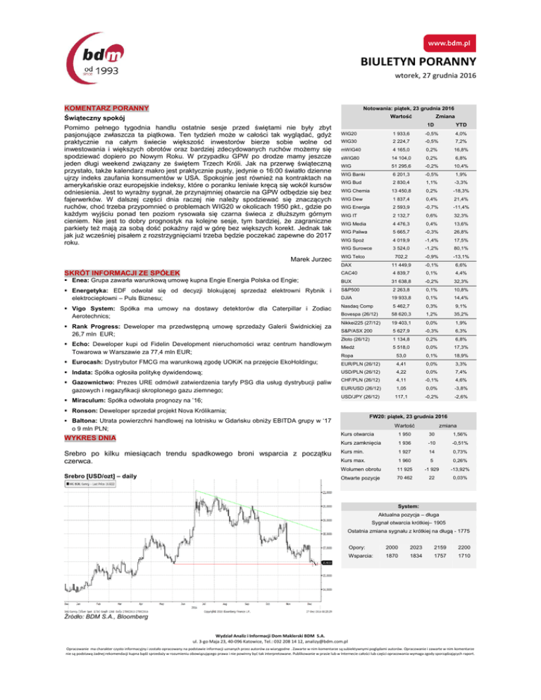 BIULETYN PORANNY wtorek, 27 grudnia 2016 KOMENTARZ PORANNY Notowania: piątek, 23 grudnia 2016 Wartość Świąteczny spokój Pomimo pełnego tygodnia handlu ostatnie sesje przed świętami nie były zbyt pasjonujące zwłaszcza ta piątkowa. Ten tydzień może w całości tak wyglądać, gdyż praktycznie na całym świecie większość inwestorów bierze sobie wolne od inwestowania i większych obrotów oraz bardziej zdecydowanych ruchów możemy się spodziewać dopiero po Nowym Roku. W przypadku GPW po drodze mamy jeszcze jeden długi weekend związany ze świętem Trzech Króli. Jak na przerwę świąteczną przystało, także kalendarz makro jest praktycznie pusty, jedynie o 16:00 światło dzienne ujrzy indeks zaufania konsumentów w USA. Spokojnie jest również na kontraktach na amerykańskie oraz europejskie indeksy, które o poranku leniwie kręcą się wokół kursów odniesienia. Jest to wyraźny sygnał, że przynajmniej otwarcie na GPW odbędzie się bez fajerwerków. W dalszej części dnia raczej nie należy spodziewać się znaczących ruchów, choć trzeba przypomnieć o problemach WIG20 w okolicach 1950 pkt., gdzie po każdym wyjściu ponad ten poziom rysowała się czarna świeca z dłuższym górnym cieniem. Nie jest to dobry prognostyk na kolejne sesje, tym bardziej, że zagraniczne parkiety też mają za sobą dość pokaźny rajd w górę bez większych korekt. Jednak tak jak już wcześniej pisałem z rozstrzygnięciami trzeba będzie poczekać zapewne do 2017 roku. Marek Jurzec Zmiana 1D YTD 4,0% WIG20 1 933,6 -0,5% WIG30 2 224,7 -0,5% 7,2% mWIG40 4 165,0 0,2% 16,8% sWIG80 14 104,0 0,2% 6,8% WIG 51 295,6 -0,2% 10,4% WIG Banki 6 201,3 -0,5% 1,9% WIG Bud 2 830,4 1,1% -3,3% WIG Chemia 13 450,8 0,2% -18,3% WIG Dew 1 837,4 0,4% 21,4% WIG Energia 2 593,9 -0,7% -11,4% WIG IT 2 132,7 0,6% 32,3% WIG Media 4 476,3 0,4% 13,6% WIG Paliwa 5 665,7 -0,3% 26,8% WIG Spoż 4 019,9 -1,4% 17,5% WIG Surowce 3 524,0 -1,2% 80,1% 702,2 -0,9% -13,1% 6,6% WIG Telco DAX 11 449,9 -0,1% SKRÓT INFORMACJI ZE SPÓŁEK CAC40 4 839,7 0,1% 4,4% Enea: Grupa zawarła warunkową umowę kupna Engie Energia Polska od Engie; BUX 31 638,8 -0,2% 32,3% Energetyka: EDF odwołał się od decyzji blokującej sprzedaż elektrowni Rybnik i elektrociepłowni – Puls Biznesu; S&P500 2 263,8 0,1% 10,8% DJIA 19 933,8 0,1% 14,4% Vigo System: Spółka ma umowy na dostawy detektorów dla Caterpillar i Zodiac Aerotechnics; Nasdaq Comp 5 462,7 0,3% 9,1% Bovespa (26/12) 58 620,3 1,2% 35,2% Rank Progress: Deweloper ma przedwstępną umowę sprzedaży Galerii Świdnickiej za 26,7 mln EUR; Nikkei225 (27/12) 19 403,1 0,0% 1,9% S&P/ASX 200 5 627,9 -0,3% 6,3% Złoto (26/12) 1 134,8 0,2% 6,8% Miedź 5 518,0 0,0% 17,3% Echo: Deweloper kupi od Fidelin Development nieruchomości wraz centrum handlowym Towarowa w Warszawie za 77,4 mln EUR; Ropa 53,0 0,1% 18,9% Eurocash: Dystrybutor FMCG ma warunkową zgodę UOKiK na przejęcie EkoHoldingu; EUR/PLN (26/12) 4,41 0,0% 3,3% Indata: Spółka ogłosiła politykę dywidendową; USD/PLN (26/12) 4,22 0,0% 7,4% Gazownictwo: Prezes URE odmówił zatwierdzenia taryfy PSG dla usług dystrybucji paliw gazowych i regazyfikacji skroplonego gazu ziemnego; CHF/PLN (26/12) 4,11 -0,1% 4,6% EUR/USD (26/12) 1,05 0,0% -3,8% Miraculum: Spółka odwołała prognozy na ’16; USD/JPY (26/12) 117,1 -0,2% -2,6% Ronson: Deweloper sprzedał projekt Nova Królikarnia; FW20: piątek, 23 grudnia 2016 Baltona: Utrata powierzchni handlowej na lotnisku w Gdańsku obniży EBITDA grupy w ‘17 Wartość o 9 mln PLN; WYKRES DNIA Srebro po kilku miesiącach trendu spadkowego broni wsparcia z początku czerwca. Srebro [USD/ozt] – daily zmiana Kurs otwarcia 1 950 30 1,56% Kurs zamknięcia 1 936 -10 -0,51% Kurs min. 1 927 14 0,73% Kurs max. 1 960 5 0,26% Wolumen obrotu 11 925 -1 929 -13,92% Otwarte pozycje 70 462 22 0,03% System: Aktualna pozycja – długa Sygnał otwarcia krótkiej– 1905 Ostatnia zmiana sygnału z krótkiej na długą - 1775 Opory: 2000 2023 2159 2200 Wsparcia: 1870 1834 1757 1710 Źródło: BDM S.A., Bloomberg Wydział Analiz i Informacji Dom Maklerski BDM S.A. ul. 3-go Maja 23, 40-096 Katowice, Tel.: 032 208 14 12, [email protected] Opracowanie ma charakter czysto informacyjny i zostało opracowany na podstawie informacji uznanych przez autorów za wiarygodne . Zawarte w nim komentarze są subiektywnymi poglądami autorów. Opracowanie i zawarte w nim komentarze nie są podstawą żadnej rekomendacji kupna bądź sprzedaży w rozumieniu obowiązującego prawa i nie powinny być tak interpretowane. Publikowanie w prasie lub w Internecie całości lub części opracowania wymaga zgody sporządzających raport. BIULETYN PORANNY wtorek, 27 grudnia 2016 GPW – PODSUMOWANIE Indeksy GPW FW20 (1,950.00, 1,960.00, 1,927.00, 1,936.00, -10.0000) 1950 1900 Open Low High Close WIG20 1 942,5 1 927,0 1 955,4 1 933,6 -0,5% 329 WIG30 2 241,4 2 218,5 2 246,2 2 224,7 -0,5% 363 MWIG40 4 166,7 14 054,2 14 104,0 4 165,0 0,2% 52 SWIG80 14 083,4 4 148,4 4 171,2 14 104,0 0,2% 22 WIG-PL 52 052,7 52 052,7 52 143,3 52 143,3 -0,2% 413 WIG 51 527,3 51 133,3 51 609,7 51 295,6 -0,3% 419 1850 WIG20 Alior 1800 1750 1700 1650 20 27 4 July 11 18 25 1 8 August 16 22 29 5 12 19 September 26 3 10 October 17 24 31 7 14 21 November 28 5 12 19 December 26 2 9 2017 WIG20 (1,942.49, 1,955.42, 1,927.03, 1,933.60, -10.1300) 1950 1900 1800 1750 1700 1650 20 27 4 July 11 18 25 1 8 August 16 22 29 5 12 19 September 26 3 10 October 17 24 31 7 14 21 November 28 5 12 19 December 26 2 9 2017 KOMENTARZ POPOŁUDNIOWY Przedświąteczne porządki na GPW Ostatnia sesja przed Świętami Bożego Narodzenia zwykle ma spokojny przebieg i w atmosferze niskiej zmienności i niewielkich obrotów inwestorzy wykonują ostatnie małe przedświąteczne porządki w portfelach. Dziś różnicą była potrzeba odreagowania wczorajszej euforii z końcówki sesji, która była reakcją na kolejny krok w stronę „pozytywnej” reformy OFE forsowanej przez wicepremie