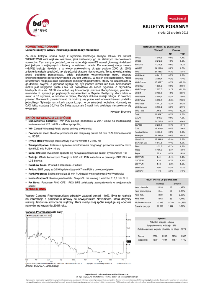 BIULETYN PORANNY środa, 21 grudnia 2016 KOMENTARZ PORANNY Notowania: wtorek, 20 grudnia 2016 Lokalne szczyty WIG20 i frustracja posiadaczy maluchów Za nami kolejna, udana sesja z wybiciem lokalnego szczytu. Blisko 1% wzrost WIG20/FW20 robi większe wrażenie, jeśli zestawimy go ze słabszym zachowaniem surowców. Tym samym grudzień, jak na razie, daje nam 8% wzrost głównego indeksu i jest jednym z najlepszych miesięcy w ostatnich latach. Do marcowej stopy zwrotu (+9,5%) brakuje niewiele, a to wtedy atakowaliśmy okrągły poziom 2000 pkt (38% zniesienia całych spadków), jak się później okazało nieskutecznie. Teraz również stoimy przed podobną perspektywą, gdzie pokonanie wspomnianego oporu stworzy średnioterminowe perspektywy ponad 300 pkt wzrostu. W takich okolicznościach, nieco sfrustrowani mogą się czuć posiadacze mniejszych podmiotów, którzy nie uczestniczą w grudniowej zwyżce, a płynność wydaje się być jeszcze niższa niż była. Kalendarium makro jest względnie puste i tak też pozostanie do końca tygodnia. Z czynników lokalnych dziś ok. 10:00 ma odbyć się konferencja prezesa Kaczyńskiego, premier i ministrów nt. sytuacji po piątkowych wydarzeniach w Sejmie. Polityczny klincz idzie w świat, a 13 stycznia, w dodatku w piątek, Moody’s dokona rewizji ratingu. Z nowości, premier Morawiecki poinformował, że kończą się prace nad wprowadzeniem podatku jednolitego. Sytuacja na rynkach zagranicznych o poranku jest neutralna. Kontrakty na DAX lekko spadają (-0,1%). Do Świąt pozostały 3 sesji i nic wielkiego nie powinno się wydarzyć. Krystian Brymora SKRÓT INFORMACJI ZE SPÓŁEK Budownictwo kolejowe: PKP PLK planuje podpisanie w 2017 umów na modernizację torów o wartości 26 mld PLN – Rzeczpospolita; Wartość Zmiana 1D YTD 4,4% WIG20 1 940,5 0,8% WIG30 2 242,0 1,0% 8,0% mWIG40 4 215,8 0,6% 18,2% sWIG80 14 101,6 0,2% 6,7% WIG 51 485,4 0,7% 10,8% WIG Banki 6 241,5 0,7% 2,5% WIG Bud 2 769,4 0,2% -5,4% WIG Chemia 13 462,7 0,3% -18,2% WIG Dew 1 838,0 0,6% 21,5% WIG Energia 2 607,5 3,1% -11,0% WIG IT 2 106,6 1,5% 30,7% WIG Media 4 450,7 -0,4% 12,9% WIG Paliwa 5 658,8 -0,8% 26,6% WIG Spoż 4 147,6 -0,4% 21,2% WIG Surowce 3 575,4 3,3% 82,7% 706,8 0,4% -12,5% DAX 11 464,7 0,3% 6,7% CAC40 4 849,9 0,6% 4,6% BUX 31 713,5 0,2% 32,6% WIG Telco S&P500 2 270,8 0,4% 11,1% WP: Zarząd Wirtualnej Polski przyjął politykę dywidendy; DJIA 19 974,6 0,5% 14,6% Producenci stali: Giełdowi producenci stali otrzymają prawie 30 mln PLN dofinansowania od NCBiR; Nasdaq Comp 5 483,9 0,5% 9,5% Bovespa 57 582,9 0,8% 32,8% Rynek stali: Produkcja stali surowej w XI’16 wzrosła o 24,9% r/r; Nikkei225 19 444,5 -0,3% 2,2% S&P/ASX 200 5 613,5 0,4% 6,0% Złoto 1 132,5 -0,7% 6,6% Miedź 5 496,0 -2,5% 16,8% Transport/paliwa: Ustawa o systemie monitorowania drogowego przewozu towarów może dać 54,23 mld PLN w 10 lat; Echo: RN Echo Investment zgodziła się na wypłatę zaliczki na poczet dywidendy za '16; Ropa 53,3 0,5% 19,5% Trakcja: Oferta konsorcjum Trakcji za 0,53 mld PLN najtańsza w przetargu PKP PLK na LCS Łowicz; EUR/PLN 4,41 -0,1% 3,4% USD/PLN 4,24 0,3% 8,1% Rainbow Tours: Wywiad z prezesem – Parkiet; CHF/PLN 4,13 -0,2% 5,2% EUR/USD 1,04 -0,4% -4,3% USD/JPY 117,8 0,9% -2,0% Pelion: EBIT grupy za 2016 będzie niższy o 9,7 mln PLN z powodu odpisów; Rank Progress: Spółka dokupi za 25 mln PLN udział w nieruchomość we Wrocławiu; Izostal/Stalprofil: Konsorcjum Izostalu i Stalprofilu ma umowę o wartości 118,9 mln PLN; PA Nova: Fundusze PKO OFE i PKO DFE zwiększyły zaangażowanie w akcjonariacie spółki; WYKRES DNIA Walory Conatus Pharmaceuticals zdrożały wczoraj ponad 140%. Była to reakcja na informacje o podpisaniu umowy ze szwajcarskim Novartisem, która dotyczy rozwoju leków na schorzenia wątroby. Kurs medycznej spółki znajduje się obecnie najwyżej od września 2015 roku. FW20: wtorek, 20 grudnia 2016 Wartość zmiana Kurs otwarcia 1 935 27 1,42% Kurs zamknięcia 1 944 15 0,78% Kurs min. 1 930 39 2,06% Kurs max. 1 952 22 1,14% Wolumen obrotu 13 446 -1 750 -11,52% Otwarte pozycje 69 516 1 222 1,79% Conatus Pharmaceuticals daily System: Aktualna pozycja – długa Sygnał otwarcia krótkiej– 1875 Ostatnia zmiana sygnału z krótkiej na długą - 1775 Opory: 2000 2200 2250 2300 Wsparcia: 1870 1834 1757 1710 Źródło: BDM S.A., Bloomberg Wydział Analiz i Informacji Dom Maklerski BDM S.A. ul. 3-go Maja 23, 40-096 Katowice, Tel.: 032 208 14 12, [email protected] Opracowanie ma charakter czysto informacyjny i zostało opracowany na podstawie informacji uznanych przez autorów za wiarygodne . Zawarte w nim komentarze są subiektywnymi poglądami autorów. Opracowanie i zawarte w nim komentarze nie są podstawą żadnej rekomendacji kupna bądź sprzedaży w rozumieniu obowiązującego prawa i nie powinny być tak interpretowane. Publikowanie w prasie lub w Internecie całości lub części opracowania wymaga zgody sporządzających raport. BIULETYN PORANNY środa, 21 grudnia 2016 GPW – PODSUMOWANIE Indeksy GPW FW20 (1,935.00, 1,952.00, 1,930.00, 1,944.00, +15.0000) 1950 1900 Open Low High Close WIG20 1 929,5 1 929,5 1 948,4 1 940,5 0,8% 652 WIG30 2 230,9 2 230,2 2 248,9 2 242,0 1,0% 821 MWIG40 4 195,5 14 029,7 14 101,6 4 215,8 0,6% 207 SWIG80 14 062,9 4 192,7 4 216,1 14 101,6 0,2% 23 WIG-PL 52 276,1 52 276,1 52 368,8 52 316,5 0,7% 891 WIG 51 294,6 51 275,6 51 576,2 51 485,4 0,7% 907 1850 WIG20 Alior 1800 1750 1700 1650 20 27 4 July 11 18 25 1 8 August 16 22 29 5 12 19 September 26 3 10 October 17 24 31 7 14 21 November 28 5 12 19 December 26 2 2017 WIG20 (1,929.47, 1,948.40, 1,929.47, 1,940.46, +15.7899) 1950 1900 1800 1750 1700 1650 20 27 4 July 11 18 25 1 8 August 16 22 29 5 12 19 September 26 3 10 October 17 24 31 7 14 November 21 28 5 12 19 December 26 2 2017 KOMENTARZ POPOŁUDNIOWY Zielony wtorek Wtorek był udanym dniem dla warszawskiego parkietu. Pomimo wczorajszych aktów terrorystycznych w Europie na giełdach dominował kolor z