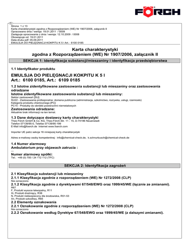 Strona 1 z 13 Karta charakterystyki zgodna z Rozporządzeniem (WE) Nr 1907/2006, załącznik II Opracowano dnia / wersja: 19.01.2011 / 0009 Zastępuje opracowanie z dnia / wersja: 12.10.2009 / 0008 Obowiązuje od: 19.01.2011 Data druku pdf: 05.09.2011 EMULSJA DO PIELĘGNACJI KOKPITU K 5 l Art.: 6100 0185 Karta charakterystyki zgodna z Rozporządzeniem (WE) Nr 1907/2006, załącznik II SEKCJA 1: Identyfikacja substancji/mieszaniny i identyfikacja przedsiębiorstwa 1.1 Identyfikator produktu EMULSJA DO PIELĘGNACJI KOKPITU K 5 l Art.: 6100 0185, Art.: 6109 0185 1.2 Istotne zidentyfikowane zastosowania substancji lub mieszaniny oraz zastosowania odradzane Istotne zidentyfikowane zastosowania substancji lub mieszaniny: Sektor zastosowań [SU]: SU22 - Zastosowania profesjonalne: domena publiczna (administracja, szkolnictwo, rozrywka, usługi, rzemiosło) Kategoria produktu chemicznego [PC]: PC15 - Produkty do obróbki powierzchni niemetalowych Zastosowania odradzane: Aktualnie brak informacji na ten temat. 1.3 Dane dotyczące dostawcy karty charakterystyki Theo Förch GmbH & Co. KG, Theo-Förch-Str. 11 - 15, D-74196 Neuenstadt Telefon 07139/95-0, Telefax 07139/95-199 E-Mail [email protected] Internet www.foerch.com Importer UE patrz sekcja 16 niniejszej karty charakterystyki Adres e-mailowy osoby kompetentnej: [email protected], [email protected] 1.4 Numer alarmowy Ambulatorium przy objawach zatrucia : --- Numer alarmowy spółki: Tel.: +49 (0) 700 / 24 112 112 (TFC) SEKCJA 2: Identyfikacja zagrożeń 2.1 Klasyfikacja substancji lub mieszaniny 2.1.1 Klasyfikacja zgodnie z rozporządzeniem (WE) Nr 1272/2008 (CLP) Nie oznaczono 2.1.2 Klasyfikacja zgodnie z dyrektywami 67/548/EWG oraz 1999/45/WE (łącznie ze zmianami). R67 F, Produkt wysoce łatwopalny, R11 Xi, Produkt drażniący, R38 N, Produkt niebezpieczny dla środowiska, R51-53 Xn, Produkt szkodliwy, R65 2.2 Elementy oznakowania 2.2.1 Oznakowanie zgodnie z rozporządzeniem (WE) Nr 1272/2008 (CLP) Nie oznaczono 2.2.2 Oznakowanie według Dyrektyw 67/548/EWG oraz 1999/45/WE (z dalszymi zmianami). Strona 2 z 13 Karta charakterystyki zgodna z Rozporządzeniem (WE) Nr 1907/2006, załącznik II Opracowano dnia / wersja: 19.01.2011 / 0009 Zastępuje opracowanie z dnia / wersja: 12.10.2009 / 0008 Obowiązuje od: 19.01.2011 Data druku pdf: 05.09.2011 EMULSJA DO PIELĘGNACJI KOKPITU K 5 l Art.: 6100 0185 Symbol ostrzegawczy: F/Xn/N Określenia niebezpieczeństwa: Produkt wysoce łatwopalny Produkt szkodliwy Produkt niebezpieczny dla środowiska Określenia zagrożeń (R): 11 Produkt wysoce łatwopalny. 38 Działa drażniąco na skórę. 51/53 Działa toksycznie na organizmy wodne może powodować długo utrzymujące się niekorzystne zmiany w środowisku wodnym. 65 Działa szkodliwie może powodować uszkodzenie płuc w przypadku połknięcia. 67 Pary mogą wywoływać uczucie senności i zawroty głowy. Określenia dotyczące prawidłowego postępowania (S): (2) Chronić przed dziećmi. 7 Przechowywać pojemnik szczelnie zamknięty. 16 Nie przechowywać w pobliżu źródeł zapłonu - nie palić tytoniu. 23 Nie wdychać pary. 26 Zanieczyszczone oczy przemyć natychmiast dużą ilością wody i zasięgnąć porady lekarza. 29/35 Nie wprowadzać do kanalizacji, a produkt i opakowanie usuwać w sposób bezpieczny. 33 Zastosować środki ostrożności zapobiegające wyładowaniom elektrostatycznym. 36/37/39 Nosić odpowiednią odzież ochronną, odpowiednie rękawice ochronne i okulary lub ochronę twarzy. 61 Unikać zrzutów do środowiska. Postępować zgodnie z instrukcją lub kartą charakterystyki. 62 W razie połknięcia nie wywoływać wymiotów, niezwłocznie zasięgnąć porady lekarza i pokazać opakowanie lub etykietę. Dodatki: Nafta (ropa naftowa) lekka hydrorafinowana Nafta (ropa naftowa), ciężki alkilat nafta o niskiej temperaturze wrzenia zmodyfikowana 2.3 Inne zagrożenia Mieszanina nie zawiera substancji vPvB (vPvB = very persistent, very bioaccumulative). Mieszanina nie zawiera substancji PBT (PBT = persistent, bioaccumulative, toxic) Użycie: możliwe powstanie wybuchowej mieszaniny parowo-powietrznej. SEKCJA 3: Skład/informacja o składnikach 3.1 Substancja n.s. 3.2 Mieszanina Nafta (ropa naftowa) lekka hydrorafinowana Numer rejestracji (ECHA) Index EINECS, ELINCS CAS Stęż.% Symbol ostrzegawczy Zwroty R Kategorie klasyfikacji / wskazania zagrożeń Klasa zagrożenia/Kategoria zagrożenia Flam. Liq./2 Skin Irrit./2 Aquatic Chronic/2 Asp. Tox./1 STOT SE/3 649-328-00-1 265-151-9 CAS 64742-49-0 40-80 F/Xn/Xi/N 11-38-51-53-65-67 Produkt drażniący, Produkt niebezpieczny dla środowiska, Produkt szkodliwy, Produkt wysoce łatwopalny Zwrot określający zagrożenie H225 H315 H411 H304 H336 Nafta (ropa naftowa), ciężki alkilat nafta o niskiej temperaturze wrzenia zmodyfikowana Numer rejestracji (ECHA) Index EINECS, ELINCS CAS Stęż.% Symbol ostrzegawczy 649-275-00-4 265-067-2 CAS 64741-65-7 5-10 Xn Strona 3 z 13 Karta charakterystyki zgodna z Rozporządzeniem (WE) Nr 1907/2006, załącznik II Opracowano dnia / wersja: 19.01.2011 / 0009 Zastępuje opracowanie z dnia / wersja: 12.10.2009 / 0008 Obowiązuje od: 19.01.2011 Data druku pdf: 05.09.2011 EMULSJA DO PIELĘGNACJI KOKPITU K 5 l Art.: 6100 0185 Zwroty R Kategorie klasyfikacji / wskazania zagrożeń Klasa zagrożenia/Kategoria zagrożenia Aquatic Chronic/4 Asp. Tox./1 53-65-66 Produkt niebezpieczny dla środowiska, Produkt szkodliwy Zwrot określający zagrożenie H413 H304 Tekst formuł R i H, a także ich kod klasyfikacji (GHS/CLP) patrz sekcja 16. SEKCJA 4: Środki pierwszej pomocy 4.1 Opis środków pierwszej pomocy Drogi oddechowe Mogą wystąpić: Nudności Dolegliwości żołądkowo-jelitowe Wymioty Zmęczenie Nieprzytomność Osobę usunąć z zagrożonej strefy. Osobie zapewnić dopływ świeżego powietrza, natychmiast wezwać lekarza. W przypadku utraty przytomności poszkodowanego położyć w stabilnej pozycji bocznej i bezzwłocznie zasięgnąć porady lekarskiej.