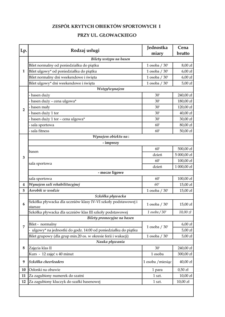 ZESPÓŁ KRYTYCH OBIEKTÓW SPORTOWYCH I PRZY UL. GŁOWACKIEGO Lp. Jednostka miary Rodzaj usługi Cena brutto Bilety wstępu na basen 1 Bilet normalny od poniedziałku do piątku 1 osoba / 30' 8,00 zł Bilet ulgowy* od poniedziałku do piątku 1 osoba / 30' 6,00 zł Bilet normalny dni weekendowe i święta 1 osoba / 30' 6,00 zł 1 osoba / 30' 5,00 zł Bilet ulgowy* dni weekendowe i święta Wstęp/wynajem 2 - basen duży 30' 240,00 zł - basen duży – cena ulgowa* 30' 180,00 zł - basen mały 30' 120,00 zł - basen duży 1 tor 30' 40,00 zł - basen duży 1 tor – cena ulgowa* 30' 30,00 zł - sala sportowa 60' 80,00 zł - sala fitness 60' 50,00 zł 60' 500,00 zł Wynajem obiektu na : - imprezy basen dzień 3 60' sala sportowa dzień 5 000,00 zł 100,00 zł 1 000,00 zł - mecze ligowe sala sportowa 60' 100,00 zł 4 Wynajem sali rehabilitacyjnej 60' 15,00 zł 5 Aerobik w wodzie 1 osoba / 30' 15,00 zł 6 Szkółka pływacka Szkółka pływacka dla uczniów klasy IV-VI szkoły podstawowej i starsze Szkółka pływacka dla uczniów klas III szkoły podstawowej 1 osoba / 30' 15,00 zł 1 osoba / 30' 10,00 zł Bilety promocyjne na basen 7 Bilet - normalny - ulgowy* na jednostki do godz. 14:00 od poniedziałku do piątku Bilet grupowy (dla grup min.20 os. w okresie ferii i wakacji) 1 osoba / 30' 1 osoba / 30' 6,00 zł 5,00 zł 5,00 zł Nauka pływania 8 Zajęcia klas II Kurs - 12 zajęć x 40 minut 9 Szkółka cheerleaders 30' 240,00 zł 1 osoba 300,00 zł 1 osoba /miesiąc 40,00 zł 10 Osłonki na obuwie 1 para 11 Za zagubiony numerek do szatni 1 szt. 12 Za zagubiony kluczyk do szafki basenowej 1 szt. 0,50 zł 10,00 zł 10,00 zł Dzieci do lat 4 bezpłatnie * Bilet /wstęp/ wynajem ulgowy - dzieci i młodzież ucząca się w wieku 4-25 lat, osoby powyżej 60 lat oraz osoby o znacznym stopniu niepełnosprawności na podstawie orzeczenia ustalającego stopień niepełnosprawności i legitymacji dokumentującej niepełnosprawność i ich opiekunów oraz opiekunów dzieci niepełnosprawnych do lat 16 posiadających orzeczenie o niepełnosprawności i legitymację potwierdzającą niepełnosprawność. 50% zniżki od ceny biletu wstępu dla osób posiadających Kartę Dużej Rodziny zgodnie z uchwałą XLI/715/13 w sprawie zasad korzystania z niektórych obiektów i urządzeń użyteczności publicznej, sposobu ustalania opłat za korzystanie z nich oraz powierzenia Prezydentowi Olsztyna uprawnienia do stanowienia o ich wysokości Akcje promocyjne i marketingowe OSiR - druga jednostka gratis lub do 50% zniżki Dla publicznych jednostek oświatowych cena netto.