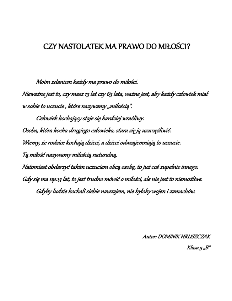 CZY NASTOLATEK MA PRAWO DO MIŁOŚCI? Moim zdaniem każdy ma prawo do miłości. Nieważne jest to, czy masz 13 lat czy 63 lata, ważne jest, aby każdy człowiek miał w sobie to uczucie , które nazywamy ,,miłością”. Człowiek kochający staje się bardziej wrażliwy. Osoba, która kocha drugiego człowieka, stara się ją uszczęśliwić. Wiemy, że rodzice kochają dzieci, a dzieci odwzajemniają to uczucie. Tą miłość nazywamy miłością naturalną. Natomiast obdarzyć takim uczuciem obcą osobę, to już coś zupełnie innego. Gdy się ma np.13 lat, to jest trudno mówić o miłości, ale nie jest to niemożliwe. Gdyby ludzie kochali siebie nawzajem, nie byłoby wojen i zamachów. Autor: DOMINIK HRUSZCZAK Klasa 5 „B”