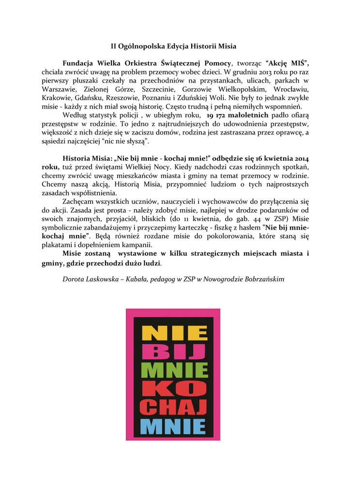 II Ogólnopolska Edycja Historii Misia Fundacja Wielka Orkiestra Świątecznej Pomocy, tworząc “Akcję MIŚ”, chciała zwrócić uwagę na problem przemocy wobec dzieci. W grudniu 2013 roku po raz pierwszy pluszaki czekały na przechodniów na przystankach, ulicach, parkach w Warszawie, Zielonej Górze, Szczecinie, Gorzowie Wielkopolskim, Wrocławiu, Krakowie, Gdańsku, Rzeszowie, Poznaniu i Zduńskiej Woli. Nie były to jednak zwykłe misie - każdy z nich miał swoją historię. Często trudną i pełną niemiłych wspomnień. Według statystyk policji , w ubiegłym roku, 19 172 małoletnich padło ofiarą przestępstw w rodzinie. To jedno z najtrudniejszych do udowodnienia przestępstw, większość z nich dzieje się w zaciszu domów, rodzina jest zastraszana przez oprawcę, a sąsiedzi najczęściej “nic nie słyszą”. Historia Misia: „Nie bij mnie - kochaj mnie!” odbędzie się 16 kwietnia 2014 roku, tuż przed świętami Wielkiej Nocy. Kiedy nadchodzi czas rodzinnych spotkań, chcemy zwrócić uwagę mieszkańców miasta i gminy na temat przemocy w rodzinie. Chcemy naszą akcją, Historią Misia, przypomnieć ludziom o tych najprostszych zasadach współistnienia. Zachęcam wszystkich uczniów, nauczycieli i wychowawców do przyłączenia się do akcji. Zasada jest prosta - należy zdobyć misie, najlepiej w drodze podarunków od swoich znajomych, przyjaciół, bliskich (do 11 kwietnia, do gab. 44 w ZSP) Misie symbolicznie zabandażujemy i przyczepimy karteczkę - fiszkę z hasłem "Nie bij mniekochaj mnie”. Będą również rozdane misie do pokolorowania, które staną się plakatami i dopełnieniem kampanii. Misie zostaną wystawione w kilku strategicznych miejscach miasta i gminy, gdzie przechodzi dużo ludzi. Dorota Laskowska – Kabała, pedagog w ZSP w Nowogrodzie Bobrzańskim
