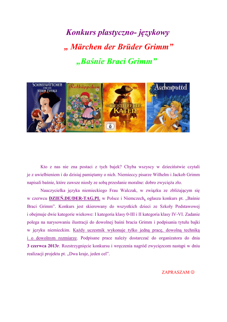 Konkurs plastyczno- językowy „ Märchen der Brüder Grimm” „Baśnie Braci Grimm” Kto z nas nie zna postaci z tych bajek? Chyba wszyscy w dzieciństwie czytali je z uwielbieniem i do dzisiaj pamiętamy o nich. Niemieccy pisarze Wilhelm i Jackob Grimm napisali baśnie, które zawsze niosły ze sobą przesłanie moralne: dobro zwycięża zło. Nauczycielka języka niemieckiego Frau Walczak, w związku ze zbliżającym się w czerwcu DZIEŃ.DE/DER-TAG.PL w Polsce i Niemczech, ogłasza konkurs pt. „Baśnie Braci Grimm”. Konkurs jest skierowany do wszystkich dzieci ze Szkoły Podstawowej i obejmuje dwie kategorie wiekowe: I kategoria klasy 0-III i II kategoria klasy IV-VI. Zadanie polega na narysowaniu ilustracji do dowolnej baśni bracia Grimm i podpisania tytułu bajki w języku niemieckim. Każdy uczestnik wykonuje tylko jedną pracę, dowolną techniką i o dowolnym rozmiarze. Podpisane prace należy dostarczać do organizatora do dnia 3 czerwca 2013r. Rozstrzygnięcie konkursu i wręczenia nagród zwycięzcom nastąpi w dniu realizacji projektu pt. „Dwa kraje, jeden cel”. ZAPRASZAM