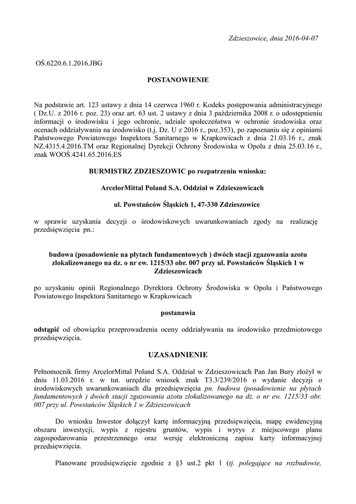 Zdzieszowice, dnia 2016-04-07 OŚ.6220.6.1.2016.JBG POSTANOWIENIE Na podstawie art. 123 ustawy z dnia 14 czerwca 1960 r. Kodeks postępowania administracyjnego ( Dz.U. z 2016 r. poz. 23) oraz art. 63 ust. 2 ustawy z dnia 3 października 2008 r. o udostępnieniu informacji o środowisku i jego ochronie, udziale społeczeństwa w ochronie środowiska oraz ocenach oddziaływania na środowisko (t.j. Dz. U z 2016 r., poz.353), po zapoznaniu się z opiniami Państwowego Powiatowego Inspektora Sanitarnego w Krapkowicach z dnia 21.03.16 r., znak NZ.4315.4.2016.TM oraz Regionalnej Dyrekcji Ochrony Środowiska w Opolu z dnia 25.03.16 r., znak WOOŚ.4241.65.2016.ES BURMISTRZ ZDZIESZOWIC po rozpatrzeniu wniosku: ArcelorMittal Poland S.A. Oddział w Zdzieszowicach ul. Powstańców Śląskich 1, 47-330 Zdzieszowice w sprawie uzyskania decyzji o środowiskowych uwarunkowaniach zgody na przedsięwzięcia pn.: realizację budowa (posadowienie na płytach fundamentowych ) dwóch stacji zgazowania azotu zlokalizowanego na dz. o nr ew. 1215/33 obr. 007 przy ul. Powstańców Śląskich 1 w Zdzieszowicach po uzyskaniu opinii Regionalnego Dyrektora Ochrony Środowiska w Opolu i Państwowego Powiatowego Inspektora Sanitarnego w Krapkowicach postanawia odstąpić od obowiązku przeprowadzenia oceny oddziaływania na środowisko przedmiotowego przedsięwzięcia. UZASADNIENIE Pełnomocnik firmy ArcelorMittal Poland S.A. Oddział w Zdzieszowicach Pan Jan Bury złożył w dniu 11.03.2016 r. w tut. urzędzie wniosek znak T3.3/239/2016 o wydanie decyzji o środowiskowych uwarunkowaniach dla przedsięwzięcia pn. budowa (posadowienie na płytach fundamentowych ) dwóch stacji zgazowania azotu zlokalizowanego na dz. o nr ew. 1215/33 obr. 007 przy ul. Powstańców Śląskich 1 w Zdzieszowicach Do wniosku Inwestor dołączył kartę informacyjną przedsięwzięcia, mapę ewidencyjną obszaru inwestycji, wypis z rejestru gruntów, wypis i wyrys z miejscowego planu zagospodarowania przestrzennego oraz wersję elektroniczną zapisu karty informacyjnej przedsięwzięcia. Planowane przedsięwzięcie zgodnie z §3 ust.2 pkt 1 (tj. polegające na rozbudowie, przebudowie lub montażu realizowanego lub zrealizowanego przedsięwzięcia wymienionego w §2 ust.1 i niespełniające kryteriów, o których mowa w §2 ust. 2 pkt 1), w związku z §2 ust. 1 pkt 17 (koksownie inne niż wymienione w pkt 23) oraz §3 ust. 1 pkt 37 (instalacje do naziemnego magazynowania ropy naftowej, produktów naftowych, substancji lub mieszanin w rozumieniu przepisów ustawy z dnia 25 lutego 2011 r. o substancjach chemicznych i ich mieszaninach, niebędących produktami spożywczymi, gazów łatwopalnych oraz innych kopalnych surowców energetycznych, inne niż wymienione w §2 ust. 1 pkt 22, z wyłączeniem instalacji do magazynowania paliw wykorzystywanych na potrzeby gospodarstw domowych, zbiorników na gaz płynny o łącznej pojemności nie większej niż 10 m3 oraz zbiorników na olej o łącznej pojemności nie większej niż 3 m3, a także niezwiązanych z dystrybucją instalacji do magazynowania stałych surowców energetycznych) rozporządzenia Rady Ministrów z dnia 9 listopada 2010 r. w sprawie przedsięwzięć mogących znacząco oddziaływać na środowisko (Dz. U. z 2016 r. poz. 71) zostało zakwalifikowane do przedsięwzięć mogących potencjalnie znacząco oddziaływać na środowisko. W związku z powyższym Burmistrz Zdzieszowic, działając zgodnie z art. 64 ust. 1 pkt 1 i 2 ustawy z dnia 3 października 2008 r. o udostępnieniu informacji o środowisku i jego ochronie, udziale społeczeństwa w ochronie środowiska oraz ocenach oddziaływania na środowisko (t.j. Dz. U z 2016 r., poz.353), pismem z dnia 14.03.2016 r. znak OŚ.6220.6.2016.JBG, wystąpił do Państwowego Powiatowego Inspektora Sanitarnego w Krapkowicach oraz do Regionalnego Dyrektora Ochrony Środowiska w Opolu o wydanie opinii co do konieczności przeprowadzenia oceny oddziaływania na środowisko przedmiotowego przedsięwzięcia. W odpowiedzi Państwowy Powiatowy Inspektor Sanitarny w Krapkowicach w piśmie (opinii sanitarnej) z dnia 21.03.16 r. (data wpływu do tut. urzędu 29.03.16 r.) znak NZ.4315.4.2016.TM wniósł o odstąpienie od potrzeby przeprowadzenia oceny oddziaływania ww. przedsięwzięcia na środowisko. Regionalny Dyrektor Ochrony Środowiska w Opolu w piśmie znak WOOŚ.4241.65.2016.ES z dnia 25.03.16 r. (data wpływu do tut. urzędu 25.03.16 r.) wyraził opinię, iż dla przedmiotowego przedsięwzięcia nie istnieje potrzeba przeprowadzenia oceny oddziaływania na środowisko. Organ zważył co następuje: - przedsięwzięcie będzie realizowane na działce ew. nr 1215/33, k.m.9 obręb Zdzieszowice dla której obowiązuje miejscowy plan zagospodarowania przestrzennego dla m. Zdzieszowice uchwalony przez Radę Miejską w Zdzieszowicach uchwałą Nr LII/419/2002 z dnia 10.10.02 r. Zgodnie z w/w planem teren inwestycji znajduje się na obszarze oznaczonym symbolem PP-tereny przemysłowe; - w ramach inwestycji przewiduje się realizację dwóch stacji do zgazowania azotu; - instalacja magazynowania i zgazowania azotu będzie instalacją pomocniczą dla realizowanego obecnie na wydziale węglopochodnych zadania pn. modernizacja wydziału węglopochodnych; - planowane przedsięwzięcie nie wpłynie na wzrost produkcji na eksploatowanych instalacjach; - podczas realizacji inwestycji może występować lokalny, krótkotrwały wzrost emisji zanieczyszczeń do powietrza spowodowany pracą maszyn i urządzeń oraz transportem materiałów (uciążliwość będzie miała charakter krótkotrwały i ustanie z chwilą zakończenia prac); - realizacja przedsięwzięcia nie wpłynie na zmianę wielkości emisji zanieczyszczeń z instalacji (azot będzie stosowany jako gaz inertny, przy przeładunku niewielka ilość azotu może przedostawać się do powietrza atmosferycznego); - na etapie realizacji przedsięwzięcia może wystąpić wzrost poziomu natężenia hał