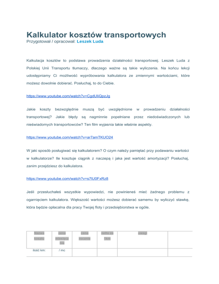Kalkulator kosztów transportowych Przygotował / opracował: Leszek Luda Kalkulacja kosztów to podstawa prowadzenia działalności transportowej. Leszek Luda z Polskiej Unii Transportu tłumaczy, dlaczego ważne są takie wyliczenia. Na końcu lekcji udostępniamy Ci możliwość wypróbowania kalkulatora ze zmiennymi wartościami, które możesz dowolnie dobierać. Posłuchaj, to do Ciebie. https://www.youtube.com/watch?v=CgdUIiQpzJg Jakie koszty bezwzględnie muszą być transportowej? Jakie błędy są nagminnie uwzględnione w popełniane przez prowadzeniu działalności niedoświadczonych lub nieświadomych transportowców? Ten film wyjasnia takie właśnie aspekty. https://www.youtube.com/watch?v=ar7amTKUO24 W jaki sposób posługiwać się kalkulatorem? O czym należy pamiętać przy podawaniu wartości w kalkulatorze? Ile kosztuje ciągnik z naczepą i jaka jest wartość amortyzacji? Posłuchaj, zanim przejdziesz do kalkulatora. https://www.youtube.com/watch?v=s7lU0F xRz8 Jeśli przesłuchałeś wszystkie wypowiedzi, nie powinieneś mieć żadnego problemu z ogarnięciem kalkulatora. Większość wartości możesz dobierać samemu by wyliczyć stawkę, która będzie opłacalna dla pracy Twojej floty i przedsiębiorstwa w ogóle. Nazwa cena cena netto za kosztu miesięcz nie rocznie 1km ilość km: / mc uwagi paliwo (cena brutto) za 1l spalanie /100km Viatoll podatek 1750x2 drogowy OCP na jeden samochód OC + AC Amortyzacja kwota lat Wynagrodze nie ZUS koszty pracodawcy ZUS koszty pracownika podatek doch. Pracownika Diety Telefony Materiały oleje,płyny,filtry, przeglądy eksploatacyj ne bez paliwa rejestracyjne, rocznie Opony komplet na 250 tys Inne puste % przejazdy samochodowego, jako przejazdy na naprawy, dojazdy z bazy na załadunek itp. cena za 1km Zysk na 1km wartość wyliczona przez instytut transportu % Cena z zyskiem na 1km