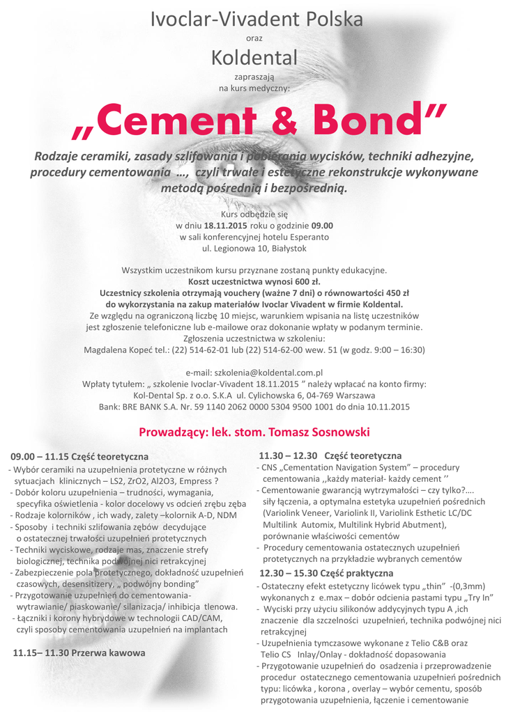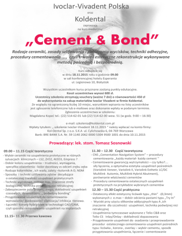 Ivoclar-Vivadent Polska oraz Koldental zapraszają na kurs medyczny: „Cement & Bond” Rodzaje ceramiki, zasady szlifowania i pobierania wycisków, techniki adhezyjne, procedury cementowania …, czyli trwałe i estetyczne rekonstrukcje wykonywane metodą pośrednią i bezpośrednią. Kurs odbędzie się w dniu 18.11.2015 roku o godzinie 09.00 w sali konferencyjnej hotelu Esperanto ul. Legionowa 10, Białystok Wszystkim uczestnikom kursu przyznane zostaną punkty edukacyjne. Koszt uczestnictwa wynosi 600 zł. Uczestnicy szkolenia otrzymają vouchery (ważne 7 dni) o równowartości 450 zł do wykorzystania na zakup materiałów Ivoclar Vivadent w firmie Koldental. Ze względu na ograniczoną liczbę 10 miejsc, warunkiem wpisania na listę uczestników jest zgłoszenie telefoniczne lub e-mailowe oraz dokonanie wpłaty w podanym terminie. Zgłoszenia uczestnictwa w szkoleniu: Magdalena Kopeć tel.: (22) 514-62-01 lub (22) 514-62-00 wew. 51 (w godz. 9:00 – 16:30) e-mail: [email protected] Wpłaty tytułem: „ szkolenie Ivoclar-Vivadent 18.11.2015 ” należy wpłacać na konto firmy: Kol-Dental Sp. z o.o. S.K.A ul. Cylichowska 6, 04-769 Warszawa Bank: BRE BANK S.A. Nr. 59 1140 2062 0000 5304 9500 1001 do dnia 10.11.2015 Prowadzący: lek. stom. Tomasz Sosnowski 09.00 – 11.15 Część teoretyczna 11.30 – 12.30 Część teoretyczna - Wybór ceramiki na uzupełnienia protetyczne w różnych sytuacjach klinicznych – LS2, ZrO2, Al2O3, Empress ? - Dobór koloru uzupełnienia – trudności, wymagania, specyfika oświetlenia - kolor docelowy vs odcień zrębu zęba - Rodzaje kolorników , ich wady, zalety –kolornik A-D, NDM - Sposoby i techniki szlifowania zębów decydujące o ostatecznej trwałości uzupełnień protetycznych - Techniki wyciskowe, rodzaje mas, znaczenie strefy biologicznej, technika podwójnej nici retrakcyjnej - Zabezpieczenie pola protetycznego, dokładność uzupełnień czasowych, desensitizery, „ podwójny bonding” - Przygotowanie uzupełnień do cementowaniawytrawianie/ piaskowanie/ silanizacja/ inhibicja tlenowa. - Łączniki i korony hybrydowe w technologii CAD/CAM, czyli sposoby cementowania uzupełnień na implantach - CNS „Cementation Navigation System” – procedury cementowania ,,każdy materiał- każdy cement ’’ - Cementowanie gwarancją wytrzymałości – czy tylko?…. siły łączenia, a optymalna estetyka uzupełnień pośrednich (Variolink Veneer, Variolink II, Variolink Esthetic LC/DC Multilink Automix, Multilink Hybrid Abutment), porównanie właściwości cementów - Procedury cementowania ostatecznych uzupełnień protetycznych na przykładzie wybranych cementów 11.15– 11.30 Przerwa kawowa 12.30 – 15.30 Część praktyczna - Ostateczny efekt estetyczny licówek typu „thin” -(0,3mm) wykonanych z e.max – dobór odcienia pastami typu „Try In” - Wyciski przy użyciu silikonów addycyjnych typu A ,ich znaczenie dla szczelności uzupełnień, technika podwójnej nici retrakcyjnej - Uzupełnienia tymczasowe wykonane z Telio C&B oraz Telio CS Inlay/Onlay - dokładność dopasowania - Przygotowanie uzupełnień do osadzenia i przeprowadzenie procedur ostatecznego cementowania uzupełnień pośrednich typu: licówka , korona , overlay – wybór cementu, sposób przygotowania uzupełnienia, łączenie i cementowanie