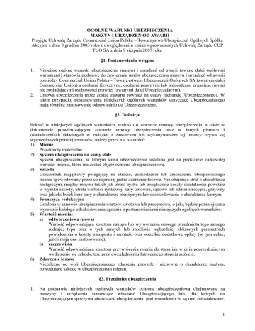 OGÓLNE WARUNKI UBEZPIECZENIA MASZYN I URZĄDZEŃ OD AWARII Przyjęte Uchwałą Zarządu Commercial Union Polska – Towarzystwo Ubezpieczeń Ogólnych Spółka Akcyjna z dnia 8 grudnia 2003 roku z uwzględnienim zmian wprowadzonych Uchwałą Zarządu CUP TUO SA z dnia 9 sierpnia 2007 roku §1. Postanowienia wstępne 1. 2. Niniejsze ogólne warunki ubezpieczenia maszyn i urządzeń od awarii (zwane dalej ogólnymi warunkami) stanowią podstawę do zawierania umów ubezpieczenia maszyn i urządzeń od awarii pomiędzy Commercial Union Polska - Towarzystwem Ubezpieczeń Ogólnych SA (zwanym dalej Commercial Union) a osobami fizycznymi, osobami prawnymi lub jednostkami organizacyjnymi nie posiadającymi osobowości prawnej (zwanymi dalej Ubezpieczającym). Umowa ubezpieczenia może zostać zawarta również na cudzy rachunek (Ubezpieczonego). W takim przypadku postanowienia niniejszych ogólnych warunków dotyczące Ubezpieczającego mają również zastosowanie odpowiednio do Ubezpieczonego. §2. Definicje Ilekroć w niniejszych ogólnych warunkach, wniosku o zawarcie umowy ubezpieczenia, a także w dokumencie potwierdzającym zawarcie umowy ubezpieczenia oraz w innych pismach i oświadczeniach składanych w związku z zawarciem lub wykonywaniem tej umowy używa się wymienionych poniżej terminów, należy przez nie rozumieć: 1) Mienie Przedmioty materialne. 2) System ubezpieczenia na sumy stałe System ubezpieczenia, w którym suma ubezpieczenia ustalana jest na podstawie całkowitej wartości mienia, które ma zostać objęte ochroną ubezpieczeniową. 3) Szkoda Uszczerbek majątkowy polegający na utracie, uszkodzeniu lub zniszczeniu ubezpieczonego mienia spowodowany przez co najmniej jedno zdarzenie losowe. Nie obejmuje strat o charakterze następczym, między innymi takich jak utrata zysku lub zwiększone koszty działalności powstałe w wyniku szkody, utrata wartości rynkowej, kary umowne, sądowe lub administracyjne, grzywny oraz jakiekolwiek inne kary o charakterze pieniężnym lub odszkodowania o charakterze karnym. 4) Franszyza redukcyjna Ustalona w umowie ubezpieczenia wartość kwotowa lub procentowa, o jaką będzie pomniejszana wysokość każdego odszkodowania zgodnie z postanowieniami niniejszych ogólnych warunków. 5) Wartość mienia: a) odtworzeniowa (nowa) Wartość odpowiadająca kosztom zakupu lub wytworzenia nowego przedmiotu tego samego rodzaju, typu oraz o tych samych lub możliwie najbardziej zbliżonych parametrach powiększona o koszty transportu i montażu oraz wszelkie dodatkowe opłaty (w tym celne, jeżeli mają one zastosowanie), b) rzeczywista Wartość odpowiadająca kosztom przywrócenia mienia do stanu jak w dniu poprzedzającym wydarzenie się szkody, tzn. przy uwzględnieniu faktycznego stopnia zużycia. 6) Zdarzenie losowe Niezależne od woli Ubezpieczającego zdarzenie przyszłe i niepewne o charakterze nagłym, powodujące szkodę w ubezpieczonym mieniu. §3. Przedmiot ubezpieczenia 1. Na podstawie niniejszych ogólnych warunków ochroną ubezpieczeniową obejmowane są maszyny i urządzenia stanowiące własność Ubezpieczającego lub, dla których na Ubezpieczającym spoczywa obowiązek ubezpieczenia, pod warunkiem że są one zainstalowane, 1 2. 3. gotowe do eksploatacji po pozytywnym zakończeniu okresu rozruchu próbnego i testów, co oznacza, że ich normalne działanie zostało rozpoczęte lub może być rozpoczęte w razie potrzeby. Maszyny i urządzenia pozostają objęte ochroną ubezpieczeniową niezależnie od tego, czy znajdują się w ruchu czy w spoczynku, są zdemontowane w celu oczyszczenia, przeglądu lub remontu, są w trakcie wymienionych operacji lub podczas ponownego montażu w tym podczas rozruchu próbnego i testów związanych z takim ponownym montażem. Maszyny i urządzenia objęte ochroną ubezpieczeniową pozostają wyszczególnione w dokumencie potwierdzającym zawarcie umowy ubezpieczenia. Commercial Union nie obejmuje ochroną ubezpieczeniową następującego mienia: 1) maszyn lub urządzeń użytkowanych na terenie elektrowni jądrowych lub też w innych obiektach lub zakładach w celu produkcji, przechowywania, obróbki lub przygotowania paliwa jądrowego, odpadów lub innych materiałów radioaktywnych, 2) maszyn lub urządzeń pracujących pod ziemią. §4. Miejsce ubezpieczenia 1. 2. Mienie, o którym mowa w §3 ust. 1, pozostaje objęte ubezpieczeniem w miejscu określonym w dokumencie potwierdzającym zawarcie umowy ubezpieczenia. W razie zajścia zdarzenia losowego objętego umową ubezpieczenia, powodującego bezpośrednie zagrożenie mienia objętego ochroną ubezpieczeniową i podjęcia działań mających na celu niedopuszczenie do powstania szkody lub zwiększenia się jej rozmiaru, w wyniku których mienie zostanie usunięte z miejsca ubezpieczenia, jest ono objęte ochroną ubezpieczeniową w nowej lokalizacji, do której zostało przeniesione przez okres nie dłuższy niż 10 dni od daty przeniesienia. Warunkiem jest niezwłoczne pisemne zgłoszenie do Commercial Union faktu przeniesienia mienia. Powyższy okres może zostać przedłużony po uzyskaniu przez Commercial Union pisemnego wniosku od Ubezpieczającego dotyczącego chęci takiego przedłużenia i potwierdzeniu tego faktu przez Commercial Union. §5. Zakres ubezpieczenia 1. 2. Ochroną ubezpieczeniową objęte są wszelkie szkody, powstałe w przedmiocie ubezpieczenia w miejscu i w trakcie okresu ubezpieczenia wskazanych w dokumencie potwierdzającym zawarcie umowy ubezpieczenia w wyniku zaistnienia jakichkolwiek zdarzeń losowych, z zastrzeżeniem wyłączeń zawartych w niniejszych ogólnych warunkach. Ochrona ubezpieczeniowa obejmuje w szczególności szkody powstałe w następstwie: 1) niewłaściwej obsługi maszyn i urządzeń, tj. nieostrożności, zaniedbania, niewłaściwego użytkowania, braku kwalifikacji, błędu operatora, 2) wady odlewniczej, materiałowej oraz wadliwego wykonania, 3) wybuchu fizycznego, 4) błędów kons