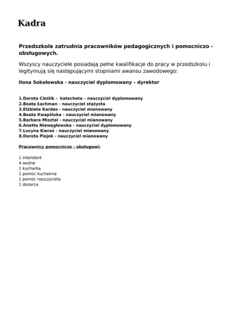 Kadra Przedszkole zatrudnia pracowników pedagogicznych i pomocniczo obsługowych. Wszyscy nauczyciele posiadają pełne kwalifikacje do pracy w przedszkolu i legitymują się następującymi stopniami awansu zawodowego: Ilona Sokołowska - nauczyciel dyplomowany – dyrektor 1.Dorota Cieślik - katecheta – nauczyciel dyplomowany 2.Beata Łachman - nauczyciel stażysta 3.Elżbieta Kardas - nauczyciel mianowany 4.Beata Kwapińska - nauczyciel mianowany 5.Barbara Misztal - nauczyciel mianowany 6.Anetta Niewęgłowska - nauczyciel dyplomowany 7.Lucyna Kieraś - nauczyciel mianowany 8.Dorota Piejek - nauczyciel mianowany Pracownicy pomocniczo - obsługowi: 1 intendent 4 woźne 1 kucharka 1 pomoc kuchenna 1 pomoc nauczyciela 1 dozorca