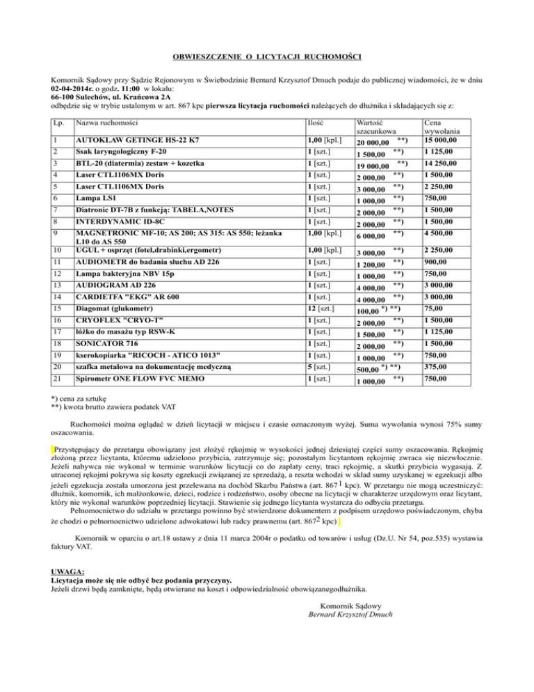 OBWIESZCZENIE O LICYTACJI RUCHOMOŚCI Komornik Sądowy przy Sądzie Rejonowym w Świebodzinie Bernard Krzysztof Dmuch podaje do publicznej wiadomości, że w dniu 02-04-2014r. o godz. 11:00 w lokalu: 66-100 Sulechów, ul. Krańcowa 2A odbędzie się w trybie ustalonym w art. 867 kpc pierwsza licytacja ruchomości należących do dłużnika i składających się z: Lp. Nazwa ruchomości Ilość Wartość szacunkowa 1 AUTOKLAW GETINGE HS-22 K7 1,00 [kpl.] 2 Ssak laryngologiczny F-20 1 [szt.] 20 000,00 **) 1 500,00 **) 3 BTL-20 (diatermia) zestaw + kozetka 1 [szt.] 4 Laser CTL1106MX Doris 1 [szt.] 5 Laser CTL1106MX Doris 1 [szt.] 6 Lampa LS1 1 [szt.] 7 Diatronic DT-7B z funkcją: TABELA,NOTES 1 [szt.] 8 INTERDYNAMIC ID-8C 9 10 MAGNETRONIC MF-10; AS 200; AS 315: AS 550; leżanka L10 do AS 550 UGUL + osprzęt (fotel,drabinki,ergometr) 11 AUDIOMETR do badania słuchu AD 226 1 [szt.] 12 Lampa bakteryjna NBV 15p 1 [szt.] 13 AUDIOGRAM AD 226 1 [szt.] 14 CARDIETFA "EKG" AR 600 1 [szt.] 15 Diagomat (glukometr) 12 [szt.] 16 CRYOFLEX "CRYO-T" 1 [szt.] 17 łóżko do masażu typ RSW-K 1 [szt.] 18 SONICATOR 716 1 [szt.] 19 kserokopiarka "RICOCH - ATICO 1013" 1 [szt.] 20 szafka metalowa na dokumentację medyczną 5 [szt.] 21 Spirometr ONE FLOW FVC MEMO 1 [szt.] Cena wywołania 15 000,00 1 125,00 19 000,00 **) 2 000,00 **) 14 250,00 3 000,00 **) 1 000,00 **) 2 250,00 1 500,00 1 [szt.] 2 000,00 **) 2 000,00 **) 1,00 [kpl.] 6 000,00 **) 4 500,00 1,00 [kpl.] 3 000,00 **) 1 200,00 **) 2 250,00 1 000,00 **) 4 000,00 **) 750,00 4 000,00 **) 100,00 *) **) 3 000,00 2 000,00 **) 1 500,00 **) 1 500,00 2 000,00 **) 1 000,00 **) 1 500,00 500,00 *) **) 1 000,00 **) 375,00 1 500,00 750,00 1 500,00 900,00 3 000,00 75,00 1 125,00 750,00 750,00 *) cena za sztukę **) kwota brutto zawiera podatek VAT Ruchomości można oglądać w dzień licytacji w miejscu i czasie oznaczonym wyżej. Suma wywołania wynosi 75% sumy oszacowania. Przystępujący do przetargu obowiązany jest złożyć rękojmię w wysokości jednej dziesiątej części sumy oszacowania. Rękojmię złożoną przez licytanta, któremu udzielono przybicia, zatrzymuje się; pozostałym licytantom rękojmię zwraca się niezwłocznie. Jeżeli nabywca nie wykonał w terminie warunków licytacji co do zapłaty ceny, traci rękojmię, a skutki przybicia wygasają. Z utraconej rękojmi pokrywa się koszty egzekucji związanej ze sprzedażą, a reszta wchodzi w skład sumy uzyskanej w egzekucji albo jeżeli egzekucja została umorzona jest przelewana na dochód Skarbu Państwa (art. 867 1 kpc). W przetargu nie mogą uczestniczyć: dłużnik, komornik, ich małżonkowie, dzieci, rodzice i rodzeństwo, osoby obecne na licytacji w charakterze urzędowym oraz licytant, który nie wykonał warunków poprzedniej licytacji. Stawienie się jednego licytanta wystarcza do odbycia przetargu. Pełnomocnictwo do udziału w przetargu powinno być stwierdzone dokumentem z podpisem urzędowo poświadczonym, chyba że chodzi o pełnomocnictwo udzielone adwokatowi lub radcy prawnemu (art. 8672 kpc) Komornik w oparciu o art.18 ustawy z dnia 11 marca 2004r o podatku od towarów i usług (Dz.U. Nr 54, poz.535) wystawia faktury VAT. UWAGA: Licytacja może się nie odbyć bez podania przyczyny. Jeżeli drzwi będą zamknięte, będą otwierane na koszt i odpowiedzialność obowiązanegodłużnika. Komornik Sądowy Bernard Krzysztof Dmuch
