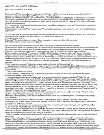 Portal i Kwartalnik Emiddle East Jak za³o¿yæ spó³kê w Izraelu Autor: ¼ród³o: Ambasada RP w Tel Awiwie Zak³adanie spó³ki w IzraeluZgodnie z Prawem o Spó³kach - 1999 funkcjonuj± w Izraelu dwa rodzaje spó³ek z ograniczon± odpowiedzialno¶ci±: spó³ki prywatne i spó³ki publiczne. Spó³ka prywatna mo¿e liczyæ 1-50 wspólników, w spó³ce publicznej wymagane jest co najmniej 7 wspólników. Forma spó³ki publicznej jest obowi±zkowa w przypadku emisji przez spó³kê papierów warto¶ciowych na gie³dzie b±d¼ dla pewnych rodzajów dzia³alno¶ci jak banki, spó³ki ubezpieczeniowe itp., nawet je¿eli te spó³ki nie emituj± papierów warto¶ciowych. Firmy prowadz±ce w Izraelu dzia³alno¶æ gospodarcz± najczê¶ciej korzystaj± z formy spó³ki prywatnej z ograniczon± odpowiedzialno¶ci± (Ltd). Akcjonariuszem w takiej spó³ce mo¿e byæ zarówno osoba fizyczna jak i osoba prawna, osoby prawne b±d¼ osoby zagraniczne. Do za³o¿enia spó³ki prywatnej wymagany jest minimalny kapita³ zak³adowy w wysoko¶ci 10 000,- ILS, który musi zostaæ pokryty w ca³o¶ci przez akcjonariuszy oraz nastêpuj±ce dokumenty: 1 wniosek o wpis spó³ki 2 statut spó³ki odpowiadaj±cy wymogom Ustawy, podpisany przez wszystkich akcjonariuszy 3 o¶wiadczenie pierwszego wybranego Zarz±du W/w dokumenty musz± byæ sporz±dzone w jêzyku hebrajskim i po¶wiadczone przez adwokata. Je¿eli akcjonariuszem jest osoba zagraniczna, wymagane jest przedstawienie potwierdzonej za zgodno¶æ z orygina³em kopii paszportu, a w przypadku gdy akcjonariuszem jest spó³ka maj±ca siedzibê za granic±, nale¿y przedstawiæ jej dokumenty za³o¿ycielskie potwierdzone, przet³umaczone na jêzyk hebrajski i notarialnie uwierzytelnione. Op³ata skarbowa za wpis spó³ki wynosi ok. 2 000,- ILS. Procedura za³o¿enia i wpisu spó³ki, pod warunkiem ¿e wszystkie dokumenty zosta³y sporz±dzone zgodnie z wymogami Ustawy, trwa oko³o 5-6 dni roboczych.Spó³ka zarejestrowana za granic±, która chce prowadziæ dzia³alno¶æ w Izraelu jest zobowi±zana do zarejestrowania siê w Izraelskim Rejestrze Spó³ek jako „spó³ka obca". Spó³ka obca po zarejestrowaniu podlega przepisom izraelskiej Ustawy o Spó³kach - 1999, a tak¿e wszelkim przepisom podatkowym i dewizowym, którym podlegaj± spó³ki izraelskie. W celu zarejestrowania spó³ki obcej wymagane jest przed³o¿enie do Rejestru Spó³ek: - 1 zalegalizowanych dokumentów za³o¿ycielskich spó³ki (wymagane jest apostille b±d¼ po¶wiadczenie konsulatu Izraela w pañstwie, w którym zarejestrowana jest spó³ka) wraz z ich notarialnie po¶wiadczonym t³umaczeniem na jêzyk hebrajski - 2 listy cz³onków zarz±du spó³ki - 3 imiê, nazwisko i adres osoby stale przebywaj±cej w Izraelu uprawnionej do odbioru w imieniu spó³ki pism s±dowych i wszelkiej korespondencji - 4 umocowanie dla osoby przebywaj±cej stale w Izraelu uprawnionej do reprezentowania spó³ki.Op³ata za rejestracjê spó³ki obcej wynosi oko³o 2 000,- ILS. Procedura rejestracji spó³ki obcej jest nieco d³u¿sza ze wzglêdu na konieczno¶æ zbadania przez Rejestratora Spó³ek dokumentów za³o¿ycielskich spó³ki sporz±dzonych za granic±. (Dziêki uprzejmo¶ci Pani Marioli Hawel - Tocker, Adwokat, Notariusz) Import miêsa i certyfikat koszerno¶ci TORA zabrania spo¿ywania miêsa ze zwierz±t l±dowych nieparzystokopytnych i nieprze¿uwaj±cych (oba warunki musz± byæ spe³nione jednocze¶nie), ani pochodz±cego od nich mleka czy jaj. Nie wolno tak¿e je¶æ miêsa stworzeñ wodnych nieposiadaj±cych p³etw i ³usek (kraby, raki, wêgorze), owadów (z wyj±tkiem Np. szarañczy), robaków i wielu ptaków. Zakazów i warunków jest oczywi¶cie du¿o wiêcej. Pañstwo Izrael pozwala na wewnêtrzn± produkcjê i sprzeda¿ niekoszernej ¿ywno¶ci, czyli takiej, której nie wolno zgodnie z religi± Moj¿eszow± spo¿ywaæ (w tym wieprzowiny). Mimo tego, istnieje prawny zakaz importu do Izraela miêsa, które nie posiada certyfikatu koszerno¶ci wydawanego przez Rabinaty. Mimo generalnej mo¿liwo¶ci produkcji i sprzeda¿y niekoszernego miêsa, zdarza³y i zdarzaj± siê przypadki nak³adania przez w³adze zakazu na sprzeda¿ takich wyrobów. W ¶wietle wyroków S±du Najwy¿szego, takie zakazy w zasadzie nie maj± mocy prawnej. W efekcie miêso niekoszerne jest sprzedawane w Izraelu w wielu sklepach nieprzestrzegaj±cych regu³ koszerno¶ci, nie ma natomiast mo¿liwo¶ci jego importu z zagranicy. Zakaz nie odnosi siê do innych rodzajów ¿ywno¶ci, która jest sprowadzana z ca³ego ¶wiata, niemniej nie mo¿na jej znale¼æ na pó³kach wiêkszo¶ci du¿ych sieci handlowych, gdy¿ jeden niekoszerny produkt powoduje „nieczysto¶æâ€• ca³ego sklepu i wszystkich znajduj±cych siê w nim towarów. Rodzi to konkretne skutki: podejmowanie prób eksportu na rynek izraelski miêsa niekoszernego w chwili obecnej jest bezcelowe. Import miêsa wo³owego z Polski, nawet w przypadku uzyskania certyfikatu koszerno¶ci, aktualnie nie jest mo¿liwy zgodnie z decyzj± izraelskich w³adz sanitarnych, ze wzglêdu na wystêpuj±ce w przesz³o¶ci w Polsce przypadki BSE. Certyfikat koszerno¶ci dla produktów spe³niaj±cych wymogi zawarte w TORZE, wydawany jest po weryfikacji przez Rabinat (w Polsce - Naczelny Rabin). Czêsto zajmuj± siê tym specjalne instytucje/firmy wspó³pracuj±ce z Rabinami. Importerzy ¿ywno¶ci, (ale nie tylko) s± czêsto w kontakcie z takimi instytucjami, je¶li chc± uzyskaæ certyfikat koszerno¶ci na importowany produkt. Certyfikat koszerno¶ci otwiera nie tylko rynek izraelski, ale tak¿e umo¿liwia sprzeda¿ do sieci http://www.test.emiddle-east.com Kreator PDF Utworzono 4 March, 2017, 04:07 Portal i Kwartalnik Emiddle East zaopatruj±cych ¿ydowskie spo³eczno¶ci na ¶wiecie, oraz do sieci handlowych szeregu krajów muzu³mañskich. Uwaga: koszerna mo¿e byæ nie tylko ¿ywno¶æ, ale tak¿e rzeczy, na przyk³ad telefon komórkowy.  Umowy o 