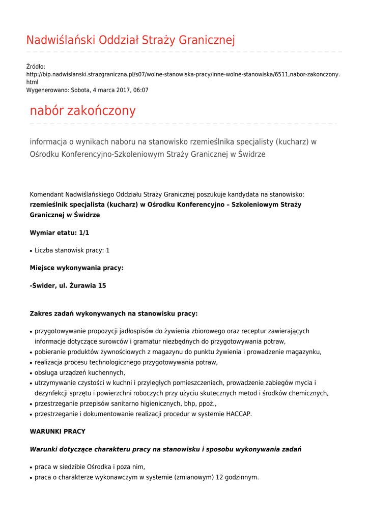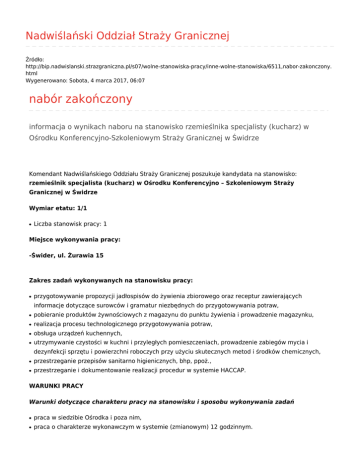 Nadwiślański Oddział Straży Granicznej Źródło: http://bip.nadwislanski.strazgraniczna.pl/s07/wolne-stanowiska-pracy/inne-wolne-stanowiska/6511,nabor-zakonczony. html Wygenerowano: Sobota, 4 marca 2017, 06:07 nabór zakończony informacja o wynikach naboru na stanowisko rzemieślnika specjalisty (kucharz) w Ośrodku Konferencyjno-Szkoleniowym Straży Granicznej w Świdrze Komendant Nadwiślańskiego Oddziału Straży Granicznej poszukuje kandydata na stanowisko: rzemieślnik specjalista (kucharz) w Ośrodku Konferencyjno – Szkoleniowym Straży Granicznej w Świdrze Wymiar etatu: 1/1 ● Liczba stanowisk pracy: 1 Miejsce wykonywania pracy: -Świder, ul. Żurawia 15 Zakres zadań wykonywanych na stanowisku pracy: ● przygotowywanie propozycji jadłospisów do żywienia zbiorowego oraz receptur zawierających informacje dotyczące surowców i gramatur niezbędnych do przygotowywania potraw, ● pobieranie produktów żywnościowych z magazynu do punktu żywienia i prowadzenie magazynku, ● realizacja procesu technologicznego przygotowywania potraw, ● obsługa urządzeń kuchennych, ● utrzymywanie czystości w kuchni i przyległych pomieszczeniach, prowadzenie zabiegów mycia i dezynfekcji sprzętu i powierzchni roboczych przy użyciu skutecznych metod i środków chemicznych, ● przestrzeganie przepisów sanitarno higienicznych, bhp, ppoż., ● przestrzeganie i dokumentowanie realizacji procedur w systemie HACCAP. WARUNKI PRACY Warunki dotyczące charakteru pracy na stanowisku i sposobu wykonywania zadań ● praca w siedzibie Ośrodka i poza nim, ● praca o charakterze wykonawczym w systemie (zmianowym) 12 godzinnym. Miejsce i otoczenie organizacyjno - techniczne stanowiska pracy ● obiekty nie są przystosowane do poruszania się osób niepełnosprawnych, ● pracownik wykonuje pracę w pomieszczeniach przy sztucznym oświetleniu oraz poza budynkami przy oświetleniu naturalnym, ● brak pomieszczeń higieniczno – sanitarnych przystosowanych dla osób niepełnosprawnych, ● możliwość poruszania się po obiekcie. WYMAGANIA ZWIĄZANE ZE STANOWISKIEM PRACY NIEZBĘDNE ● wykształcenie: minimum zawodowe, ● liczba lat pracy - 3 lata , ● wysoka kultura osobista i miła aparycja, ● posiadanie aktualnej książeczki sanitarnej, ● umiejętność dobrej organizacji pracy, samodzielność, ● umiejętność pracy w zespole, komunikatywność, ● przestrzeganie zasad higieny osobistej, ● sumienność, ● umiejętność dobrej organizacji pracy i produkcji w żywieniu zbiorowym, WYMAGANIA DODATKOWE, ● stan zdrowia pozwalający na uzyskanie wpisu w książeczkę zdrowia do celów sanitarno – epidemiologicznych o braku przeciwwskazani do pracy w bloku żywienia. WYMAGANE DOKUMENTY I OŚWIADCZENIA: ● życiorys i list motywacyjny, ● oświadczenie kandydata o wyrażeniu zgody na przetwarzanie danych osobowych do celów rekrutacji, ● oświadczenie kandydata o korzystaniu z pełni praw publicznych, ● oświadczenie kandydata o nieskazaniu prawomocnym wyrokiem za umyślne przestępstwo lub umyślne przestępstwo skarbowe, ● kopie dokumentów potwierdzających wykształcenie, odbytych kursów i szkoleń, ● kopie dokumentów potwierdzających wymagane lata pracy, ● kopia dokumentu potwierdzającego posiadanie polskiego obywatelstwa (dowód osobisty, inny dokument) lub oświadczenie o posiadaniu obywatelstwa polskiego, ● kopia poświadczenia bezpieczeństwa uprawniającego do dostępu do informacji niejawnych oznaczonych klauzulą "poufne" w przepadku nie posiadania w/w poświadczenia - oświadczenie o wyrażeniu zgody na przeprowadzenie postępowania sprawdzającego, zgodnie z ustawą z dnia 5 sierpnia 2010 r. o ochronie informacji niejawnych (Dz. U. Nr 182, poz. 1228). Wysokość wynagrodzenia miesięcznie 1680,00 zł brutto (wynagrodzenie zasadnicze + premia) + dodatek za wysługę lat Termin składania dokumentów: Miejsce składania dokumentów: Nadwiślański Oddział Straży Granicznej ul. 17 Stycznia 23 02-148 Warszawa z dopiskiem: „RZEMIEŚLNIK – SPECJALISTA KUCHARZ ŚWIDER” Informacje dodatkowe: Tel. 22 500 33 98, 22 500 30 23 INNE INFORMACJE: Dokumenty należy składać osobiście w siedzibie urzędu lub listownie. Oferty otrzymane po terminie nie będą rozpatrywane - decyduje data przyjęcia oferty w siedzibie urzędu lub data stempla pocztowego. Rozpatrzeniu nie będą podlegać oferty niespełniające wymagań określonych w ogłoszeniu, a także oferty, które nie zawierają kompletu wymaganych oraz podpisanych dokumentów i oświadczeń. Kandydaci wybrani spośród osób spełniających wymagania formalne zostaną powiadomieni telefonicznie o kolejnym etapie postępowania kwalifikacyjnego. Oferty odrzucone zostaną komisyjnie zniszczone. Metryczka Data publikacji 17.05.2013 Data modyfikacji 31.05.2013 Rejestr zmian Podmiot udostępniający informację: Biuletyn Informacji Publicznej Osoba wytwarzająca/odpowiadająca za informację: Karolina Kulita-Wysocka Osoba udostępniająca informację: Karolina Kulita-Wysocka Osoba modyfikująca informację: Karolina Kulita-Wysocka