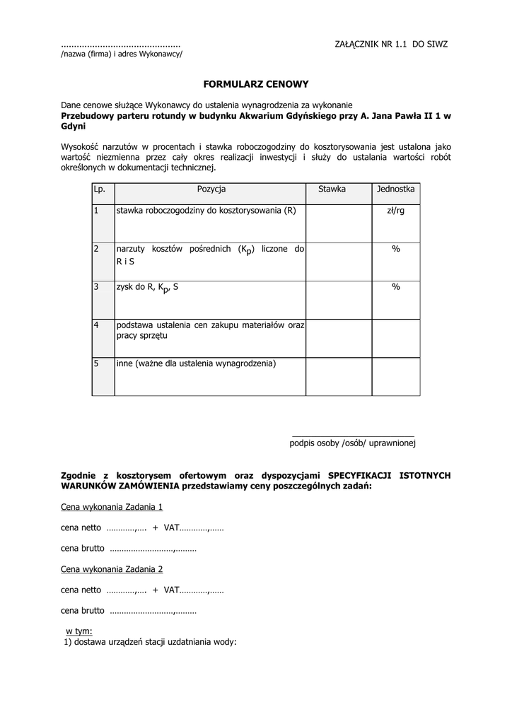 .............................................. ZAŁĄCZNIK NR 1.1 DO SIWZ /nazwa (firma) i adres Wykonawcy/ FORMULARZ CENOWY Dane cenowe słuŜące Wykonawcy do ustalenia wynagrodzenia za wykonanie Przebudowy parteru rotundy w budynku Akwarium Gdyńskiego przy A. Jana Pawła II 1 w Gdyni Wysokość narzutów w procentach i stawka roboczogodziny do kosztorysowania jest ustalona jako wartość niezmienna przez cały okres realizacji inwestycji i słuŜy do ustalania wartości robót określonych w dokumentacji technicznej. Lp. Pozycja Stawka 1 stawka roboczogodziny do kosztorysowania (R) 2 narzuty kosztów pośrednich (Kp) liczone do Jednostka zł/rg % RiS 3 zysk do R, Kp, S % 4 podstawa ustalenia cen zakupu materiałów oraz pracy sprzętu 5 inne (waŜne dla ustalenia wynagrodzenia) __________________________ podpis osoby /osób/ uprawnionej Zgodnie z kosztorysem ofertowym oraz dyspozycjami SPECYFIKACJI ISTOTNYCH WARUNKÓW ZAMÓWIENIA przedstawiamy ceny poszczególnych zadań: Cena wykonania Zadania 1 cena netto …………,…. + VAT…………,…… cena brutto ………………………,……… Cena wykonania Zadania 2 cena netto …………,…. + VAT…………,…… cena brutto ………………………,……… w tym: 1) dostawa urządzeń stacji uzdatniania wody: cena netto …………,…. + VAT…………,…… cena brutto ………………………,……… 2) roboty budowlano montaŜowe stacji uzdatniania cena netto …………,…. + VAT…………,…… cena brutto ………………………,……… Cena wykonania Zadania 3 cena netto …………,…. + VAT…………,…… cena brutto ………………………,……… Cena wykonania Zadania 4 cena netto …………,…. + VAT…………,…… cena brutto ………………………,……… Przy ocenie oferty decyduje cena łączna jako suma wartości poszczególnych zadań; ceny poszczególnych zadań mają charakter orientacyjny. __________________________ podpis osoby /osób/ uprawnionej