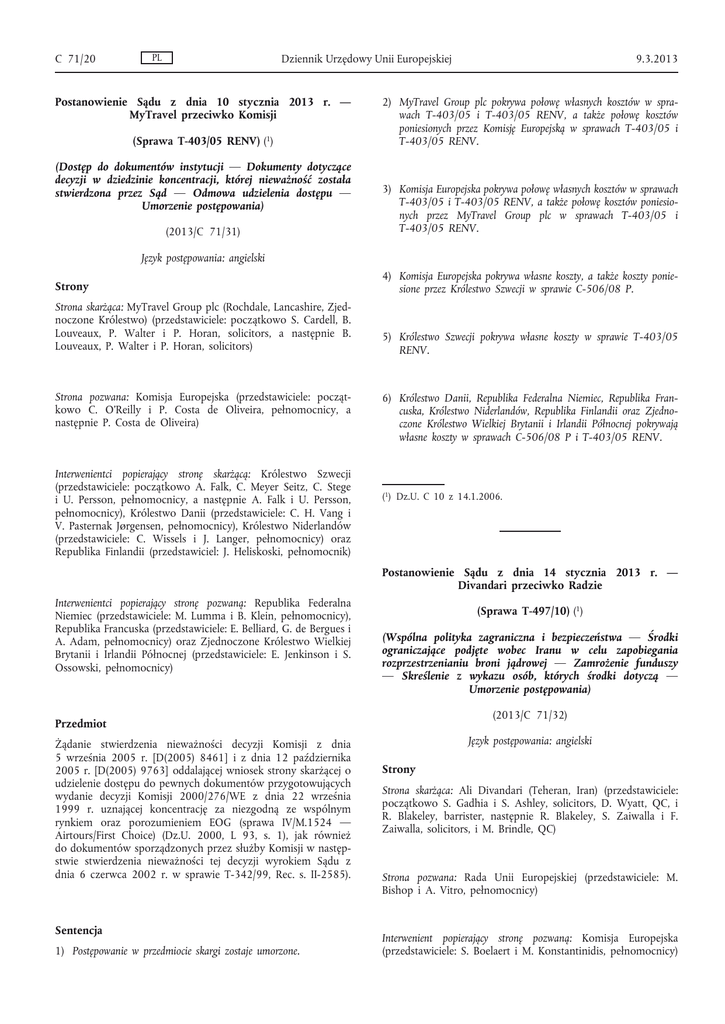 C 71/20 PL Dziennik Urzędowy Unii Europejskiej Postanowienie Sądu z dnia 10 stycznia 2013 r. — MyTravel przeciwko Komisji (Sprawa T-403/05 RENV) (1) (Dostęp do dokumentów instytucji — Dokumenty dotyczące decyzji w dziedzinie koncentracji, której nieważność została stwierdzona przez Sąd — Odmowa udzielenia dostępu — Umorzenie postępowania) (2013/C 71/31) 9.3.2013 2) MyTravel Group plc pokrywa połowę własnych kosztów w spra wach T-403/05 i T-403/05 RENV, a także połowę kosztów poniesionych przez Komisję Europejską w sprawach T-403/05 i T-403/05 RENV. 3) Komisja Europejska pokrywa połowę własnych kosztów w sprawach T-403/05 i T-403/05 RENV, a także połowę kosztów poniesio nych przez MyTravel Group plc w sprawach T-403/05 i T-403/05 RENV. Język postępowania: angielski Strony 4) Komisja Europejska pokrywa własne koszty, a także koszty ponie sione przez Królestwo Szwecji w sprawie C-506/08 P. Strona skarżąca: MyTravel Group plc (Rochdale, Lancashire, Zjed noczone Królestwo) (przedstawiciele: początkowo S. Cardell, B. Louveaux, P. Walter i P. Horan, solicitors, a następnie B. Louveaux, P. Walter i P. Horan, solicitors) 5) Królestwo Szwecji pokrywa własne koszty w sprawie T-403/05 RENV. Strona pozwana: Komisja Europejska (przedstawiciele: począt kowo C. O’Reilly i P. Costa de Oliveira, pełnomocnicy, a następnie P. Costa de Oliveira) Interwenientci popierający stronę skarżącą: Królestwo Szwecji (przedstawiciele: początkowo A. Falk, C. Meyer Seitz, C. Stege i U. Persson, pełnomocnicy, a następnie A. Falk i U. Persson, pełnomocnicy), Królestwo Danii (przedstawiciele: C. H. Vang i V. Pasternak Jørgensen, pełnomocnicy), Królestwo Niderlandów (przedstawiciele: C. Wissels i J. Langer, pełnomocnicy) oraz Republika Finlandii (przedstawiciel: J. Heliskoski, pełnomocnik) 6) Królestwo Danii, Republika Federalna Niemiec, Republika Fran cuska, Królestwo Niderlandów, Republika Finlandii oraz Zjedno czone Królestwo Wielkiej Brytanii i Irlandii Północnej pokrywają własne koszty w sprawach C-506/08 P i T-403/05 RENV. (1) Dz.U. C 10 z 14.1.2006. Postanowienie Sądu z dnia 14 stycznia 2013 r. — Divandari przeciwko Radzie Interwenientci popierający stronę pozwaną: Republika Federalna Niemiec (przedstawiciele: M. Lumma i B. Klein, pełnomocnicy), Republika Francuska (przedstawiciele: E. Belliard, G. de Bergues i A. Adam, pełnomocnicy) oraz Zjednoczone Królestwo Wielkiej Brytanii i Irlandii Północnej (przedstawiciele: E. Jenkinson i S. Ossowski, pełnomocnicy) (Sprawa T-497/10) (1) (Wspólna polityka zagraniczna i bezpieczeństwa — Środki ograniczające podjęte wobec Iranu w celu zapobiegania rozprzestrzenianiu broni jądrowej — Zamrożenie funduszy — Skreślenie z wykazu osób, których środki dotyczą — Umorzenie postępowania) (2013/C 71/32) Przedmiot Żądanie stwierdzenia nieważności decyzji Komisji z dnia 5 września 2005 r. [D(2005) 8461] i z dnia 12 października 2005 r. [D(2005) 9763] oddalającej wniosek strony skarżącej o udzielenie dostępu do pewnych dokumentów przygotowujących wydanie decyzji Komisji 2000/276/WE z dnia 22 września 1999 r. uznającej koncentrację za niezgodną ze wspólnym rynkiem oraz porozumieniem EOG (sprawa IV/M.1524 — Airtours/First Choice) (Dz.U. 2000, L 93, s. 1), jak również do dokumentów sporządzonych przez służby Komisji w następ stwie stwierdzenia nieważności tej decyzji wyrokiem Sądu z dnia 6 czerwca 2002 r. w sprawie T-342/99, Rec. s. II-2585). Sentencja 1) Postępowanie w przedmiocie skargi zostaje umorzone. Język postępowania: angielski Strony Strona skarżąca: Ali Divandari (Teheran, Iran) (przedstawiciele: początkowo S. Gadhia i S. Ashley, solicitors, D. Wyatt, QC, i R. Blakeley, barrister, następnie R. Blakeley, S. Zaiwalla i F. Zaiwalla, solicitors, i M. Brindle, QC) Strona pozwana: Rada Unii Europejskiej (przedstawiciele: M. Bishop i A. Vitro, pełnomocnicy) Interwenient popierający stronę pozwaną: Komisja Europejska (przedstawiciele: S. Boelaert i M. Konstantinidis, pełnomocnicy)