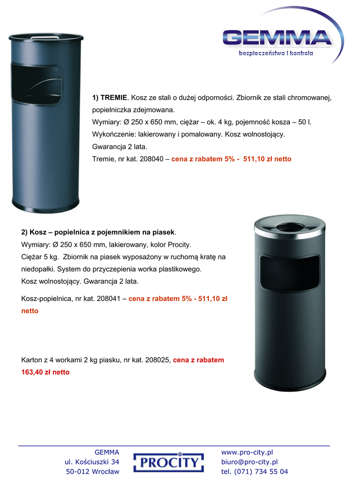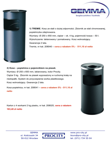 1) TREMIE. Kosz ze stali o dużej odporności. Zbiornik ze stali chromowanej, popielniczka zdejmowana. Wymiary: Ø 250 x 650 mm, ciężar – ok. 4 kg, pojemność kosza – 50 l. Wykończenie: lakierowany i pomalowany. Kosz wolnostojący. Gwarancja 2 lata. Tremie, nr kat. 208040 – cena z rabatem 5% - 511,10 zł netto 2) Kosz – popielnica z pojemnikiem na piasek. Wymiary: Ø 250 x 650 mm, lakierowany, kolor Procity. Ciężar 5 kg. Zbiornik na piasek wyposażony w ruchomą kratę na niedopałki. System do przyczepienia worka plastikowego. Kosz wolnostojący. Gwarancja 2 lata. Kosz-popielnica, nr kat. 208041 – cena z rabatem 5% - 511,10 zł netto Karton z 4 workami 2 kg piasku, nr kat. 208025, cena z rabatem 163,40 zł netto GEMMA ul. Kościuszki 34 50-012 Wrocław www.pro-city.pl [email protected] tel. (071) 734 55 04