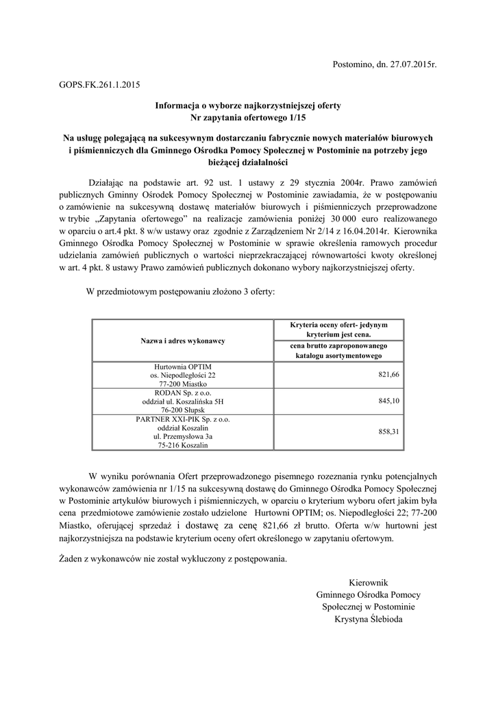 Postomino, dn. 27.07.2015r. GOPS.FK.261.1.2015 Informacja o wyborze najkorzystniejszej oferty Nr zapytania ofertowego 1/15 Na usługę polegającą na sukcesywnym dostarczaniu fabrycznie nowych materiałów biurowych i piśmienniczych dla Gminnego Ośrodka Pomocy Społecznej w Postominie na potrzeby jego bieŜącej działalności Działając na podstawie art. 92 ust. 1 ustawy z 29 stycznia 2004r. Prawo zamówień publicznych Gminny Ośrodek Pomocy Społecznej w Postominie zawiadamia, Ŝe w postępowaniu o zamówienie na sukcesywną dostawę materiałów biurowych i piśmienniczych przeprowadzone w trybie „Zapytania ofertowego” na realizacje zamówienia poniŜej 30 000 euro realizowanego w oparciu o art.4 pkt. 8 w/w ustawy oraz zgodnie z Zarządzeniem Nr 2/14 z 16.04.2014r. Kierownika Gminnego Ośrodka Pomocy Społecznej w Postominie w sprawie określenia ramowych procedur udzielania zamówień publicznych o wartości nieprzekraczającej równowartości kwoty określonej w art. 4 pkt. 8 ustawy Prawo zamówień publicznych dokonano wybory najkorzystniejszej oferty. W przedmiotowym postępowaniu złoŜono 3 oferty: Nazwa i adres wykonawcy Hurtownia OPTIM os. Niepodległości 22 77-200 Miastko RODAN Sp. z o.o. oddział ul. Koszalińska 5H 76-200 Słupsk PARTNER XXI-PIK Sp. z o.o. oddział Koszalin ul. Przemysłowa 3a 75-216 Koszalin Kryteria oceny ofert- jedynym kryterium jest cena. cena brutto zaproponowanego katalogu asortymentowego 821,66 845,10 858,31 W wyniku porównania Ofert przeprowadzonego pisemnego rozeznania rynku potencjalnych wykonawców zamówienia nr 1/15 na sukcesywną dostawę do Gminnego Ośrodka Pomocy Społecznej w Postominie artykułów biurowych i piśmienniczych, w oparciu o kryterium wyboru ofert jakim była cena przedmiotowe zamówienie zostało udzielone Hurtowni OPTIM; os. Niepodległości 22; 77-200 Miastko, oferującej sprzedaŜ i dostawę za cenę 821,66 zł brutto. Oferta w/w hurtowni jest najkorzystniejsza na podstawie kryterium oceny ofert określonego w zapytaniu ofertowym. śaden z wykonawców nie został wykluczony z postępowania. Kierownik Gminnego Ośrodka Pomocy Społecznej w Postominie Krystyna Ślebioda