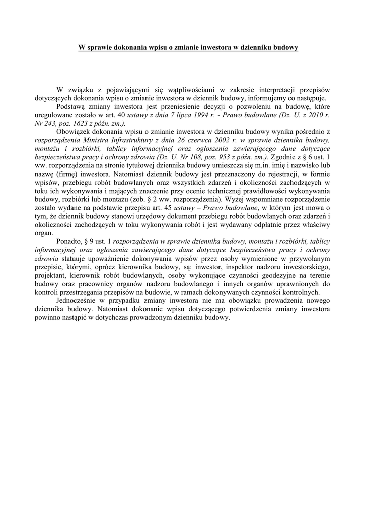 W sprawie dokonania wpisu o zmianie inwestora w dzienniku budowy W związku z pojawiającymi się wątpliwościami w zakresie interpretacji przepisów dotyczących dokonania wpisu o zmianie inwestora w dziennik budowy, informujemy co następuje. Podstawą zmiany inwestora jest przeniesienie decyzji o pozwoleniu na budowę, które uregulowane zostało w art. 40 ustawy z dnia 7 lipca 1994 r. - Prawo budowlane (Dz. U. z 2010 r. Nr 243, poz. 1623 z późn. zm.). Obowiązek dokonania wpisu o zmianie inwestora w dzienniku budowy wynika pośrednio z rozporządzenia Ministra Infrastruktury z dnia 26 czerwca 2002 r. w sprawie dziennika budowy, montażu i rozbiórki, tablicy informacyjnej oraz ogłoszenia zawierającego dane dotyczące bezpieczeństwa pracy i ochrony zdrowia (Dz. U. Nr 108, poz. 953 z późn. zm.). Zgodnie z § 6 ust. 1 ww. rozporządzenia na stronie tytułowej dziennika budowy umieszcza się m.in. imię i nazwisko lub nazwę (firmę) inwestora. Natomiast dziennik budowy jest przeznaczony do rejestracji, w formie wpisów, przebiegu robót budowlanych oraz wszystkich zdarzeń i okoliczności zachodzących w toku ich wykonywania i mających znaczenie przy ocenie technicznej prawidłowości wykonywania budowy, rozbiórki lub montażu (zob. § 2 ww. rozporządzenia). Wyżej wspomniane rozporządzenie zostało wydane na podstawie przepisu art. 45 ustawy – Prawo budowlane, w którym jest mowa o tym, że dziennik budowy stanowi urzędowy dokument przebiegu robót budowlanych oraz zdarzeń i okoliczności zachodzących w toku wykonywania robót i jest wydawany odpłatnie przez właściwy organ. Ponadto, § 9 ust. 1 rozporządzenia w sprawie dziennika budowy, montażu i rozbiórki, tablicy informacyjnej oraz ogłoszenia zawierającego dane dotyczące bezpieczeństwa pracy i ochrony zdrowia statuuje upoważnienie dokonywania wpisów przez osoby wymienione w przywołanym przepisie, którymi, oprócz kierownika budowy, są: inwestor, inspektor nadzoru inwestorskiego, projektant, kierownik robót budowlanych, osoby wykonujące czynności geodezyjne na terenie budowy oraz pracownicy organów nadzoru budowlanego i innych organów uprawnionych do kontroli przestrzegania przepisów na budowie, w ramach dokonywanych czynności kontrolnych. Jednocześnie w przypadku zmiany inwestora nie ma obowiązku prowadzenia nowego dziennika budowy. Natomiast dokonanie wpisu dotyczącego potwierdzenia zmiany inwestora powinno nastąpić w dotychczas prowadzonym dzienniku budowy.