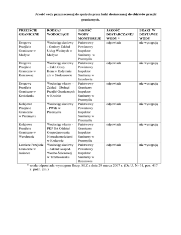 Jakość wody przeznaczonej do spożycia przez ludzi dostarczanej do obiektów przejść granicznych. PRZEJŚCIE GRANICZNE RODZAJ WODOCIĄGU Drogowe Przejście Graniczne w Medyce Wodociąg sieciowy - Gminny Zakład Usług Wodnych w Medyce Drogowe Przejście Graniczne w Korczowej Wodociąg sieciowy – Zakł..Gosp. Kom.w Radymnie z/s w Skołoszowie Drogowe Przejście Graniczne w Krościenku Wodociąg własny – Zakład Obsługi Przejść Granicznych w Krośnie Kolejowe Przejście Graniczne w Przemyślu Wodociąg sieciowy - PWiK w Przemyślu Kolejowe Przejście Graniczne w Werchracie Wodociąg własny PKP SA Oddział Gospodarowania Nieruchomościami w Krakowie Wodociąg sieciowy – Zakład Gospod. Wodno-Ściekowej w Trzebownisku Lotnicze Przejście Graniczne w Jasionce JAKOŚĆ WODY MONITORUJE Państwowy Powiatowy Inspektor Sanitarny w Przemyślu Państwowy Powiatowy Inspektor Sanitarny w Jarosławiu Państwowy Graniczny Inspektor Sanitarny w Przemyślu Państwowy Powiatowy Inspektor Sanitarny w Przemyślu Państwowy Graniczny Inspektor Sanitarny w Przemyślu Państwowy Powiatowy Inspektor Sanitarny w Rzeszowie JAKOŚĆ DOSTARCZANEJ WODY * odpowiada BRAKI W DOSTAWIE WODY nie występują odpowiada nie występują odpowiada nie występują odpowiada nie występują odpowiada nie występują odpowiada nie występują * woda odpowiada wymogom Rozp. M.Z z dnia 29 marca 2007 r. (Dz.U. Nr 61, poz. 417 z późn. zm.)