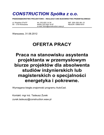 CONSTRUCTION Spółka z o.o. PRZEDSIĘBIORSTWO PROJEKTOWO – REALIZACYJNE BUDOWNICTWA PRZEMYSŁOWEGO ul. Wspólna 27a/37 00 – 519 Warszawa tel. (22) 622 14 34 tel/fax (22) 628 19 97 e-mail: [email protected] NIP 526–020–96–10 REGON 006931870 Warszawa, 31.08.2012 OFERTA PRACY Praca na stanowisku asystenta projektanta w przemysłowym biurze projektów dla absolwenta studiów inżynierskich lub magisterskich o specjalności energetyka i pokrewne. Wymagana biegła znajomość programu AutoCad. Kontakt: mgr inż. Tadeusz Żurek [email protected]