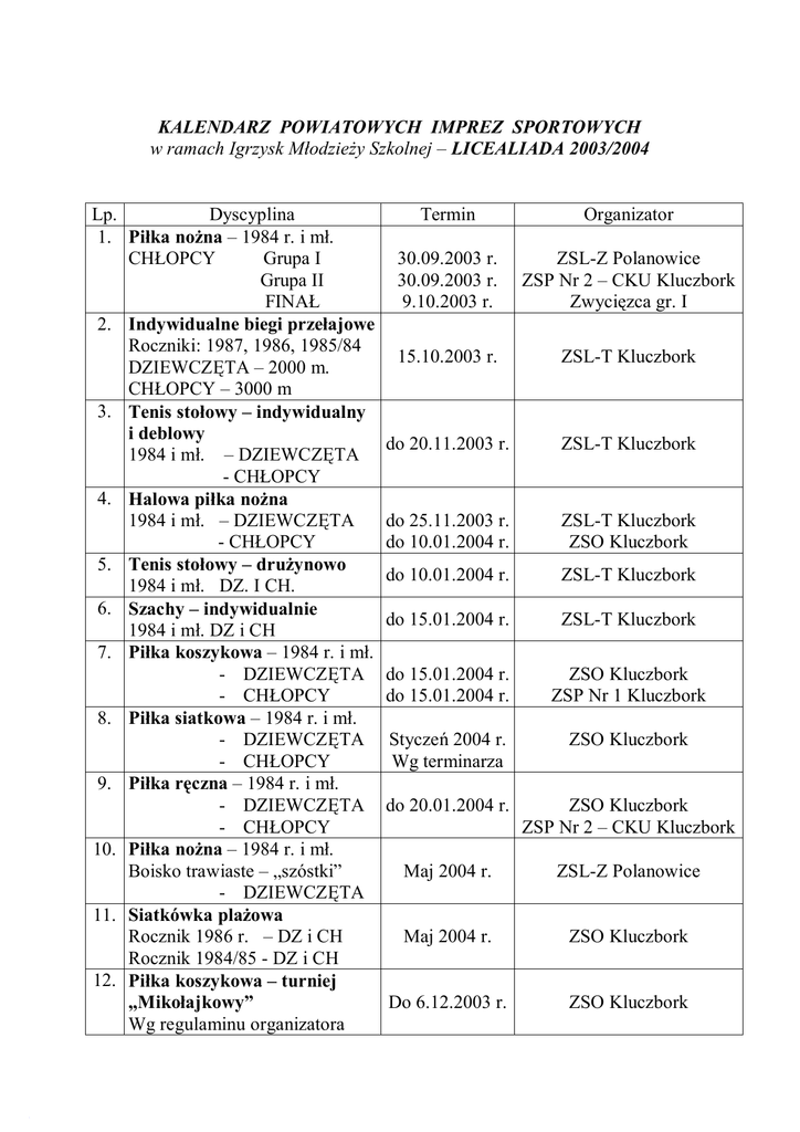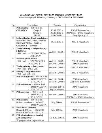 KALENDARZ POWIATOWYCH IMPREZ SPORTOWYCH w ramach Igrzysk Młodzieży Szkolnej – LICEALIADA 2003/2004 Lp. Dyscyplina 1. Piłka nożna – 1984 r. i mł. CHŁOPCY Grupa I Grupa II FINAŁ 2. Indywidualne biegi przełajowe Roczniki: 1987, 1986, 1985/84 DZIEWCZĘTA – 2000 m. CHŁOPCY – 3000 m 3. Tenis stołowy – indywidualny i deblowy 1984 i mł. – DZIEWCZĘTA - CHŁOPCY 4. Halowa piłka nożna 1984 i mł. – DZIEWCZĘTA - CHŁOPCY 5. Tenis stołowy – drużynowo 1984 i mł. DZ. I CH. 6. Szachy – indywidualnie 1984 i mł. DZ i CH 7. Piłka koszykowa – 1984 r. i mł. - DZIEWCZĘTA - CHŁOPCY 8. Piłka siatkowa – 1984 r. i mł. - DZIEWCZĘTA - CHŁOPCY 9. Piłka ręczna – 1984 r. i mł. - DZIEWCZĘTA - CHŁOPCY 10. Piłka nożna – 1984 r. i mł. Boisko trawiaste – „szóstki” - DZIEWCZĘTA 11. Siatkówka plażowa Rocznik 1986 r. – DZ i CH Rocznik 1984/85 - DZ i CH 12. Piłka koszykowa – turniej „Mikołajkowy” Wg regulaminu organizatora Termin Organizator 30.09.2003 r. 30.09.2003 r. 9.10.2003 r. ZSL-Z Polanowice ZSP Nr 2 – CKU Kluczbork Zwycięzca gr. I 15.10.2003 r. ZSL-T Kluczbork do 20.11.2003 r. ZSL-T Kluczbork do 25.11.2003 r. do 10.01.2004 r. ZSL-T Kluczbork ZSO Kluczbork do 10.01.2004 r. ZSL-T Kluczbork do 15.01.2004 r. ZSL-T Kluczbork do 15.01.2004 r. do 15.01.2004 r. ZSO Kluczbork ZSP Nr 1 Kluczbork Styczeń 2004 r. Wg terminarza ZSO Kluczbork do 20.01.2004 r. ZSO Kluczbork ZSP Nr 2 – CKU Kluczbork Maj 2004 r. ZSL-Z Polanowice Maj 2004 r. ZSO Kluczbork Do 6.12.2003 r. ZSO Kluczbork 13. Indywidualne Mistrzostwa w Wiosna 2004 Lekkiej Atletyce DZ i CH – rocznik 1984 i mł. 14. Piłka nożna Międzynarodowy Turniej Dni Kluczborka „Szóstek” – o Puchar Dyrektora Ośrodka Sportu i Rekreacji ZSL-Z Polanowice Koordynator Sportu Szkolnego Powiatu Kluczborskiego i OSiR UWAGA: we wszystkich zawodach obowiązuje regulamin na rok szkolny 2003/2004 Wojewódzkiego Szkolnego Związku Sportowego w Opolu W zawodach gier zespołowych na szczeblu powiatu, jeżeli liczba uczestniczących drużyn przekracza 4 (cztery) obowiązuje podział na grupy: GR. I – ZSL-T Kluczbork, ZSL-Z Polanowice, ZSP Nr 1 Kluczbork GR. II – ZSP Nr 2 – CKU Kluczbork, ZSP-RCKU Bogdańczowice, ZSO Kluczbork W innym przypadku realizujemy systemem „każdy z każdym”. Wszystkie zawody na szczeblu powiatu sędziują wyznaczeni przez organizatora nauczyciele lub młodzież z uprawnieniami sędziowskimi (młodzieżowy sędzia sportowy). Organizator zawodów powiadamia na piśmie zainteresowanych na 7 dni naprzód o miejscu i terminie zawodów, a szkoły potwierdzają odwrotnie swój udział – najpóźniej do 2 dni przed ich rozpoczęciem. Niedotrzymanie terminów grozi wykluczeniem z rywalizacji. Po zakończeniu zawodów organizator przesyła komunikat z wyszczególnieniem imiennym zwycięzców na adres: Jan Ziółkowski Zespół Szkół Licealno-Technicznych ul. Sienkiewicza 20 46-200 Kluczbork lub e-mail: [email protected]
