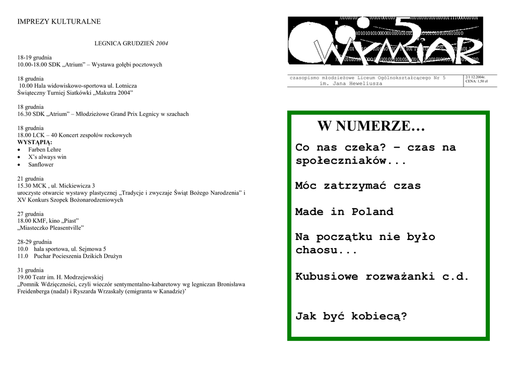 IMPREZY KULTURALNE LEGNICA GRUDZIEŃ 2004 18-19 grudnia 10.00-18.00 SDK „Atrium” – Wystawa gołębi pocztowych 18 grudnia 10.00 Hala widowiskowo-sportowa ul. Lotnicza Świąteczny Turniej Siatkówki „Makutra 2004” czasopismo młodzieżowe Liceum Ogólnokształcącego Nr 5 im. Jana Heweliusza 2/1 12.2004r. CENA: 1,50 zł 18 grudnia 16.30 SDK „Atrium” – Młodzieżowe Grand Prix Legnicy w szachach 18 grudnia 18.00 LCK – 40 Koncert zespołów rockowych WYSTĄPIĄ: Farben Lehre X’s always win Sanflower 21 grudnia 15.30 MCK , ul. Mickiewicza 3 uroczyste otwarcie wystawy plastycznej „Tradycje i zwyczaje Świąt Bożego Narodzenia” i XV Konkurs Szopek Bożonarodzeniowych 27 grudnia 18.00 KMF, kino „Piast” „Miasteczko Pleasentville” 28-29 grudnia 10.0 hala sportowa, ul. Sejmowa 5 11.0 Puchar Pocieszenia Dzikich Drużyn 31 grudnia 19.00 Teatr im. H. Modrzejewskiej „Pomnik Wdzięczności, czyli wieczór sentymentalno-kabaretowy wg legniczan Bronisława Freidenberga (nadal) i Ryszarda Wrzaskały (emigranta w Kanadzie)’ W NUMERZE… Co nas czeka? – czas na społeczniaków... Móc zatrzymać czas Made in Poland Na początku nie było chaosu... Kubusiowe rozważanki c.d. Jak być kobiecą? kulinaria uff… Czasopismo młodzieżowe Liceum Ogólnokształcącego Nr 5 im. Jana Heweliusza rok trzeci nasz adres: V LO im. Jana Heweliusza ul. Senatorska 32 mail: [email protected] Redaktorki Naczelne Magdalena Pietrewicz Paulina Dobosz Współpraca Anna Kriegel Adam Kamiński Anna Borowiec Maja Berezowska Magdalena Trzeciak Marcin Rojcewicz Janusz Dąbkiewicz ...a nad wszystkim czuwają: prof. Tomasz Adamowski prof. Teresa Jasińska To już prawie zima a do Waszych rąk trafia właśnie najświeższy numer „5 wymiaru”. Mamy nadzieję, że jego lektura choć częściowo wypełni okres dziesięciodniowej laby. A ponieważ nie spotkamy się już w tym roku chcielibyśmy pożegnać się z Wami nastrojowo. Stąd nasze życzenia – optymistyczne, choć nastrój ten niekoniecznie odbija się we wszystkich artykułach. Świąt białych, pachnących choinką, skrzypiących śniegiem pod butami, spędzonych w ciepłej, rodzinnej atmosferze, pełnych niespodziewanych prezentów. Świąt dających radość i odpoczynek, oraz nadzieję na Nowy Rok, żeby był jeszcze lepszy niż ten, co właśnie mija. Gorąco polecam owoce z sosem bananowo - jogurtowym. Zajadają się tym sosem przede wszystkim Włosi. Tenże przepis trafił do mnie zupełnie przypadkowo. Przeglądałam zeszyt z przepisami cioci (wielkiej podróżniczki) i jakimś dziwnym sposobem znalazł się u mnie. Sos robi się szybko, nie stracimy dużo czasu, kiedy niezapowiedziani goście nawiedzą nas w domu (warunkiem jest posiadanie składników ) A zatem: Składniki na 4 porcje: 4 szklanki świeżych owoców - banan - mały jogurt naturalny - 2 łyżki soku z cytryny - łyżka płynnego miodu - 4 łyżeczki posiekanych orzechów pistacjowych/laskowych Wykonanie: 1. owoce umyj, osusz i w razie potrzeby pokrój na kawałki; możesz wziąć dowolną mieszankę swoich ulubionych owoców, albo zdecydować się tylko na jeden ich rodzaj 2. banana obierz, pokrój w plasterki, skrop sokiem z cytryny i bardzo dokładnie rozgnieć widelcem; dodaj jogurt i miód i dokładnie wymieszaj 3. owoce rozłóż do miseczek, polej sosem i posyp posiekanymi pistacjami / orzechami laskowymi. Redakcja . INFORMACJA BEZPŁATNA Ogłoście sobie, co chcecie! Macie do sprzedania Książkę Płytę kapcie? Chcielibyście coś kupić, pożyczyć, oddać? Macie ochotę komuś pomóc, chcecie uzyskać pomoc lub po prostu chcecie coś ogłosić? Ja osobiście ogłaszam, że przyjmuję ogłoszenia! Powtórzę jeszcze raz (mimo, że to nie stylistycznie): Ogłoście sobie, co chcecie! Nasz adres e-mailowy: [email protected] Pozwolicie, że będę pierwsza: Z racji mojej walki z kleptomanią chciałam zwrócić się z prośbą do wszystkich tych, którym ukradłam długopisy, aby mi o tym przypomnieli, a oddam! Magda 2e 2 5 WYMIAR grudzień `04 Smacznego, wasza sexgwiazdka 5 WYMIAR grudzień `04 19 nasz temat Idą do Nas Święta. Wręcz biegną. Na wystawach sklepowych pojawiły się już miesiąc temu. One idą biegnąc a ja stoję. I nie wiem , jak co roku, czy uciekać przed nimi czy wyjść na spotkanie. W rezultacie wychodzi na to, że rok w rok stoję wbita w ziemię i co roku patrzę jak mijają. A mijają szybko, bo zawsze dużo roboty. A to już zabawne być przestaje. Cała lista poleceń: ZRÓB! POKRÓJ! WYNIEŚ! KUP! PRZYNIEŚ! PODAJ! RUSZ SIĘ! NIE GADAJ! RÓB! Zapomnieli już dawno o gwiazdce, o tym, żeby wierzyć w Mikołaja i rozmawiać ze zwierzętami. Żeby się godzić, uśmiechnąć i nie złościć. A najważniejsze: spotkać. Zawsze jest o jeden talerz więcej. Ale tylko po to, żeby był. Nieznajomy nie jest zaproszony. Drzwi są zamknięte. Oczy zamknięte i serca. Społeczniara? Napisałam piękny, poetycki artykuł o marzeniach i planach przyszłej przewodniczącej Samorządu Uczniowskiego. O pomysłach na kampanię wyborczą i obietnicach, których i tak nie mogłabym spełnić… Odmierzałam minuty i sekundy, przeliczałam krzyżyki postawione przy moim nazwisku, operowałam liczbami, których właściwie nie rozumiałam. Wychwalałam się pod niebiosa… ale po co? Przecież dobrze wiem, że nikt nie czyta rozwlekłych, lirycznych reportaży! Drogi czytelniku, wiedz, że nie jest to „wzruszająca historia o dziewczynie z prowincji, która robi karierę polityczną u siebie w szkole”. Szanuję Twój czas, bo wiem, że masz go tak niewiele… Jeśli się nie przedstawię, niektórzy mogą to uznać, za przejawy gwiazdorstwa, dlatego zacznę tradycyjnie. Nazywam się Marta vel Julka Grocka i jestem przewodniczącą Samorządu Uczniowskiego:-) Mam do dyspozycji swoją pieczątkę, pokój, nawet prysznic mam na wyłączność, co nie ukrywam, wprawia mnie w lekkie zakłopotanie, bo nie przywykłam do takich wygód i z pewno