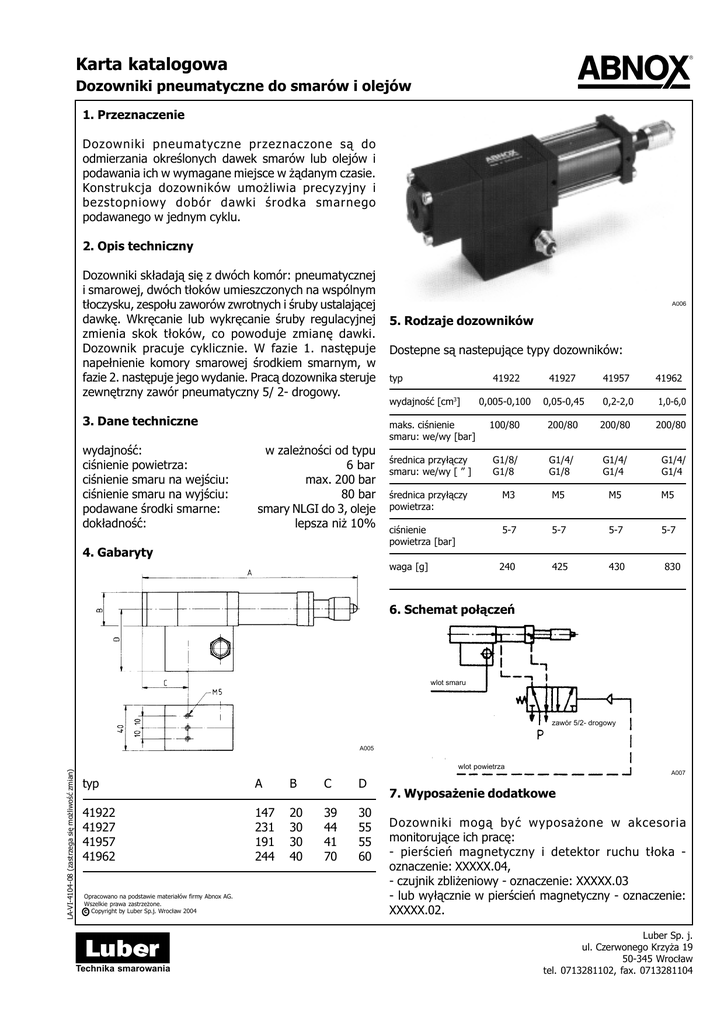 Karta katalogowa Dozowniki pneumatyczne do smarów i olejów 1. Przeznaczenie Dozowniki pneumatyczne przeznaczone s¹ do odmierzania okreœlonych dawek smarów lub olejów i podawania ich w wymagane miejsce w ¿¹danym czasie. Konstrukcja dozowników umo¿liwia precyzyjny i bezstopniowy dobór dawki œrodka smarnego podawanego w jednym cyklu. 2. Opis techniczny Dozowniki sk³adaj¹ siê z dwóch komór: pneumatycznej i smarowej, dwóch t³oków umieszczonych na wspólnym t³oczysku, zespo³u zaworów zwrotnych i œruby ustalaj¹cej dawkê. Wkrêcanie lub wykrêcanie œruby regulacyjnej zmienia skok t³oków, co powoduje zmianê dawki. Dozownik pracuje cyklicznie. W fazie 1. nastêpuje nape³nienie komory smarowej œrodkiem smarnym, w fazie 2. nastêpuje jego wydanie. Prac¹ dozownika steruje zewnêtrzny zawór pneumatyczny 5/ 2- drogowy. 3. Dane techniczne wydajnoœæ: ciœnienie powietrza: ciœnienie smaru na wejœciu: ciœnienie smaru na wyjœciu: podawane œrodki smarne: dok³adnoœæ: w zale¿noœci od typu 6 bar max. 200 bar 80 bar smary NLGI do 3, oleje lepsza ni¿ 10% A006 5. Rodzaje dozowników Dostepne s¹ nastepuj¹ce typy dozowników: typ 41922 41927 41957 41962 0,005-0,100 0,05-0,45 0,2-2,0 1,0-6,0 maks. ciœnienie smaru: we/wy [bar] 100/80 200/80 200/80 200/80 œrednica przy³¹czy smaru: we/wy [ ” ] G1/8/ G1/8 G1/4/ G1/8 G1/4/ G1/4 G1/4/ G1/4 wydajnoœæ [cm3] œrednica przy³¹czy powietrza: M3 M5 M5 M5 ciœnienie powietrza [bar] 5-7 5-7 5-7 5-7 240 425 430 4. Gabaryty waga [g] 830 6. Schemat po³¹czeñ wlot smaru zawór 5/2- drogowy LA-VI-4104-08 (zastrzega siê mo¿liwoœæ zmian) A005 wlot powietrza A007 typ A B C D 41922 41927 41957 41962 147 231 191 244 20 30 30 40 39 44 41 70 30 55 55 60 Opracowano na podstawie materia³ów firmy Abnox AG. Wszelkie prawa zastrze¿one. c Copyright by Luber Sp.j. Wroc³aw 2004 Technika smarowania 7. Wyposa¿enie dodatkowe Dozowniki mog¹ byæ wyposa¿one w akcesoria monitoruj¹ce ich pracê: - pierœcieñ magnetyczny i detektor ruchu t³oka oznaczenie: XXXXX.04, - czujnik zbli¿eniowy - oznaczenie: XXXXX.03 - lub wy³¹cznie w pierœcieñ magnetyczny - oznaczenie: XXXXX.02. Luber Sp. j. ul. Czerwonego Krzy¿a 19 50-345 Wroc³aw tel. 0713281102, fax. 0713281104 Karta katalogowa Dozowniki pneumatyczne do smarów i olejów 8. Instalacja 10. Wykrywanie i usuwanie usterek Dozownik nale¿y przymocowaæ w sposób trwa³y (dwoma œrubami M5), tak aby odleg³oœæ do miejsca podawania œrodka smarnego by³a jak najmniejsza. Lokalizacja dozownika powinna umo¿liwiaæ ³atwy dostêp do œruby regulacji wydajnoœci. Zawór steruj¹cy 5/2- drogowy powinien byæ umieszczony w bezpoœrednim s¹siedztwie dozownika. W celu zapewnienia odpowiednich parametrów œrodka smarnego nale¿y u¿yæ pompy o prze³o¿eniu ciœnienia 20:1. Maksymalne ciœnienie œrodka smarnego nie mo¿e przekroczyæ 200 bar. Do pod³¹czenia dozownika do pompy nale¿y u¿yæ odpowiedniego wysokociœnieniowego przewodu. W zale¿noœci od potrzeb na wyjœciu dozownika mo¿na zainstalowaæ odpowiedni¹ g³owicê umo¿liwiaj¹c¹ podawanie smaru w wymagane miejsca. Je¿eli dozownik jest wyposa¿ony w detektor ruchu t³oka to nale¿y dokonaæ odpowiednich po³¹czeñ elektrycznych. Uwaga: Przed przyst¹pieniem do napraw nale¿y od³¹czyæ dop³yw sprê¿onego powietrza. Dozownik pracuje lecz nie podaje smaru: - sprwadziæ dop³yw smaru z pompy do dozownika. Ewentualne usterki usun¹æ zgodnie z instrukcj¹ obs³ugi pompy. Dozownik pracuje lecz w podawanym smarze wystêpuj¹ pêcherze powietrza: - nale¿y odpowietrzyæ uk³ad zasilania dozownika. Nastêpnie uruchomiæ dozownik wed³ug punktu 9.pierwsze uruchomienie. Je¿eli dozownik nadal nie pracuje prawid³owo to nale¿y skontaktowaæ siê z dostawc¹. 9. Pierwsze uruchomienie LA-VI-4104-08 (zastrzega siê mo¿liwoœæ zmian) Ciœnienie powietrza zailaj¹cego dozownik powinno wynosiæ 6 bar. Nale¿y zastosowaæ odpowiedni regulator ciœnienia powietrza. Dozowniki s¹ testowane i wstêpnie nape³niane przez producenta. Jest mo¿liwe, ¿e resztki testowego œrodka smarnego pozosta³y w dozowniku. Przewód doprowadzaj¹cy œrodek smarny powinien byæ odpowietrzony. Podczas pierwszego uruchomienia dozownika nale¿y ustawiæ œrubê regulacyjn¹ na maksymaln¹ wydajnoœæ (œruba ca³kowicie wykrêcona). Nastêpnie nale¿y pod³¹czyæ sprê¿one powietrze do pompy i dozownika. Prze³¹czyæ kilkakrotnie steruj¹cy zawór 5/2- drogowy a¿ do pojawienia siê œrodka smarnego na wyjœciu dozownika. W celu ustawienia wymaganej dawki smaru nale¿y od³aczyæ sprê¿one powietrze i wkrêciæ odpowiednio œrubê regulacyjn¹. Dozownik jest gotowy do pracy. Czas zadzia³ania dozownika zale¿y od rodzaju podawanego œrodka smarnego, ciœnienia na wejœciu dozownika, oporów na wyjœciu i temperatury otoczenia. Je¿eli dozownik nie bêdzie u¿ywany przez d³u¿szy czas to nale¿y od³¹czyæ dop³yw sprê¿onego powietrza. Technika smarowania Luber sp. j. ul. Czerwonego Krzy¿a 19 50-345 Wroc³aw tel. 0713281102, fax 0713281104