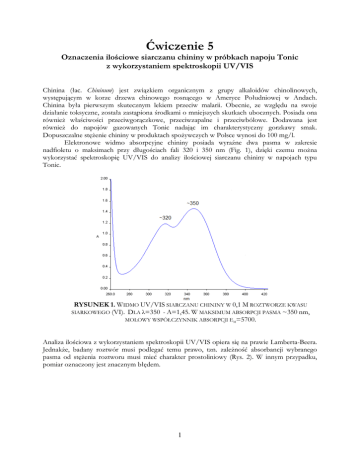 Ćwiczenie 5 Oznaczenia ilościowe siarczanu chininy w próbkach napoju Tonic z wykorzystaniem spektroskopii UV/VIS Chinina (łac. Chininum) jest związkiem organicznym z grupy alkaloidów chinolinowych, występującym w korze drzewa chinowego rosnącego w Ameryce Południowej w Andach. Chinina była pierwszym skutecznym lekiem przeciw malarii. Obecnie, ze względu na swoje działanie toksyczne, została zastąpiona środkami o mniejszych skutkach ubocznych. Posiada ona również właściwości przeciwgorączkowe, przeciwzapalne i przeciwbólowe. Dodawana jest również do napojów gazowanych Tonic nadając im charakterystyczny gorzkawy smak. Dopuszczalne stężenie chininy w produktach spożywczych w Polsce wynosi do 100 mg/l. Elektronowe widmo absorpcyjne chininy posiada wyraźne dwa pasma w zakresie nadfioletu o maksimach przy długościach fali 320 i 350 nm (Fig. 1), dzięki czemu można wykorzystać spektroskopię UV/VIS do analizy ilościowej siarczanu chininy w napojach typu Tonic. RYSUNEK 1. WIDMO UV/VIS SIARCZANU CHININY W 0,1 M ROZTWORZE KWASU SIARKOWEGO (VI). DLA λ=350 - A=1,45. W MAKSIMUM ABSORPCJI PASMA ~350 nm, MOLOWY WSPÓŁCZYNNIK ABSORPCJI ΕM=5700. Analiza ilościowa z wykorzystaniem spektroskopii UV/VIS opiera się na prawie Lamberta-Beera. Jednakże, badany roztwór musi podlegać temu prawo, tzn. zależność absorbancji wybranego pasma od stężenia roztworu musi mieć charakter prostoliniowy (Rys. 2). W innym przypadku, pomiar oznaczony jest znacznym błędem. 1 RYSUNEK 2. ZALEŻNOŚĆ ABSORBANCJI OD STĘŻENIA. Ilościowe oznaczenie badanego składnika wykonuje się najczęściej dwiema metodami: metodą krzywej wzorcowej lub metodą algebraiczną. W obu przypadkach wybieramy jedno pasmo absorpcyjne dla którego wyznacza się zależność absorbancji od stężenia. Metoda krzywej wzorcowej polega na ustaleniu zależności pomiędzy stężeniem oznaczanej substancji w roztworze a absorbancją wybranego pasma analitycznego (c=f(A)). W tym celu sporządza się serię roztworów wzorcowych oznaczanej substancji o różnych znanych stężeniach. Dla każdego roztworu wykonuje się pomiar widma UV/VIS i wyznacza maksimum absorpcji wybranego pasma. Na podstawie uzyskanych wyników wykreśla się krzywą wzorcową c=f(A). Metoda algebraiczną stosuje się często w przypadku pojedynczych oznaczeń. Stężenie oznaczanego składnika oblicza się bezpośrednio ze wzoru: c gdzie: A – absorbancja ε – molowy współczynnik ekstynkcji l – grubość warstwy absorbującej A l W celu uzyskania większej dokładności pomiaru wartości molowego współczynnika ekstynkcji wyznacza się jego wartość średnią mierząc absorbancję danego pasma analitycznego dla kilku roztworów wzorcowych. 2 Część doświadczalna Cel ćwiczenia: oznaczenie zawartości siarczanu chininy w wybranych próbkach napoju Tonic. Odczynniki: siarczan chininy, woda, próbki napoju Tonic. Plan ćwiczenia: 1. Wykonanie pomiaru widma UV/VIS kwaśnego roztworu siarczanu chininy – wyznaczenie maksimów absorpcji; 2. Wykonanie pomiarów absorbancji dla 4 roztworów siarczanu chininy o różnym stężeniu – wyznaczenie krzywej wzorcowej. 3. Oznaczenie zawartości siarczanu chininy w wybranych próbkach napoju Tonic. 3