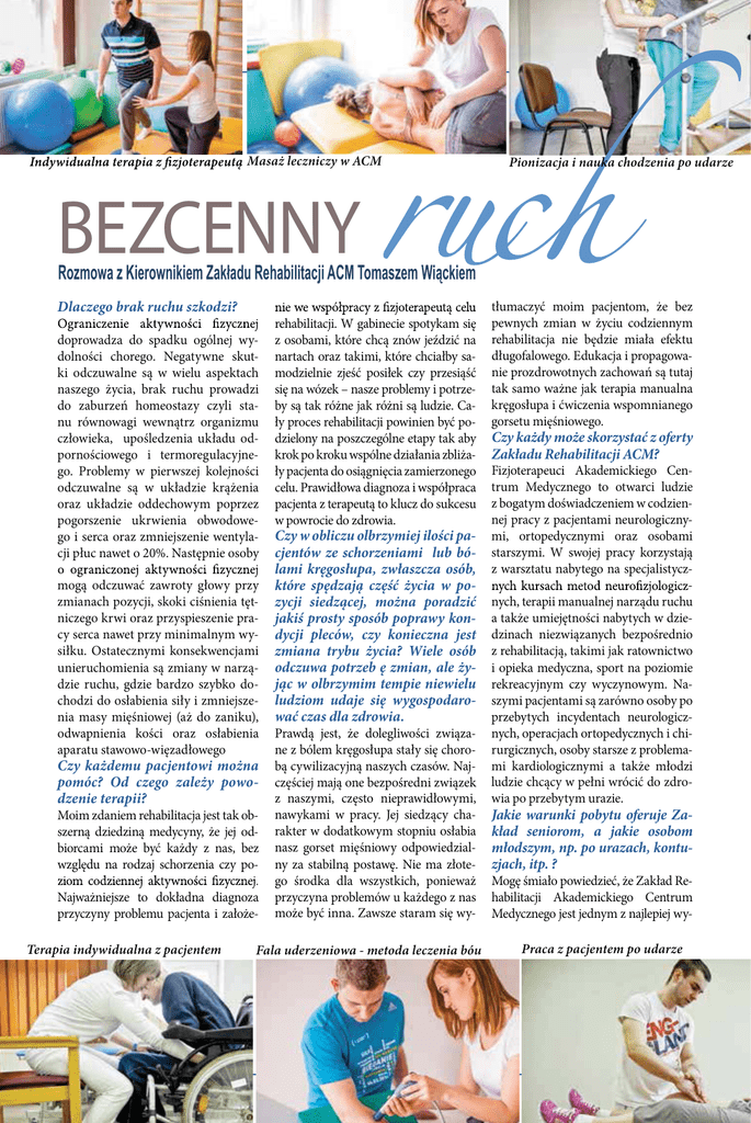 18 Masaż leczniczy w ACM Pionizacja i nauka chodzenia po udarze BEZCENNY 5R]PRZD].LHURZQLNLHP=DNâDGX5HKDELOLWDFML ACM Tomaszem WLĆFNLHP Dlaczego brak ruchu szkodzi? doprowadza do spadku ogólnej wydolności chorego. Negatywne skutki odczuwalne są w wielu aspektach naszego życia, brak ruchu prowadzi do zaburzeń homeostazy czyli stanu równowagi wewnątrz organizmu człowieka, upośledzenia układu odpornościowego i termoregulacyjnego. Problemy w pierwszej kolejności odczuwalne są w układzie krążenia oraz układzie oddechowym poprzez pogorszenie ukrwienia obwodowego i serca oraz zmniejszenie wentylacji płuc nawet o 20%. Następnie osoby mogą odczuwać zawroty głowy przy zmianach pozycji, skoki ciśnienia tętniczego krwi oraz przyspieszenie pracy serca nawet przy minimalnym wysiłku. Ostatecznymi konsekwencjami unieruchomienia są zmiany w narządzie ruchu, gdzie bardzo szybko dochodzi do osłabienia siły i zmniejszenia masy mięśniowej (aż do zaniku), odwapnienia kości oraz osłabienia aparatu stawowo-więzadłowego Czy każdemu pacjentowi można pomóc? Od czego zależy powodzenie terapii? Moim zdaniem rehabilitacja jest tak obszerną dziedziną medycyny, że jej odbiorcami może być każdy z nas, bez względu na rodzaj schorzenia czy poNajważniejsze to dokładna diagnoza przyczyny problemu pacjenta i założeTerapia indywidualna z pacjentem S MExpress rehabilitacji. W gabinecie spotykam się z osobami, które chcą znów jeździć na nartach oraz takimi, które chciałby samodzielnie zjeść posiłek czy przesiąść się na wózek – nasze problemy i potrzeby są tak różne jak różni są ludzie. Cały proces rehabilitacji powinien być podzielony na poszczególne etapy tak aby krok po kroku wspólne działania zbliżały pacjenta do osiągnięcia zamierzonego celu. Prawidłowa diagnoza i współpraca pacjenta z terapeutą to klucz do sukcesu w powrocie do zdrowia. Czy w obliczu olbrzymiej ilości pacjentów ze schorzeniami lub bólami kręgosłupa, zwłaszcza osób, które spędzają część życia w pozycji siedzącej, można poradzić jakiś prosty sposób poprawy kondycji pleców, czy konieczna jest zmiana trybu życia? Wiele osób odczuwa potrzeb ę zmian, ale żyjąc w olbrzymim tempie niewielu ludziom udaje się wygospodarować czas dla zdrowia. Prawdą jest, że dolegliwości związane z bólem kręgosłupa stały się chorobą cywilizacyjną naszych czasów. Najczęściej mają one bezpośredni związek z naszymi, często nieprawidłowymi, nawykami w pracy. Jej siedzący charakter w dodatkowym stopniu osłabia nasz gorset mięśniowy odpowiedzialny za stabilną postawę. Nie ma złotego środka dla wszystkich, ponieważ przyczyna problemów u każdego z nas może być inna. Zawsze staram się wy- Fala uderzeniowa - metoda leczenia bóu tłumaczyć moim pacjentom, że bez pewnych zmian w życiu codziennym rehabilitacja nie będzie miała efektu długofalowego. Edukacja i propagowanie prozdrowotnych zachowań są tutaj tak samo ważne jak terapia manualna kręgosłupa i ćwiczenia wspomnianego gorsetu mięśniowego. Czy każdy może skorzystać z oferty Zakładu Rehabilitacji ACM? Fizjoterapeuci Akademickiego Centrum Medycznego to otwarci ludzie z bogatym doświadczeniem w codziennej pracy z pacjentami neurologicznymi, ortopedycznymi oraz osobami starszymi. W swojej pracy korzystają z warsztatu nabytego na specjalistycznych, terapii manualnej narządu ruchu a także umiejętności nabytych w dziedzinach niezwiązanych bezpośrednio z rehabilitacją, takimi jak ratownictwo i opieka medyczna, sport na poziomie rekreacyjnym czy wyczynowym. Naszymi pacjentami są zarówno osoby po przebytych incydentach neurologicznych, operacjach ortopedycznych i chirurgicznych, osoby starsze z problemami kardiologicznymi a także młodzi ludzie chcący w pełni wrócić do zdrowia po przebytym urazie. Jakie warunki pobytu oferuje Zakład seniorom, a jakie osobom młodszym, np. po urazach, kontuzjach, itp. ? Mogę śmiało powiedzieć, że Zakład Rehabilitacji Akademickiego Centrum Medycznego jest jednym z najlepiej wyPraca z pacjentem po udarze www.ptsr.org.pl 19 posażonych tego typu miejsc w okolicy. W naszej ofercie posiadamy indywidualnie prowadzoną terapię ruchową z wykorzystaniem nowoczesnego sprzętu rehabilitacyjnego oraz aparatów do terapia, fala uderzeniowa czy ultradźwięki, często stosowanych po urazach narządu ruchu. Na salach rehabilitacyjnych możemy prowadzić reedukację chodu, poprawiać równowagę a w indywidualnych gabinetach zastosować bezpośrednie techniki manualne. Jesteśmy przygotowani aby zaopatrzyć pacjenta w sprzęt ortopedyczny na czas terapii i indywidualnego użytku. Najbardziej wymagający pacjenci znajdą u nas nawet trampolinę równoważną, jeśli tylko zajdzie taka potrzeba - Czy prawdą jest, że praca i terapia w grupie przynosi lepsze efekty niż praca indywidualna? Od czego to zależy? Osobiście nie jestem zwolennikiem pracy grupowej z pacjentami, tak często stosowanej w szpitalnych zakładach rehabilitacji. Każdy wymaga indywidualnego podejścia do jego problemu, asekuracji podczas serii skomplikowanych ćwiczeń. Zarówno terapeuta jak i pacjent musi być skupiony na zadaniu, jeśli chcemy osiągnąć zamierzony cel. Oczywiście przychodzi moment, że ćwiczenie może być wykonywane samodzielnie, do tego jednak potrzebne jest zaufanie i wiara we własne możliwości, budowane podczas pracy indy- Jakim zapleczem sprzętowym dysponuje Pana zespół? Nasz Zakład Rehabilitacji przygotowany jest do wykonywania wszelkich zabiegów kinezyterapeutycznych, od najprostszych w odciążeniu po najbardziej skomplikowane w chodzie i równowadze. Gdy zachodzi potrzeba schodzimy z pacjentem na materac, innym razem na platformy przypominające schody. Po zakończeniu indywidualnej terapii pacjenci korzystają ze sprzętu wzmacniającego aparat mięśniowy jak ergoPraca indywidualna z pacjentem - kinezyterapia Infolinia PTSR - 22 